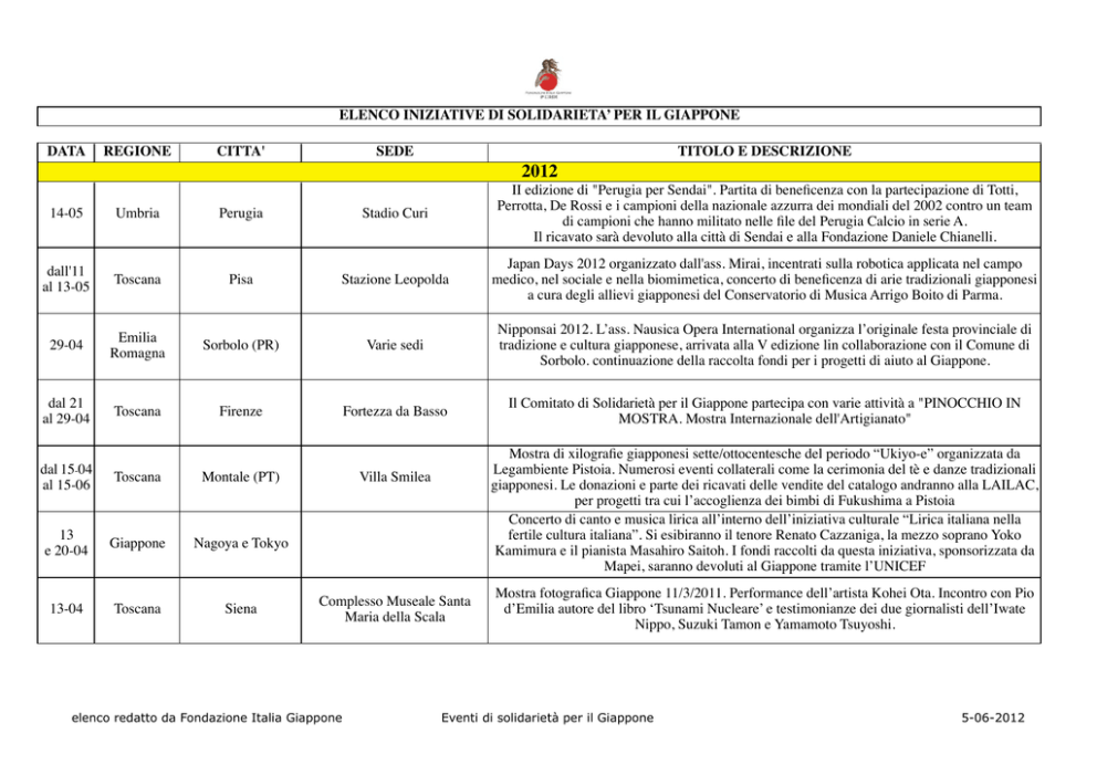 ELENCO INIZIATIVE DI SOLIDARIETA’ PER IL GIAPPONE DATA REGIONE CITTA' SEDE TITOLO E DESCRIZIONE 2012 14-05 Umbria Perugia Stadio Curi II edizione di "Perugia per Sendai". Partita di beneficenza con la partecipazione di Totti, Perrotta, De Rossi e i campioni della nazionale azzurra dei mondiali del 2002 contro un team di campioni che hanno militato nelle file del Perugia Calcio in serie A. Il ricavato sarà devoluto alla città di Sendai e alla Fondazione Daniele Chianelli. dall'11 al 13-05 Toscana Pisa Stazione Leopolda Japan Days 2012 organizzato dall'ass. Mirai, incentrati sulla robotica applicata nel campo medico, nel sociale e nella biomimetica, concerto di beneficenza di arie tradizionali giapponesi a cura degli allievi giapponesi del Conservatorio di Musica Arrigo Boito di Parma. 29-04 Emilia Romagna Sorbolo (PR) Varie sedi Nipponsai 2012. L’ass. Nausica Opera International organizza l’originale festa provinciale di tradizione e cultura giapponese, arrivata alla V edizione lin collaborazione con il Comune di Sorbolo. continuazione della raccolta fondi per i progetti di aiuto al Giappone. dal 21 al 29-04 Toscana Firenze Fortezza da Basso Il Comitato di Solidarietà per il Giappone partecipa con varie attività a "PINOCCHIO IN MOSTRA. Mostra Internazionale dell'Artigianato" dal 15-04 al 15-06 Toscana Montale (PT) 13 e 20-04 Giappone Nagoya e Tokyo 13-04 Toscana Siena Mostra di xilografie giapponesi sette/ottocentesche del periodo “Ukiyo-e” organizzata da Legambiente Pistoia. Numerosi eventi collaterali come la cerimonia del tè e danze tradizionali giapponesi. Le donazioni e parte dei ricavati delle vendite del catalogo andranno alla LAILAC, per progetti tra cui l’accoglienza dei bimbi di Fukushima a Pistoia Concerto di canto e musica lirica all’interno dell’iniziativa culturale “Lirica italiana nella fertile cultura italiana”. Si esibiranno il tenore Renato Cazzaniga, la mezzo soprano Yoko Kamimura e il pianista Masahiro Saitoh. I fondi raccolti da questa iniziativa, sponsorizzata da Mapei, saranno devoluti al Giappone tramite l’UNICEF Villa Smilea Complesso Museale Santa Maria della Scala elenco redatto da Fondazione Italia Giappone Mostra fotografica Giappone 11/3/2011. Performance dell’artista Kohei Ota. Incontro con Pio d’Emilia autore del libro ‘Tsunami Nucleare’ e testimonianze dei due giornalisti dell’Iwate Nippo, Suzuki Tamon e Yamamoto Tsuyoshi. Eventi di solidarietà per il Giappone 5-06-2012 30-03 Lombardia Lecco 26-03 Friuli V.G. Dolegna del Collio (GO) Azienda vinicola Venica Conclusione del progetto "Sulla Strada del Cuore, insieme 2001 per il Giappone" lanciato e promosso dall'azienda Venica&Venica con consegna di un assegno di 51.000 euro al Console generale del Giappone destinato ad aiutare uno dei centri più danneggiati dal terremoto 25-03 Campania Sorrento (NA) Basilica di Sant'Antonio Santa Messa in ricordo delle vittime dello tsunami in occasione della IV edizione del Festival di Cultura Giappone. 24 e 25-03 Marche Montegiorgio (FM) Palazzetto dello sport Marzo in Kimono 2012. kermesse di arte, cultura e tradizioni dell’antico Giappone organizzata dall’ Accademia Di Arti Orientali A.D.A.O. ed esibizione del gruppo di percussioni TAIKO WA DO in ricordo delle vittime di Fukushima dal 23 al 25-03 Toscana Firenze Sala Ex-Leopoldine Hinamatsuri 2012. L'associazione culturale giapponese IROHA organizza la IV edizione del festival Il Giappone sei tu. Tema di quest'anno è la cucina tradizionale giapponese. Buffet di solidarietà e numerose iniziative. dal 20 al 24-03 Emilia Romagna Bologna Museo Civico Medievale Mostra "Di mano in mano" di cinquantatré illustratori e artisti provenienti da Giappone, Repubblica Slovacca, Belgio, Olanda, Italia ed Usa - un network di amici nato attorno ai due illustratori organizzatori Nana Furiya e Peter Uchnár. Riflessioni sul futuro dei bambini dopo la catastrofe di Fukushima. 20-03 Lombardia Cremona Società Filodrammatica Cremonese Serata di solidarietà organizzata come nel 2011 dalla Società Filodrammatica Cremonese. Il concerto quest’anno l’evento è abbinato alla giornata internazionale della poesia. Esordio del quintetto d’archi “Cremona Ensemble”. 13-03 Lombardia Milano Consolato Generale del Giappone Ricevimento per commemorare il primo anniversario del Grande Terremoto. Esposti pannelli fotografici che mettevano a confronto il momento dell’accadimento e quello successivo Ristorante Pingusto Wok JAPANESE NIGHT. Serata di beneficenza organizzata da Rotaract Firenze in collaborazione con Lailac e Interact Club. Cerimonia del te con la Maestra Shimura Senkei da Fukushima, Cena e intrattenimento con danza tradizionale giapponese nihon buyo a cura della Maestra Hiromi e Hiroe e Presentazione del libro Il Pianto dei Ciliegi di Francesca Bani 13-03 Toscana Firenze Teatro Cenacolo Francescano Tsunami Taiko. Concerto di beneficenza organizzato dall'Associazione Progetto Taiko di Lecco elenco redatto da Fondazione Italia Giappone Eventi di solidarietà per il Giappone 5-06-2012 12-03 Piemonte Asti Aula Magna del polo Astiss Incontro “Giappone un racconto per immagini” a cura di Caral Forno con letture di Gabriella Amerio in segno di amicizia verso gli studiosi di alfieri in Giappone. Sono esposti i disegni dei bambini di Tamura, Prefettura di Fukushima, dove, grazie anche alla generosità del Lions Club Asti Host, è stata realizzata una Biblioteca per i più piccoli. 12-03 Veneto Venezia Università Ca' Foscari Cà Foscari per il Giappone 2012. Torna l'iniziativa di solidarietà organizzata da studenti e docenti dell'Università Cà Foscari di Venezia, Dip. di Studi sull'Asia e Africa Mediterranea. 11-03 Emilia Romagna Ferrara Libreria Melbook Dalle 10 alle 17 gli studenti giapponesi residenti in città organizzano un banchetto nel quale doneranno ideogrammi e caricature in cambio di un’offerta. L’idea è venuta a Hyroki Yamada, giovane architetto, in città per frequentare u