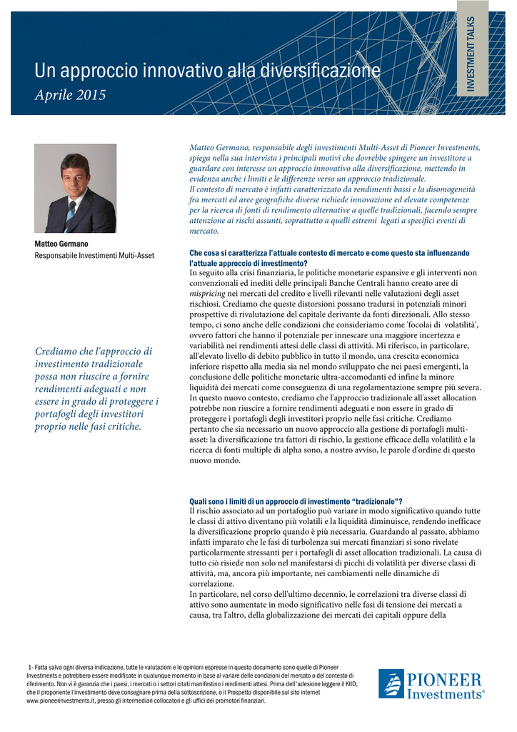 Aprile 2015 INVESTMENT TALKS Un approccio innovativo alla diversificazione Matteo Germano, responsabile degli investimenti Multi-Asset di Pioneer Investments, spiega nella sua intervista i principali motivi che dovrebbe spingere un investitore a guardare con interesse un approccio innovativo alla diversificazione, mettendo in evidenza anche i limiti e le differenze verso un approccio tradizionale. Il contesto di mercato è infatti caratterizzato da rendimenti bassi e la disomogeneità fra mercati ed aree geografiche diverse richiede innovazione ed elevate competenze per la ricerca di fonti di rendimento alternative a quelle tradizionali, facendo sempre attenzione ai rischi assunti, soprattutto a quelli estremi legati a specifici eventi di mercato. Matteo Germano Responsabile Investimenti Multi-Asset Crediamo che l'approccio di investimento tradizionale possa non riuscire a fornire rendimenti adeguati e non essere in grado di proteggere i portafogli degli investitori proprio nelle fasi critiche. Che cosa si caratterizza l’attuale contesto di mercato e come questo sta influenzando l’attuale approccio di investimento? In seguito alla crisi finanziaria, le politiche monetarie espansive e gli interventi non convenzionali ed inediti delle principali Banche Centrali hanno creato aree di mispricing nei mercati del credito e livelli rilevanti nelle valutazioni degli asset rischiosi. Crediamo che queste distorsioni possano tradursi in potenziali minori prospettive di rivalutazione del capitale derivante da fonti direzionali. Allo stesso tempo, ci sono anche delle condizioni che consideriamo come 'focolai di volatilità', ovvero fattori che hanno il potenziale per innescare una maggiore incertezza e variabilità nei rendimenti attesi delle classi di attività. Mi riferisco, in particolare, all'elevato livello di debito pubblico in tutto il mondo, una crescita economica inferiore rispetto alla media sia nel mondo sviluppato che nei paesi emergenti, la conclusione delle politiche monetarie ultra-accomodanti ed infine la minore liquidità dei mercati come conseguenza di una regolamentazione sempre più severa. In questo nuovo contesto, crediamo che l'approccio tradizionale all'asset allocation potrebbe non riuscire a fornire rendimenti adeguati e non essere in grado di proteggere i portafogli degli investitori proprio nelle fasi critiche. Crediamo pertanto che sia necessario un nuovo approccio alla gestione di portafogli multiasset: la diversificazione tra fattori di rischio, la gestione efficace della volatilità e la ricerca di fonti multiple di alpha sono, a nostro avviso, le parole d'ordine di questo nuovo mondo. Quali sono i limiti di un approccio di investimento “tradizionale”? Il rischio associato ad un portafoglio può variare in modo significativo quando tutte le classi di attivo diventano più volatili e la liquidità diminuisce, rendendo inefficace la diversificazione proprio quando è più necessaria. Guardando al passato, abbiamo infatti imparato che le fasi di turbolenza sui mercati finanziari si sono rivelate particolarmente stressanti per i portafogli di asset allocation tradizionali. La causa di tutto ciò risiede non solo nel manifestarsi di picchi di volatilità per diverse classi di attività, ma, ancora più importante, nei cambiamenti nelle dinamiche di correlazione. In particolare, nel corso dell'ultimo decennio, le correlazioni tra diverse classi di attivo sono aumentate in modo significativo nelle fasi di tensione dei mercati a causa, tra l'altro, della globalizzazione dei mercati dei capitali oppure della 1- Fatta salva ogni diversa indicazione, tutte le valutazioni e le opinioni espresse in questo documento sono quelle di Pioneer Investments e potrebbero essere modificate in qualunque momento in base al variare delle condizioni del mercato o del contesto di riferimento. Non vi è garanzia che i paesi, i mercati o i settori citati manifestino i rendimenti attesi. Prima dell'adesione leggere il KIID, che il proponente l’investimento deve consegnare prima della sottoscrizione, o il Prospetto disponibile sul sito internet www.pioneerinvestments.it, presso gli intermediari collocatori e gli uffici dei promotori finanziari. Un approccio innovativo alla diversificazione I Aprile 2015 diffusione del trading quantitativo (algoritmico). Crediamo che queste dinamiche mutevoli potrebbero portare a drawdown (perdite) consistenti in un portafoglio bilanciato tradizionale, cosa che è effettivamente successa durante la Grande Crisi Finanziaria del 2008. La diversificazione del portafoglio dovrebbe concentrarsi sulla ripartizione tra le diverse fonti di rischio, invece di essere basata su una semplice allocazione tra diverse classi di attività. Le divergenze possono creare significative opportunità di generare puro Alpha. Come è possibile costruire oggi un portafoglio efficiente: ben diversificato e consapevole dei rischi assunti? Credo che la risposta a questa domanda si basi su 3 fattori: • Porre la gestione del rischio al centro del processo • Identificare i fattori di rischio • Diversificare tra fattori di rischio La diversificazione del portafoglio dovrebbe concentrarsi sulla ripartizione tra le diverse fonti di rischio, invece di essere basata su una semplice allocazione tra diverse classi di attività. Una volta identificati i principali fattori di rischio, sarà importante costruire dei portafogli ben diversificati tra questi rischi, e di monitorare costantemente l'esposizione complessiva al rischio. In tal modo, crediamo che sia importante analizzare quali fattori di rischio impattino maggiormente il portafoglio e quali dinamiche possano influenzarli in futuro. Questa analisi richiede un quadro chiaro dello scenario macroeconomico e delle condizioni dei mercati finanziari. Che cosa bisogna fare per migliorare la performance del proprio portafoglio in un contesto di rendimenti attesi molto bassi? Per rispondere a questa domanda, dobbiamo considerare entrambe le co