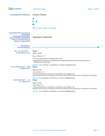 Curriculum Vitae INFORMAZIONI PERSONALI Grazia Celona Grazia Celona Sesso | Data di nascita | Nazionalità POSIZIONE PER LA QUALE SI CONCORRE POSIZIONE RICOPERTA OCCUPAZIONE DESIDERATA TITOLO DI STUDIO PER LA QUALE SI CONCORRE Operatore Sartoriale ESPERIENZA PROFESSIONALE Dal 25 Novembre al 14 Dicembre 2013 Stage Taglio e cucito Via san Rocco n° 5 ▪ Scucire, esercitazione a macchina da cucire ▪ Approntare gli strumenti e le attrezzature necessari alle diverse fasi di lavorazione per la realizzazione di capi base Attività o settore Sartoria e confezione su misura di abbigliamento Dal 05 Febbraio 2014 – Al 28 Febbraio 2014 Stage Taglio e cucito Via san Rocco n° 5 ▪ Scucire lavorazione a macchina e lavorazione con la tagli e cuci Approntare gli strumenti e le attrezzature necessari alle diverse fasi di lavorazione per la realizzazione di capi base Attività o settore Sartoria e confezione su misura di abbigliamento Dal 03 Marzo 2014 – Al 21 Marzo 2014 Stage Taglio e cucito Via san Rocco n° 5 ▪ Scucire lavorazione a macchina e lavorazione con la tagli e cuci Approntare gli strumenti e le attrezzature necessari alle diverse fasi di lavorazione per la realizzazione di capi base Attività o settore Sartoria e confezione su misura di abbigliamento © Unione europea, 2002-2013 | http://europass.cedefop.europa.eu Pagina 1 / 3 Curriculum Vitae Grazia Celona ISTRUZIONE E FORMAZIONE Settembre 2011- giugno 2015 Qualifica regionale operatore dell’abbigliamento - Sartoria IIII Livello europeo I.P.I.A. I.I.S. “V. Floriani” Via Bice Cremagnani,18 - 20871 Vimercate (MB) tel 039.60.80.647 ▪ Laboratorio modellistica – confezione ▪ Tecnologie tessili ▪ Moda ▪ Disegno e storia del costume ▪ Italiano ▪ Inglese ▪ Matematica 07/04/2014 – 12/04/2014 40 ore Corso “Le professioni della moda e dello spettacolo orientamento alla formazione” ACOF – Cooperativa sociale Via Copernico, 3 - Milano ▪ Learning week 2013 – 2014 4 ore Corso sicurezza I.P.I.A. I.I.S. “V. Floriani” Via Bice Cremagnani,18 - 20871 Vimercate (MB) tel 039.60.80.647 ▪ organizzazione del sistema aziendale della prevenzione e della protezione; ▪ diritti e doveri dei soggetti aziendali relativamente alla sicurezza; ▪ il sistema istituzionale e gli organi di vigilanza, controllo e assistenza; ▪ organizzazione della prevenzione e protezione: misure per affrontare i principali rischi nei luoghi di lavoro; ▪ fonti di rischio generali; ▪ scelta e impiego dei DPI. 16/12/2013 – 20/12/2013 40 ore Corso “La pagina della tendenza di una collezione moda pelle” ACOF – Cooperativa sociale Via Copernico, 3 - Milano ▪ Realizzazione di figurini ▪ Utilizzo Photoshop COMPETENZE PERSONALI Lingua madre Italiano Altre lingue Inglese COMPRENSIONE PARLATO PRODUZIONE SCRITTA Ascolto Lettura Interazione Produzione orale A2 A2 A2 A2 A2 Livelli: A1/2 Livello base - B1/2 Livello intermedio - C1/2 Livello avanzato Quadro Comune Europeo di Riferimento delle Lingue Competenze comunicative ▪ Possiedo buone competenze comunicative acquisite durante la mia esperienza lavorativa durante la quale mi ritovavo spesso a contatto con i clienti. © Unione europea, 2002-2013 | http://europass.cedefop.europa.eu Pagina 2 / 3 Curriculum Vitae Grazia Celona Competenze professionali ▪ Operare in sicurezza e nel rispetto delle norme di igiene e di salvaguardia ambientale, identificando e prevenendo situazioni di rischio per sé, per altri e per l'ambiente; ▪ Operare secondo i criteri di qualità stabiliti dal protocollo aziendale, riconoscendo e interpretando le esigenze del cliente/utente interno/esterno alla struttura/funzione organizzativa ▪ Approntare strumenti, attrezzature e macchinari necessari alle diverse fasi di lavorazione sulla base della tipologia di materiali da impiegare, delle indicazioni/procedure previste, del risultato atteso ▪ Elaborare tagli base, partendo da unità di misura prestabilite ▪ Realizzare di capi d’abbigliamento in taglia, nel rispetto delle fasi e dei tempi di lavorazione ▪ Rappresentare figurini di capi d’abbigliamento nelle loro linee di base proporzionati nei particolari esecutivi evidenziando linea, volume e forma Competenze informatiche ▪ buona padronanza degli strumenti Microsoft Office; ▪ conoscenze base di photoshop Patente di guida Dati personali / Autorizzo il trattamento dei miei dati personali ai sensi del Decreto Legislativo 30 giugno 2003, n. 196 "Codice in materia di protezione dei dati personali”. © Unione europea, 2002-2013 | http://europass.cedefop.europa.eu Pagina 3 / 3