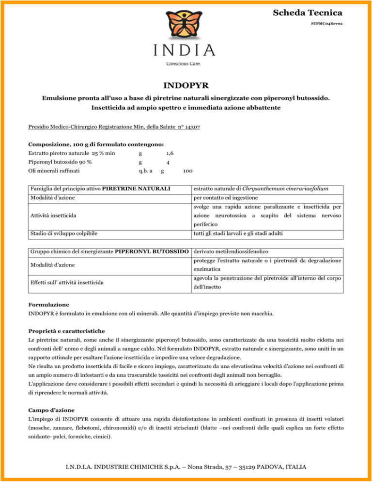 Scheda Tecnica STPMC04Rev02 INDOPYR Emulsione pronta all’uso a base di piretrine naturali sinergizzate con piperonyl butossido. Insetticida ad ampio spettro e immediata azione abbattente Presidio Medico-Chirurgico Registrazione Min. della Salute n° 14307 Composizione, 100 g di formulato contengono: Estratto piretro naturale 25 % min g 1,6 Piperonyl butossido 90 % g 4 Oli minerali raffinati q.b. a g 100 Famiglia del principio attivo PIRETRINE NATURALI estratto naturale di Chrysanthemum cinerariaefolium Modalità d’azione per contatto ed ingestione svolge una rapida azione paralizzante e insetticida per Attività insetticida azione neurotossica a scapito del sistema nervoso periferico Stadio di sviluppo colpibile tutti gli stadi larvali e gli stadi adulti Gruppo chimico del sinergizzante PIPERONYL BUTOSSIDO derivato metilendiossifenolico Modalità d’azione Effetti sull’ attività insetticida protegge l’estratto naturale o i piretroidi da degradazione enzimatica agevola la penetrazione del piretroide all’interno del corpo dell’insetto Formulazione INDOPYR è formulato in emulsione con oli minerali. Alle quantità d’impiego previste non macchia. Proprietà e caratteristiche Le piretrine naturali, come anche il sinergizzante piperonyl butossido, sono caratterizzate da una tossicità molto ridotta nei confronti dell’ uomo e degli animali a sangue caldo. Nel formulato INDOPYR, estratto naturale e sinergizzante, sono uniti in un rapporto ottimale per esaltare l’azione insetticida e impedire una veloce degradazione. Ne risulta un prodotto insetticida di facile e sicuro impiego, caratterizzato da una elevatissima velocità d’azione nei confronti di un ampio numero di infestanti e da una trascurabile tossicità nei confronti degli animali non bersaglio. L’applicazione deve considerare i possibili effetti secondari e quindi la necessità di arieggiare i locali dopo l’applicazione prima di riprendere le normali attività. Campo d’azione L’impiego di INDOPYR consente di attuare una rapida disinfestazione in ambienti confinati in presenza di insetti volatori (mosche, zanzare, flebotomi, chironomidi) e/o di insetti striscianti (blatte –nei confronti delle quali esplica un forte effetto snidante- pulci, formiche, cimici). I.N.D.I.A. INDUSTRIE CHIMICHE S.p.A. – Nona Strada, 57 – 35129 PADOVA, ITALIA Scheda Tecnica STPMC04Rev02 INDOPYR è idoneo alla disinfestazione di quegli ambiti, produttivi, ricreativi, di soggiorno, in cui non è desiderata una elevata persistenza d’azione (stabilimenti dell’industria alimentare nei momenti o luoghi in cui non vi è contatto diretto con gli alimenti, reparti ospedalieri, aule scolastiche, mense, abitazioni, ambienti di comunità in genere, interno di allevamenti zootecnici). Dosi e modalità di impiego INDOPYR si utilizza tal quale, senza aggiunta di altre sostanze, in quantità variabili in funzione degli infestanti e delle attrezzature d’impiego. Nella tabella seguente si schematizzano i possibili impieghi dedotti dalla bibliografia e dalla pratica d’intervento: Infestante Quantità da impiegarsi in relazione allo sviluppo dei locali Insetti volatori: zanzare, chironomidi, pappataci, mosche,.. Insetti striscianti: blatte, formiche, pulci, … 0,5 litri di INDOPYR ogni 3000 m cubi, finemente nebulizzato 1 litro di INDOPYR ogni 75 m quadri ca, applicato con pompe tarate per far giungere il formulato negli anfratti e fessure Classificazione del formulato Per tali informazioni si rinvia alla scheda di sicurezza. Avvertenze Per un corretto uso del prodotto attenersi scrupolosamente a quanto riportato in etichetta. Leggere e conservare la scheda di sicurezza. Non contaminare persone ed animali, cibi e bevande e recipienti ad essi destinati. Il produttore non assume responsabilità alcuna nei confronti di terzi, chi utilizza il prodotto è responsabile per eventuali danni derivanti dal suo impiego. Confezione INDOPYR è disponibile in tanica da 10 litri Nota importante: vista l’impossibilità di determinare la compatibilità di una soluzione insetticida con tutti i possibili materiali, prima di trattare qualsiasi superficie è necessario fare un prova su una zona limitata e poco visibile per accertarsi che non si formino macchie o aloni. I.N.D.I.A. declina ogni responsabilità in tal senso. Pubblicazione riservata alle seguenti categorie professionali : agronomi, disinfestatori, igienisti, medici, parassitologi, veterinari. I.N.D.I.A. INDUSTRIE CHIMICHE S.p.A. – Nona Strada, 57 – 35129 PADOVA, ITALIA