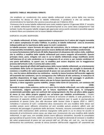 QUESITO: TABELLE MILLESIMALI ERRATE: -Ho ereditato un condominio che aveva tabelle millesimali errate, prima della mia nomina l'assemblea ha deciso di rifare le tabelle millesimali, il problema è che sul verbale l'ex amministratore ha riportato che saranno esecutive già con il bilancio 2012. Premesso che le nuove tabelle millesimali sono state redatte il giorno 13 gennaio 2014. E' corretto o le tabelle millesimali rifatte non sono retroattive?quindi io ora come devo comportarmi? Dal verbale risulta che queste tabelle vengano già approvate senza averle visionate è possibile oppure io dovrò rifare una votazione con le nuove tabelle millesimali? ESPERTO ANAPIC RISPONDE: " Le tabelle millesimali, di fatto, rappresentano la proporzione tra il valore del singolo immobile ed il valore complessivo di tutto l'edificio. In pratica, le tabelle millesimali sono lo strumento indispensabile per la ripartizione delle spese tra tutti i condomini. Le tabelle possono essere formate ab orgine dal costruttore, che le richiama nei singoli atti di compravendita immobiliare, oppure possono essere deliberate dall'assemblea condominiale. La nuova formulazione dell'articolo 69 delle disposizioni di attuazione del codice civile, stabilisce che la rettifica o modifica delle tabelle millesimali può essere eseguita all'unanimità. Questo principio viene, però, mitigato nel caso in cui la tabella millesimale venga modificata anche nell'interesse di un solo condomino se è conseguneza di un errore o, per mutate condizioni di una parte dell'edificio. In questi casi, la modifica può essere disposta con la maggioranza prevista dall'articolo 1136, 3 comma del codice civile. Per quanto riguarda gli effetti dell'applicazione delle nuove tabelle millesimali, un orientamento consolidato della Corte di Cassazione ha stabilito che la sentenza che accoglie la domanda di revisione o modifica dei valori proporzionali di piano nei casi previsti dall'art. 69 disp. att. cod. civ., non ha natura dichiarativa ma costitutiva, avendo la stessa funzione dell'accordo raggiunto all'unanimità dai condomini, con la conseguenza che l'efficacia di tale sentenza, in mancanza di specifica disposizione di legge contraria, inizia a decorrere solo dal passaggio in giudicato. Quindi, le nuove tabelle potrebbe valere solo per le future ripartizioni delle spese. Tuttavia, si deve segnalare quanto stabilito, sempre dalla Corte di Cassazione, con sentenza del 10 marzo 2011, n. 6590. Secondo la sopra citata sentenza, anche se è vero che le tabelle millesimali, una volta approvate o revisionate, valgono solamente per le future ripartizione delle spese, la compagine condominiale potrebbe agire nei confronti del comproprietario che fino ad allora abbia pagato di meno (o non abbia proprio pagato) con un’azione per indebito arricchimento. I Giudici affermano che: "pur essendo possibile una richiesta dì revisione di tabelle, in sede giudiziaria, in mancanza di apposita delibera dell' assemblea dei condomini (per la quale la giurisprudenza prevalente di questa Corte, fino alla decisione delle Sezioni Unite 9 agosto 2010 n. 18477, richiedeva il consenso di tutti i condomini) deve riconoscersi che una modifica delle stesse non avrebbe potuto avere efficacia retroattiva ed anzi avrebbe potuto produrre effetti solo dal momento del passaggio in giudicato della decisione. Pertanto, nessuna contraddizione è possibile ravvisare nella motivazione della sentenza impugnata nella parte in cui la stessa ha accolto la domanda di arricchimento senza causa, pur dopo aver riconosciuto che una modifica delle tabelle millesimali, in ogni caso, non avrebbe potuto avere efficacia retroattiva. Secondo la consolidata giurisprudenza di questa Corte, infatti, la sentenza che accoglie la domanda di revisione o modifica dei valori proporzionali di piano nei casi previsti dall' art. 69 disp. att. cod. civ., non ha natura dichiarativa ma costitutiva, avendo la stessa funzione dell'accordo raggiunto all' unanimità dai condomini, con la conseguenza che l'efficacia di tale sentenza, in mancanza di specifica disposizione di legge contraria, inizia a decorrere solo dal passaggio in giudicato (Cass. 8 settembre 1994 n. 7696). In base a tale considerazioni, non può condividersi la tesi sostenuta dal ricorrente, con il secondo motivo di ricorso, secondo la quale una volta esclusa la retroattività della modifica delle vecchie tabelle, i giudici di appello avrebbero dovuto rigettare la domanda dì arricchimento senza giusta causa."
