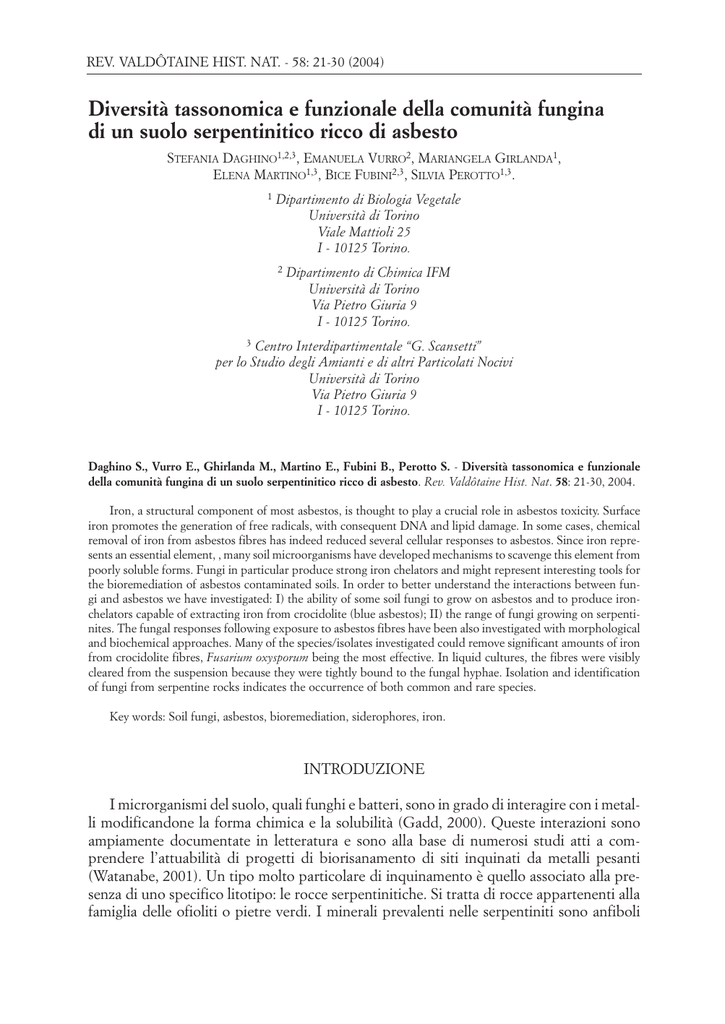 REV. VALDÔTAINE HIST. NAT. - 58: 21-30 (2004) Diversità tassonomica e funzionale della comunità fungina di un suolo serpentinitico ricco di asbesto STEFANIA DAGHINO1,2,3, EMANUELA VURRO2, MARIANGELA GIRLANDA1, ELENA MARTINO1,3, BICE FUBINI2,3, SILVIA PEROTTO1,3. 1 Dipartimento di Biologia Vegetale Università di Torino Viale Mattioli 25 I - 10125 Torino. 2 Dipartimento di Chimica IFM Università di Torino Via Pietro Giuria 9 I - 10125 Torino. 3 Centro Interdipartimentale “G. Scansetti” per lo Studio degli Amianti e di altri Particolati Nocivi Università di Torino Via Pietro Giuria 9 I - 10125 Torino. Daghino S., Vurro E., Ghirlanda M., Martino E., Fubini B., Perotto S. - Diversità tassonomica e funzionale della comunità fungina di un suolo serpentinitico ricco di asbesto. Rev. Valdôtaine Hist. Nat. 58: 21-30, 2004. Iron, a structural component of most asbestos, is thought to play a crucial role in asbestos toxicity. Surface iron promotes the generation of free radicals, with consequent DNA and lipid damage. In some cases, chemical removal of iron from asbestos fibres has indeed reduced several cellular responses to asbestos. Since iron represents an essential element, , many soil microorganisms have developed mechanisms to scavenge this element from poorly soluble forms. Fungi in particular produce strong iron chelators and might represent interesting tools for the bioremediation of asbestos contaminated soils. In order to better understand the interactions between fungi and asbestos we have investigated: I) the ability of some soil fungi to grow on asbestos and to produce ironchelators capable of extracting iron from crocidolite (blue asbestos); II) the range of fungi growing on serpentinites. The fungal responses following exposure to asbestos fibres have been also investigated with morphological and biochemical approaches. Many of the species/isolates investigated could remove significant amounts of iron from crocidolite fibres, Fusarium oxysporum being the most effective. In liquid cultures, the fibres were visibly cleared from the suspension because they were tightly bound to the fungal hyphae. Isolation and identification of fungi from serpentine rocks indicates the occurrence of both common and rare species. Key words: Soil fungi, asbestos, bioremediation, siderophores, iron. INTRODUZIONE I microrganismi del suolo, quali funghi e batteri, sono in grado di interagire con i metalli modificandone la forma chimica e la solubilità (Gadd, 2000). Queste interazioni sono ampiamente documentate in letteratura e sono alla base di numerosi studi atti a comprendere l’attuabilità di progetti di biorisanamento di siti inquinati da metalli pesanti (Watanabe, 2001). Un tipo molto particolare di inquinamento è quello associato alla presenza di uno specifico litotipo: le rocce serpentinitiche. Si tratta di rocce appartenenti alla famiglia delle ofioliti o pietre verdi. I minerali prevalenti nelle serpentiniti sono anfiboli 22 S. DAGHINO, E. VURRO, M. GIRLANDA, E. MARTINO, B. FUBINI, S. PEROTTO (ossia silicati idrati di Ca, Mg, Fe, Al) e serpentini (che sono silicati del Mg derivati dall’idratazione dell’olivina). Esempi di alcuni anfiboli sono amosite, crocidolite e tremolite, mentre il crisotilo è un serpentino. Entrambi cristallizzano in fibre rigide o incurvate, lunghe e sottili e sono indicati con il nome generico di asbesti. La forma fibrosa e la struttura cristallina conferiscono agli asbesti qualità tecnologiche per le quali sono stati ampiamente estratti ed utilizzati. Studi epidemiologici hanno però messo in luce le patologie causate dagli asbesti, che, qualora inalati, possono provocare l’insorgere di forme tumorali. Nonostante il divieto di estrazione e commercializzazione risalga al ’92, permangono tuttora molte fonti di dispersione delle fibre di asbesto nell’ambiente, sia di origine naturale (ad esempio gli affioramenti di rocce serpentinitiche) che di origine antropica. I meccanismi alla base della tossicità degli asbesti non sono ancora stati del tutto chiariti. Una delle cause individuate è la forma fibrosa, che può determinare uno stress meccanico a carico delle cellule bersaglio. Inoltre le caratteristiche strutturali di questi silicati ne determinano la bassa solubilità e quindi l’elevata biopersistenza nei tessuti, fattore che influisce sulla tossicità dei particolati. Alcuni studi hanno tuttavia dimostrato che il trattamento delle fibre di asbesto con chelanti è efficace nel sottrarre ferro dalla struttura di superficie, e se prolungato, anche dagli strati subsuperficiali. E’ anche noto dalla letteratura che la rimozione di ioni magnesio con acido ossalico contribuisce alla disgregazione delle fibre (Fubini, 1997). La solubilizzazione del ferro è particolarmente importante perché questo ione metallico, catalizzando reazioni chimiche quali la formazione di radicali organici e dell’ossigeno all’interfaccia tra fibra ed ambiente esterno, contribuisce a determinarne la reattività di superficie, che costituisce una terza concausa della tossicità degli asbesti (Park & Aust 1998). Il trattamento con chelanti risulta inibire la reattività di superficie delle fibre (Hardy & Aust, 1995) riducendo la produzione di radicali provocata dalle fibre stesse e, parallelamente, i danni ai lipidi e al DNA in vitro (Aust & Lund, 1990). La presenza di minerali asbestiformi in forma non compatta, principalmente a causa dell’intervento umano, ad esempio in aree soggette ad attività estrattiva, costituisce quindi un importante fattore di rischio per la salute. In questi casi l’asbesto non può essere rimosso, e attualmente non esistono sistemi di inattivazione in situ. Alcuni studi hanno dimostrato che i funghi hanno sviluppato dei meccanismi specifici di solubilizzazione ed assorbimento del ferro (Haselwandter, 1995), mediati da molecole chelanti di vario genere, che potrebbero essere sfruttati proprio allo scopo di mobilizzare questo ione dalla su