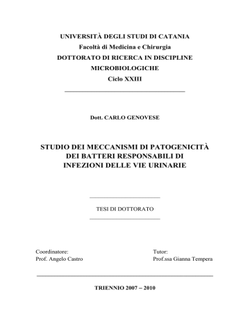 UNIVERSITÀ DEGLI STUDI DI CATANIA Facoltà di Medicina e Chirurgia DOTTORATO DI RICERCA IN DISCIPLINE MICROBIOLOGICHE Ciclo XXIII _________________________________________ Dott. CARLO GENOVESE STUDIO DEI MECCANISMI DI PATOGENICITÀ DEI BATTERI RESPONSABILI DI INFEZIONI DELLE VIE URINARIE ________________________ TESI DI DOTTORATO ________________________ Coordinatore: Prof. Angelo Castro Tutor: Prof.ssa Gianna Tempera ____________________________________________________________ TRIENNIO 2007 2010 INDICE INTRODUZIONE........................................................................................ 4 CAPITOLO 1 L’apparato urinario 1.1 Descrizione………………………………………………….......... 6 CAPITOLO 2 Infezioni delle Vie Urinarie (IVU) 2.1 Generalità…………………………………………………………. 10 2.2 Infezioni delle alte e basse vie urinarie……………………............ 11 2.3 Epidemiologia…………………………………………………….. 15 2.4 Eziologia………………………………………………………….. 18 CAPITOLO 3 Microrganismi responsabili delle Infezioni delle Vie Urinarie 3.1 Acinetobacter spp. ……………………………………………….. 20 3.2 Candida spp. ……………………………………………………... 21 3.3 Citrobacter spp. ………………………………………………….. 22 3.4 Enterococcus spp. ………………………………………………... 23 3.5 Escherichia coli…………………………………………………… 25 1 3.6 Klebsiella pneumoniae……………………………………………. 26 3.7 Proteus mirabilis………………………………………………….. 27 3.8 Providencia spp. ………………………………………………….. 28 3.9 Pseudomonas aeruginosa………………………………………… 29 3.10 Serratia spp. ……………………………………………………… 30 3.11 Staphylococcus aureus……………………………………………. 31 3.12 Stenotrophomonas maltophilia…………………………………… 32 CAPITOLO 4 Terapia antibiotica delle IVU e resistenze batteriche 4.1 Antibiotico-terapia………………………………………………... 35 4.2 Resistenze batteriche……………………………………………… 42 4.3 Meccanismi genetici e biochimici di resistenza batterica……….. 51 4.4 Considerazioni sulle resistenze batteriche……………………….. 59 CAPITOLO 5 Meccanismi di patogenicità dei batteri uropatogeni 5.1 Patogenicità batterica…………………………………………….. 63 5.2 Adesività batterica: generalità……………………………………. 70 5.3 Adesività nelle Infezioni delle Vie Urinarie ……………………... 72 5.4 Strutture batteriche e adesività…………………………………… 78 5.5 UPEC: sierotipi…………………………………………………… 92 5.6 UPEC: secrezione tossine………………………………………….94 5.7 ABU (Asymptomatic Bacteriuria E. coli)……………………….. 100 5.8 Escherichia coli e formazione del biofilm……………………….. 102 2 CAPITOLO 6 Alternative alla terapia antibiotica: “Vaccinium macrocarpon” 6.1 Generalità………………………………………………………..108 6.2 Ipotesi sul meccanismo d’azione……………………………….. 110 6.3 Profilo di sicurezza………………………………………………112 6.4 Attività clinica dei derivati………………………………………113 CAPITOLO 7 Parte Sperimentale 7.1 Scopo dello Studio……………………………………………… 116 7.2 Materiali e Metodi……………………………………………… 117 7.3 Risultati…………………………………………………………. 139 7.4 Conclusioni……………………………………………………... 143 BIBLIOGRAFIA Testo…………………………………………………………………. 146 Figure………………………………………………………………...196 Grafici……………………………………………………………….. 198 Tabelle………………………………………………………………. 199 3 INTRODUZIONE Malgrado la presenza di alcuni disturbi suggestivi, la definizione e, di conseguenza, la diagnosi di Infezione delle Vie Urinarie (IVU) risponde ad un criterio microbiologico: la presenza nelle urine di una carica batterica significativa di microrganismi patogeni. Nella genesi di un’infezione a carico delle vie urinarie, giocano un ruolo importante l’entità della carica batterica, la virulenza del microrganismo ed i meccanismi di difesa dell’ospite, mentre diverse anomalie congenite o acquisite delle vie urinarie influiscono non poco come determinanti di una possibile infezione. Le Infezioni delle Vie Urinarie rappresentano un capitolo importante nell’ambito della Medicina Generale, collocandosi tra le più importanti cause di morbilità, di visita ambulatoriale e di costi sanitari. Appare dunque evidente che l’ottimizzazione delle strategie di antibiotico-terapia per il trattamento di tale stato patologico resta una delle priorità del Medico di Medicina Generale, di concerto col lavoro dei Microbiologi. Il Medico di Medicina Generale viene a confrontarsi, più frequentemente, con infezioni delle basse vie urinarie non complicate, prevalentemente cistiti, che hanno una maggiore incidenza rispetto alle altre tipologie di infezioni urinarie. La 4 scelta empirica dell’antibiotico non può prescindere da considerazioni di tipo clinico, ma anche dalla probabile eziologia dell’infezione e dalla prevalenza locale di resistenza degli uropatogeni agli antibiotici comunemente utilizzati. Di conseguenza, il successo della terapia empirica sarà più
