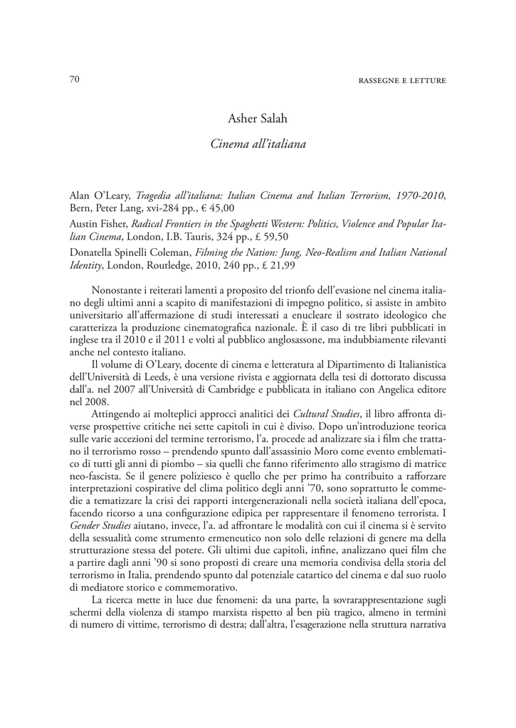 70 Asher Salah Cinema all’italiana Alan O’Leary, Tragedia all’italiana: Italian Cinema and Italian Terrorism, 1970-2010, Bern, Peter Lang, xvi-284 pp., € 45,00 Austin Fisher, Radical Frontiers in the Spaghetti Western: Politics, Violence and Popular Italian Cinema, London, I.B. Tauris, 324 pp., £ 59,50 Donatella Spinelli Coleman, Filming the Nation: Jung, Neo-Realism and Italian National Identity, London, Routledge, 2010, 240 pp., £ 21,99 Nonostante i reiterati lamenti a proposito del trionfo dell’evasione nel cinema italiano degli ultimi anni a scapito di manifestazioni di impegno politico, si assiste in ambito universitario all’affermazione di studi interessati a enucleare il sostrato ideologico che caratterizza la produzione cinematografica nazionale. È il caso di tre libri pubblicati in inglese tra il 2010 e il 2011 e volti al pubblico anglosassone, ma indubbiamente rilevanti anche nel contesto italiano. Il volume di O’Leary, docente di cinema e letteratura al Dipartimento di Italianistica dell’Università di Leeds, è una versione rivista e aggiornata della tesi di dottorato discussa dall’a. nel 2007 all’Università di Cambridge e pubblicata in italiano con Angelica editore nel 2008. Attingendo ai molteplici approcci analitici dei Cultural Studies, il libro affronta diverse prospettive critiche nei sette capitoli in cui è diviso. Dopo un’introduzione teorica sulle varie accezioni del termine terrorismo, l’a. procede ad analizzare sia i film che trattano il terrorismo rosso – prendendo spunto dall’assassinio Moro come evento emblematico di tutti gli anni di piombo – sia quelli che fanno riferimento allo stragismo di matrice neo-fascista. Se il genere poliziesco è quello che per primo ha contribuito a rafforzare interpretazioni cospirative del clima politico degli anni ’70, sono soprattutto le commedie a tematizzare la crisi dei rapporti intergenerazionali nella società italiana dell’epoca, facendo ricorso a una configurazione edipica per rappresentare il fenomeno terrorista. I Gender Studies aiutano, invece, l’a. ad affrontare le modalità con cui il cinema si è servito della sessualità come strumento ermeneutico non solo delle relazioni di genere ma della strutturazione stessa del potere. Gli ultimi due capitoli, infine, analizzano quei film che a partire dagli anni ’90 si sono proposti di creare una memoria condivisa della storia del terrorismo in Italia, prendendo spunto dal potenziale catartico del cinema e dal suo ruolo di mediatore storico e commemorativo. La ricerca mette in luce due fenomeni: da una parte, la sovrarappresentazione sugli schermi della violenza di stampo marxista rispetto al ben più tragico, almeno in termini di numero di vittime, terrorismo di destra; dall’altra, l’esagerazione nella struttura narrativa 71 dei film del ruolo femminile nei movimenti eversivi. Il primo dato viene spiegato come il risultato di un cinema autoriflessivo e critico concepito da autori di sinistra per un pubblico di simile sensibilità politica; il secondo come sintomo di cedimento di un ordine sociale patriarcale, minato dai nuovi ruoli che la donna cominciava allora a ricoprire. Il libro si propone giustamente di evitare di considerare i film solo in rapporto a paradigmi autoriali, cercando invece di interpretarli all’interno degli orizzonti di attesa del loro pubblico. Tuttavia, non sempre nel testo si distingue l’analisi dei film quali documenti dello spirito dei tempi in cui furono realizzati da quella del cinema quale strumento riflessivo su determinati eventi passati. Inoltre, la scelta di studiare solo quei film in cui la tradizione critica ha rinvenuto una maggior complessità strutturale e narrativa finisce col legittimare giudizi di valore e riproporre quella dicotomia tra cinema di élite e cinema popolare che si voleva evitare. Infine, nonostante gli indubbi pregi delle letture proposte per ogni singolo film, il libro giunge per molti versi in ritardo, quando ormai il tema delle relazioni tra politica e società nel cinema italiano è stato oggetto di importanti contributi, basti pensare ai lavori di Maurizio Fantoni Minnella e di Christian Uva, in Italia, e a quelli di Catherine O’Rawe e Mary P. Woods, all’estero. Anche il volume di Fisher, docente di Media Arts all’Università di Bedforshire, è la rielaborazione di una tesi di dottorato, discussa dall’a. all’Università di Londra nel 2009. Come il precedente, anche questo libro si interessa ai rapporti tra politica e cultura popolare negli anni ’60 e ’70 in Italia, prendendo spunto da un genere cinematografico, il Western all’italiana, per mostrarne l’intenso legame con le ideologie in voga nei circoli intellettuali della New Left europea. Il libro cerca di dare risposta ad alcuni dei quesiti che si pone chiunque si occupi dello «spaghetti Western». Perché il Western ha trovato un terreno di elezione in Italia proprio quando negli Stati Uniti attraversava un momento di declino? Perché, alla fine degli anni ’60, alcuni degli esempi più significativi del filone adottano una visione del Far West fortemente influenzata dalle critiche del capitalismo di Marcuse e dalle teorie anticoloniali di Fanon? E, infine, come è stato recepito questo filone dalla cultura americana a partire dagli anni ’70? Fisher inserisce il successo del Western in Italia nel contesto della fascinazione per la cultura americana nel secondo dopoguerra. In particolare insiste, con una certa forzatura, sulla somiglianza dei processi di costruzione nazionale americano e italiano, caratterizzati entrambi da un’unificazione avvenuta con uno scontro Nord-Sud, da migrazioni di massa, banditismo e una diffusa ostilità verso l’autorità costituita centrale. Sarebbero tali elementi a spiegare la presa di questo genere cinematografico sull’immaginario e sui meccanismi di identificazione di un pubblico – quello meridionale – emarginato dalla cultura ufficiale. Fisher divi