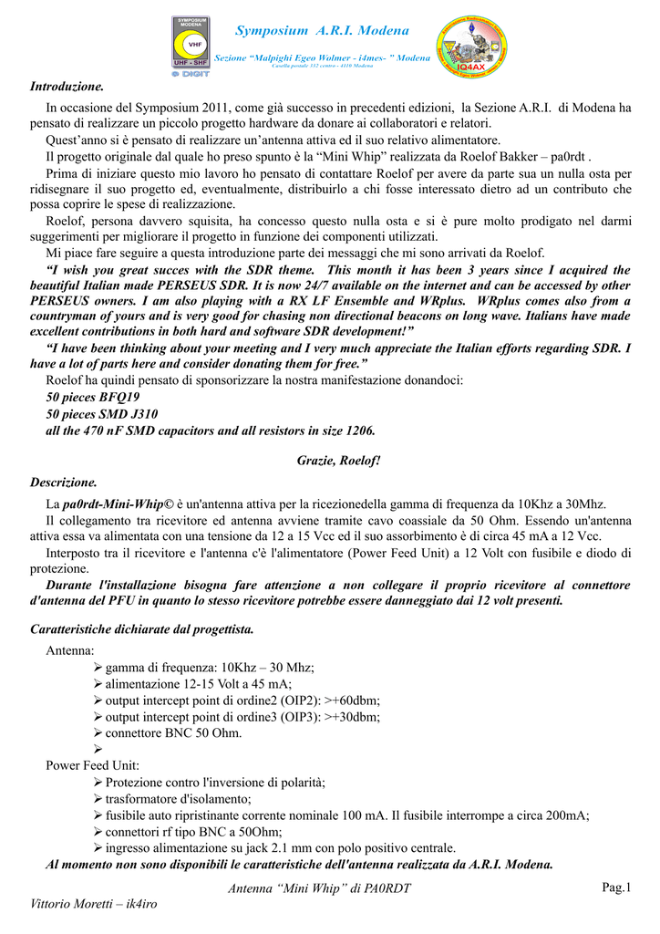 Introduzione. In occasione del Symposium 2011, come già successo in precedenti edizioni, la Sezione A.R.I. di Modena ha pensato di realizzare un piccolo progetto hardware da donare ai collaboratori e relatori. Quest’anno si è pensato di realizzare un’antenna attiva ed il suo relativo alimentatore. Il progetto originale dal quale ho preso spunto è la “Mini Whip” realizzata da Roelof Bakker – pa0rdt . Prima di iniziare questo mio lavoro ho pensato di contattare Roelof per avere da parte sua un nulla osta per ridisegnare il suo progetto ed, eventualmente, distribuirlo a chi fosse interessato dietro ad un contributo che possa coprire le spese di realizzazione. Roelof, persona davvero squisita, ha concesso questo nulla osta e si è pure molto prodigato nel darmi suggerimenti per migliorare il progetto in funzione dei componenti utilizzati. Mi piace fare seguire a questa introduzione parte dei messaggi che mi sono arrivati da Roelof. “I wish you great succes with the SDR theme. This month it has been 3 years since I acquired the beautiful Italian made PERSEUS SDR. It is now 24/7 available on the internet and can be accessed by other PERSEUS owners. I am also playing with a RX LF Ensemble and WRplus. WRplus comes also from a countryman of yours and is very good for chasing non directional beacons on long wave. Italians have made excellent contributions in both hard and software SDR development!” “I have been thinking about your meeting and I very much appreciate the Italian efforts regarding SDR. I have a lot of parts here and consider donating them for free.” Roelof ha quindi pensato di sponsorizzare la nostra manifestazione donandoci: 50 pieces BFQ19 50 pieces SMD J310 all the 470 nF SMD capacitors and all resistors in size 1206. Grazie, Roelof! Descrizione. La pa0rdt-Mini-Whip© è un'antenna attiva per la ricezionedella gamma di frequenza da 10Khz a 30Mhz. Il collegamento tra ricevitore ed antenna avviene tramite cavo coassiale da 50 Ohm. Essendo un'antenna attiva essa va alimentata con una tensione da 12 a 15 Vcc ed il suo assorbimento è di circa 45 mA a 12 Vcc. Interposto tra il ricevitore e l'antenna c'è l'alimentatore (Power Feed Unit) a 12 Volt con fusibile e diodo di protezione. Durante l'installazione bisogna fare attenzione a non collegare il proprio ricevitore al connettore d'antenna del PFU in quanto lo stesso ricevitore potrebbe essere danneggiato dai 12 volt presenti. Caratteristiche dichiarate dal progettista. Antenna: ➢ gamma di frequenza: 10Khz – 30 Mhz; ➢ alimentazione 12-15 Volt a 45 mA; ➢ output intercept point di ordine2 (OIP2): >+60dbm; ➢ output intercept point di ordine3 (OIP3): >+30dbm; ➢ connettore BNC 50 Ohm. ➢ Power Feed Unit: ➢ Protezione contro l'inversione di polarità; ➢ trasformatore d'isolamento; ➢ fusibile auto ripristinante corrente nominale 100 mA. Il fusibile interrompe a circa 200mA; ➢ connettori rf tipo BNC a 50Ohm; ➢ ingresso alimentazione su jack 2.1 mm con polo positivo centrale. Al momento non sono disponibili le caratteristiche dell'antenna realizzata da A.R.I. Modena. Antenna “Mini Whip” di PA0RDT Vittorio Moretti – ik4iro Pag.1 Schema elettrico e PCB antenna Mini Whip Elenco componenti. Parte Valore C1-C2-C3 470 nF L2 470 uH Q1 MMBFJ3 R1-R2-R3 1 Mohm R4 2K2 R5 680 Ohm R6 10Kohm R7 47 R8-R9 470 Ohm R10 680 Ohm T1 BFQ19 X1 Connettore 50 Ohm LED1 Led colorato Contenitore Smd 1206 SOT23 Smd 1206 Smd 1206 Smd 1206 Smd 1206 Smd 1206 Smd 1206 Smd 1206 SOT89 BNC Smd 1206 Descrizione Condensatore Induttanza smd Amplif. RF can. N Resistenza Resistenza Resistenza Resistenza Resistenza Resistenza Resistenza NPN 5 GHz wideband transistor Connettore 90* per PCB Led Note Non utilizzata Non utilizzato Roelof nella sua descrizione spiega che la sua antenna, per ottenere il miglior risultato, è posta a 4 metri di altezza per superare l'altezza delle piante da giardino, in campo aperto tuttavia è sufficiente alzarla a soli 2 metri. Il palo di sostegno andrebbe realizzato in materiale non conduttivo ed il cavo di alimentazione può essere di tipo RG58. La lunghezza del cavo non è comunque critica e e possono essere utilizzati altri cavi coassiali. Antenna “Mini Whip” di PA0RDT Vittorio Moretti – ik4iro Pag.2 Schema elettrico e pcb “Power Feed United”: Elenco componenti “Power Feed United”: Parte C1-C2-C3 C4 L1 D1 F1 J1 X1-X2 Valore Contenitore 470 nF Passo 5 10uF 6 mm Passo 2.5 1 mH Vedi note 1N5818 DO41 100 mA Jack Connettore 50 Ohm BNC Descrizione Condensatore Condensatore elettrolitico Note Diodo SCHOTTKY 1A Fusibile ripristinabile Jack alimentazione 2.1 per PCB Connettore 90* per PCB Come si può notare dallo schema, l'alimentazione dell'antenna è protetta contro l'inversione di polarità per mezzo di D1. La funzione di F1 è quella di proteggere il sistema da un cortocircuito. F1 è un fusibile di tipo ripristinabile automaticamente. L1 è un trasformatore d'isolamento RF che può risultare utile in caso di problemi di ricezione dovuti a rumore di modo comune. Il jumper JP1, quando inserito, collega la massa dell'antenna con quella della radio. Durante l'installazione bisogna fare molta attenzione al collegamento della radio e dell'antenna. Invertire i collegamenti può essere causa di rottura della radio. Il progettista – pa0rdt -, il disegnatore di questa scheda – ik4iro -, i soci ed il Direttivo della Sezione A.R.I. Modena non sono responsabili di danni causati da un errato collegamento dell'apparecchiatura. Come sistema di alimentazione si sconsigliano quegli alimentatori non stabilizzati o switching da muro che sono fonte di rumore RF vanificando in questo modo le caratteristiche dell'antenna stessa. N.B. - Nella scheda PFU già distribuita sono stati commessi due errori di realizzazione e montaggio. 1. Le masse tra ingresso ed uscita erano collegate insieme vanificando così la funzione del jumper. L'errore è stato corretto realizzando un'incisione sul c.s. E saldando tra loro i du