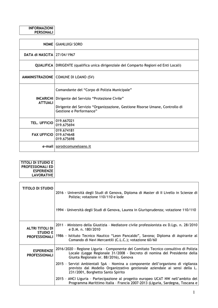 INFORMAZIONI PERSONALI NOME GIANLUIGI SORO DATA di NASCITA 27/04/1967 QUALIFICA DIRIGENTE (qualifica unica dirigenziale del Comparto Regioni ed Enti Locali) AMMINISTRAZIONE COMUNE DI LOANO (SV) Comandante del “Corpo di Polizia Municipale” INCARICHI Dirigente del Servizio “Protezione Civile” ATTUALI Dirigente del Servizio “Organizzazione, Gestione Risorse Umane, Controllo di Gestione e Performance” 019.667021 019.675694 019.674181 FAX UFFICIO 019.674648 019.675698 TEL. UFFICIO e-mail [email protected] TITOLI DI STUDIO E PROFESSIONALI ED ESPERIENZE LAVORATIVE TITOLO DI STUDIO 2016 - Università degli Studi di Genova, Diploma di Master di II Livello in Scienze di Polizia; votazione 110/110 e lode 1994 - Università degli Studi di Genova, Laurea in Giurisprudenza; votazione 110/110 2011 – Ministero della Giustizia – Mediatore civile professionista ex D.Lgs. n. 28/2010 ALTRI TITOLI DI e D.M. n. 180/2010 STUDIO E PROFESSIONALI 1986 - Istituto Tecnico Nautico “Leon Pancaldo”, Savona; Diploma di Aspirante al Comando di Navi Mercantili (C.L.C.); votazione 60/60 ESPERIENZE PROFESSIONALI 2016/2020 - Regione Liguria – Componente del Comitato Tecnico consultivo di Polizia Locale (Legge Regionale 31/2008 - Decreto di nomina del Presidente della Giunta Regionale nr. 88/2016), Genova 2015 – Servizi Ambientali SpA – Nomina a componente dell’organismo di vigilanza previsto dal Modello Organizzativo gestionale aziendale ai sensi della L. 231/2001, Borghetto Santo Spirito 2015 – ANCI Liguria – Partecipazione al progetto europeo UCAT NW nell’ambito del Programma Marittimo Italia – Francia 2007-2013 (Liguria, Sardegna, Toscana e 1 Corsica) 2015 – Realizzazione del percorso di formazione sulle Unioni di Comuni e sulle gestioni associate negli Enti Locali rivolto ad Amministratori, Segretari Comunali e Provinciali, Dirigenti e Funzionari dei Comuni liguri (8 giornate, 48 ore) - ANCI Liguria e Comune di Loano - Loano 2014 – ANCI Liguria – Componente della Commissione regionale Protezione Civile, Genova 2014 - Comune di Loano – Encomio solenne per il contributo diretto dato a personale dell’Arma dei Carabinieri che ha portato all’arresto per rapina di due malviventi al termine di inseguimento e conflitto a fuoco - Deliberazione di Giunta Comunale n. 135 del 26/11/2014 2014 - Comune di Loano – Nomina a responsabile del Servizio di Protezione Civile 2014 – Comune di Albenga - Nomina a membro del Gruppo di lavoro per la vivibilità del Territorio previsto dall'articolo 2 del Patto Territoriale per la sicurezza sottoscritto il 27 settembre 2011 fra Regione Liguria, Prefettura di Savona, Provincia di Savona e successivo accordo del 7 marzo 2013 2014/2016 – ANCI Liguria – Coordinatore Tecnico della Commissione Tecnica Sicurezza, Legalità e Polizia Locale, Genova 2014/2016 - Comune di Albenga - Dirigente/Comandante della Polizia Municipale in forma associata temporanea tra i Comuni di Albenga e Loano 2014 – Comune di Loano – Nomina a responsabile del trattamento dati della videosorveglianza del Comune di Loano secondo quanto previsto dall’art. 4 del regolamento e dall’art. 30 del D.Lgs. 196/2003 2013 – Comune di Loano – Nomina a Funzionario/Ufficiale responsabile (FUR nell’organigramma del CED interforze-SDI del Ministero dell’Interno) nell’ambito del Progetto SICoM, “Sicurezza in Comune”. 2013 – Comune di Varazze - Membro esperto nella selezione pubblica per la copertura di due posti di Agenti di Polizia Municipale, Varazze 2013/2016 – Comune di Loano – Delega a comparire nanti il Collegio di Conciliazione per l’esperimento del tentativo di conciliazione nelle controversie di lavoro, munito del potere di conciliare; 2012 – Regione Liguria – Componente del Tavolo Tecnico del Centro Regionale di Monitoraggio e Analisi degli Incidenti Stradali (CRMAIS); Genova 2012 - Comune di Loano – Nomina a Segretario della 4^ commissione consiliare; 2012 – Comune di Vado Ligure - Membro esperto nella selezione pubblica per la copertura di un posto di Ispettore della Polizia Municipale tramite procedura di mobilità, Vado Ligure 2012 - Comune di Loano – Nomina a Segretario del Nucleo di Valutazione; 2012 – Comune di Loano – Dirigente del Servizio “Organizzazione, Gestione Risorse Umane, Controllo di Gestione e Performance” 2011 - Comune di Savona – Membro esperto nella selezione pubblica per la copertura di un posto di Ispettore della Polizia Municipale, Savona 2011 – Progetto “VIA – Volontari in azione per la sicurezza stradale” (Provincia di Imperia, Comune di Imperia, Comune di Busca, Comune di Loano, Aci di Cuneo e Associazione Segnal’Etica Onlus di Verzuolo) - Membro della Commissione di esame per i corsi dei formazione dei Volontari, Imperia 2011/2016 – ANCI Liguria – Referente: - nei Tavoli Tecnici sull’associazionismo municipale dei Comuni di Ventimiglia, Vallecrosia, Bordighera, Ospedaletti e Camporosso e dei Comuni del Tigullio per la realizzazione di un’associazione dei Corpi e dei Servizi di Polizia Locale 2 - per la pareristica in materia di Polizia Locale; 2011 - Regione Liguria - Comitato Tecnico consultivo di Polizia Locale - Componente del gruppo di lavoro per l’individuazione dei criteri per l’esercizio delle funzioni associate di cui alla legge 122/2010, Genova 2011 - Comune di Loano – Componente di diritto in seno alla delegazione trattante di parte pubblica (deliberazione della Giunta Comunale nr. 56/2011) 2010/2015 - Regione Liguria – Componente del Comitato Tecnico consultivo di Polizia Locale (Legge Regionale 31/2008 - Decreto di nomina del Presidente della Giunta Regionale nr. 88/2010), Genova 2010 – Comune di Loano - Sostituto del dirigente del settore Affari Generali in seno alla delegazione trattante di parte pubblica (deliberazione della Giunta Comunale nr. 164/2010) 2010 – Scuola Interregionale di Polizia Locale (Liguria, Toscana, Emilia Romagna) – Membro delle Commissi