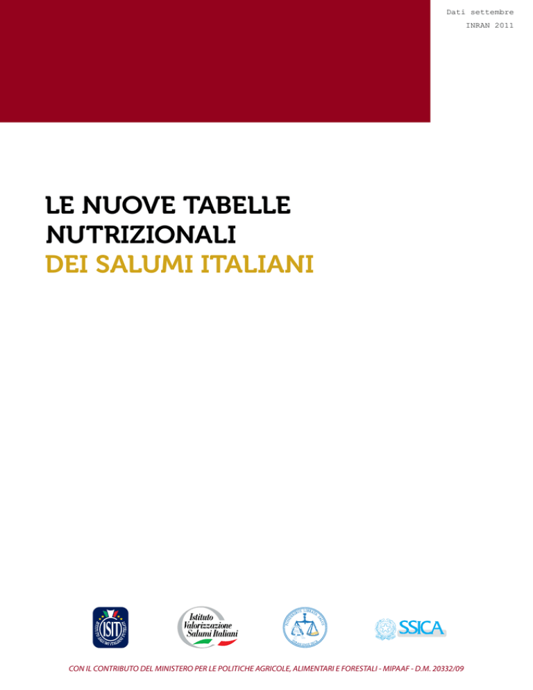 Dati settembre INRAN 2011 Le nuove tabelle nutrizionali dei Salumi Italiani CON IL CONTRIBUTO DEL MINISTERO PER LE POLITICHE AGRICOLE, ALIMENTARI E FORESTALI - MIPAAF - D.M. 20332/09 Dati settembre INRAN 2011 Proteine Lipidi Colesterolo Carboidrati g g g mg g kcal kJ g Bresaola della Valtellina IGP 59,3 33,1 2,0 63,0 0,4 151 634 4,0 Ciccioli 2,5 45,2 50,6 90,0 0,0 636 2662 1,6 Coppa 34,7 28,9 31,6 127,0 0,0 401 1676 4,9 54,4 23,6 16,3 86,0 3,2 253 1058 2,2 Mortadella Bologna IGP 56,9 15,7 25,0 72,0 0,0 288 1206 2,4 Pancetta arrotolata 30,0 15,1 52,2 68,0 0,0 530 2217 3,0 Prosciutto cotto 72,2 15,7 7,6 48,6 1,7 138 576 2,1 Prosciutto cotto, sgrassato 74,7 17,0 3,5 1,9 107 446 2,1 Prosciutto cotto scelto 70,0 17,5 9,2 0,6 155 649 1,9 Prosciutto cotto scelto, sgrassato 73,3 19,4 4,0 0,5 115 483 2,0 Prosciutto cotto alta qualità 66,8 18,0 11,9 0,8 182 761 1,9 71,8 19,5 5,0 0,9 127 531 2,0 75,0 0,1 235 985 6,0 Cotechino Modena IGP, cotto 1 2 2 2 Prosciutto cotto alta qualità, sgrassato Prosciutto crudo nazionale Dati 2011 13,7 50,5INRAN 27,8 2 57,1 50,3 NaCl Salumi italiani Energia Acqua Composizione chimica e valore energetico per 100 g Prosciutto crudo nazionale, sgrassato 56,1 30,5 5,1 87,0 0,3 169 707 6,9 Prosciutto di Modena DOP 45,6 25,6 22,9 62,0 0,1 309 1293 5,1 Prosciutto di Modena DOP, sgrassato 53,8 30,2 8,9 75,0 0,1 201 842 6,0 Prosciutto di San Daniele DOP 50,2 25,7 18,6 83,0 0,2 271 1135 4,5 Prosciutto di San Daniele DOP, sgrassato 58,0 29,0 6,5 91,0 0,4 176 737 5,1 Salame Milano 37,7 25,4 31,0 104,0 1,1 384 1608 3,9 Salame Napoli 37,3 27,4 29,7 91,0 0,2 378 1580 4,1 Salame ungherese 34,6 23,6 35,7 92,0 1,1 420 1756 4,0 Salamini italiani alla Cacciatora DOP 33,1 28,4 32,7 94,0 0,7 411 1720 4,2 Speck dell’Alto Adige IGP 43,6 30,7 19,1 90,6 1,2 300 1254 4,1 Strutto 0,0 0,0 100,0 108,0 0,0 900 3766 0,1 Wurstel di puro suino 61,7 13,2 21,1 81,0 1,9 250 1046 2,2 60,3 14,6 22,2 84,0 0,3 259 1083 2,3 54,1 23,7 17,4 106,0 2,6 262 1094 1,7 2 2 Wurstel di puro suino, cotto 3 Zampone Modena IGP, cotto 1 1 Dopo cottura 20' dentro la confezione e scolato dal liquido di cottura. 2 Valori riferiti al prodotto privato del grasso visibile. 3 Saltato in padella senza aggiunta di grassi e sale. Salumi Italiani: nuovi valori, nuovo valore 3 Dati settembre INRAN 2011 Potassio Magnesio Calcio Fosforo Sali minerali: macroelementi per 100 g mg mg mg mg Bresaola della Valtellina IGP 630 26 6 269 Ciccioli 425 16 12 164 Coppa 685 27 7 231 220 9 14 91 Mortadella Bologna IGP 314 13 8 119 Pancetta arrotolata 369 12 3 118 Prosciutto cotto 311 12 6 126 Prosciutto cotto, sgrassato 325 13 7 132 Prosciutto cotto scelto 321 13 5 136 Prosciutto cotto scelto, sgrassato 339 14 5 143 Prosciutto cotto alta qualità 316 13 5 142 Prosciutto cotto alta qualità, sgrassato 341 14 5 153 Prosciutto crudo nazionale 621 22 10 196 Prosciutto crudo nazionale, sgrassato 683 24 11 216 Prosciutto di Modena DOP 612 24 10 206 Prosciutto di Modena DOP, sgrassato 723 28 12 244 Prosciutto di San Daniele DOP 581 20 9 184 Prosciutto di San Daniele DOP, sgrassato 667 23 10 211 Salame Milano 657 21 19 204 Salame Napoli 667 22 12 208 Salame ungherese 637 17 26 186 Salamini italiani alla Cacciatora DOP 694 21 8 204 Speck dell’Alto Adige IGP 658 27 8 272 tr tr tr tr 260 10 21 107 223 9 17 77 132 7 12 68 Salumi italiani Cotechino Modena IGP, cotto 1 2 2 2 2 2 2 Strutto Wurstel di puro suino Wurstel di puro suino, cotto 3 Zampone Modena IGP, cotto 1 1 Dopo cottura 20' dentro la confezione e scolato dal liquido di cottura. 2 Valori riferiti al prodotto privato del grasso visibile. 3 Saltato in padella senza aggiunta di grassi e sale. 4 Dati settembre INRAN 2011 Ferro Zinco Rame Manganese Sali minerali: microelementi per 100 g mg mg mg mg Bresaola della Valtellina IGP 2,63 4,51 0,07 0,02 Ciccioli 1,15 1,44 0,12 0,03 Coppa 1,33 3,70 0,10 0,03 1,44 1,63 tr 0,01 Mortadella Bologna IGP 1,03 1,57 tr 0,01 Pancetta arrotolata 0,35 1,28 0,05 0,01 Prosciutto cotto 0,49 1,10 0,08 0,01 Prosciutto cotto, sgrassato 0,52 1,15 0,08 0,01 Prosciutto cotto scelto 0,57 1,28 0,07 0,01 Prosciutto cotto scelto, sgrassato 0,60 1,35 0,08 0,01 Prosciutto cotto alta qualità 0,67 1,45 0,09 0,01 Prosciutto cotto alta qualità, sgrassato 0,72 1,57 0,10 0,01 Prosciutto crudo nazionale 0,83 2,08 0,05 0,01 Prosciutto crudo nazionale, sgrassato 0,91 2,29 0,05 0,01 Prosciutto di Modena DOP 1,05 2,72 0,06 0,01 Prosciutto di Modena DOP, sgrassato 1,24 3,22 0,07 0,02 Prosciutto di San Daniele DOP 0,92 2,38 0,04 0,01 Prosciutto di San Daniele DOP, sgrassato 1,06 2,73 0,05 0,01 Salame Milano 1,20 3,04 0,13 0,02 Salame Napoli 0,88 2,47 0,11 0,04 Salame ungherese 1,08 2,72 0,12 0,02 Salamini italiani alla Cacciatora DOP 1,02 2,54 tr 0,01 Speck dell’Alto Adige IGP 1,42 2,46 0,07 0,04 tr 0,08 0,02 0,00 1,00 1,15 0,06 0,01 0,86 0,92 0,04 0,01 1,28 1,50 tr 0,01 Salumi italiani Cotechino Modena IGP, cotto 1 2 2 2 2 2 2 Strutto Wurstel di puro suino Wurstel di puro suino, cotto 3 Zampone Modena IGP, cotto 1 1 Dopo cottura 20' dentro la confezione e scolato dal liquido di cottura. 2 Valori riferiti al prodotto privato del grasso visibile. 3 Saltato in padella senza aggiunta di grassi e sale. Tra i microelementi oggetto dell'analisi 2011 rientra anche il Selenio, i cui dati sono ancora in fase di elaborazione. Salumi Italiani: nuovi valori, nuovo valore 5 Dati settembre INRAN 2011 Tiamina Riboflavina Niacina Vit. B6 Vit. B12 Vit. E Vitamine per 100 g mg mg mg mg µg mg Bresaola della Valtellina IGP 0,41 0,13 2,74 0,52 0,77 0,14 Ciccioli 0,00 0,00 0,00 0,00 0,00 0,16 Coppa 0,61 0,18 6,02 0,14 0,68 0,16 0,09 0,09 2,68 0,06 0,52 0,28 Mortadella Bologna IGP 0,24 0,12 4,19 0,27 0,28 0,28 Pancetta arrotolata 0,36 0,06 2,85 0,06 0,51 0,27 Prosciutto cotto 0,67 0,12 4,40 0,37 0,09 0,09 Prosciutto cotto, sgrassato 0,70 0,13 4,60 0,39 0,09 Prosciutto cotto scelto 0,54 0,13 4,70 0,43 0,13 Prosciutto cotto scelto, sgrassato 0,57 0,14 4,97 0,45 0,13 Prosciutto cotto alta qualità 0,69 0,14 4,70 0,44