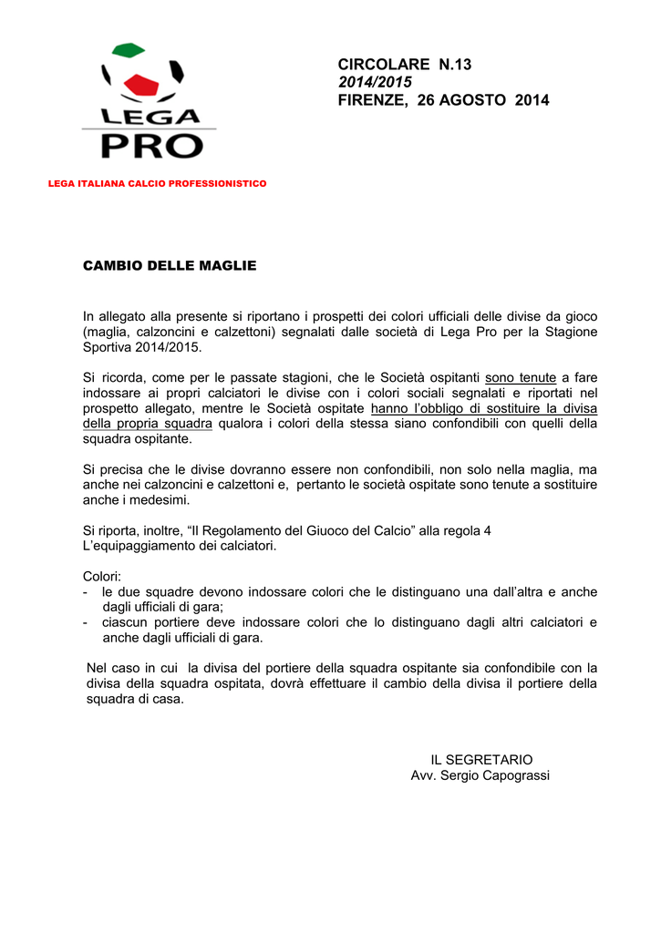 CIRCOLARE N.13 2014/2015 FIRENZE, 26 AGOSTO 2014 LEGA ITALIANA CALCIO PROFESSIONISTICO CAMBIO DELLE MAGLIE In allegato alla presente si riportano i prospetti dei colori ufficiali delle divise da gioco (maglia, calzoncini e calzettoni) segnalati dalle società di Lega Pro per la Stagione Sportiva 2014/2015. Si ricorda, come per le passate stagioni, che le Società ospitanti sono tenute a fare indossare ai propri calciatori le divise con i colori sociali segnalati e riportati nel prospetto allegato, mentre le Società ospitate hanno l’obbligo di sostituire la divisa della propria squadra qualora i colori della stessa siano confondibili con quelli della squadra ospitante. Si precisa che le divise dovranno essere non confondibili, non solo nella maglia, ma anche nei calzoncini e calzettoni e, pertanto le società ospitate sono tenute a sostituire anche i medesimi. Si riporta, inoltre, “Il Regolamento del Giuoco del Calcio” alla regola 4 L’equipaggiamento dei calciatori. Colori: - le due squadre devono indossare colori che le distinguano una dall’altra e anche dagli ufficiali di gara; - ciascun portiere deve indossare colori che lo distinguano dagli altri calciatori e anche dagli ufficiali di gara. Nel caso in cui la divisa del portiere della squadra ospitante sia confondibile con la divisa della squadra ospitata, dovrà effettuare il cambio della divisa il portiere della squadra di casa. IL SEGRETARIO Avv. Sergio Capograssi GIRONE A SOCIETÁ COLORE MAGLIA COLORE CALZONCINI COLORE CALZETTONI ALBINOLEFFE ALESSANDRIA BASSANO V. COMO CREMONESE FERALPISALÒ GIANA E. LUMEZZANE MANTOVA MONZA NOVARA PAVIA PORDENONE PRO PATRIA REAL VICENZA RENATE SUDTIROL TORRES U. VENEZIA AREZZO BLU-CELESTE GRIGIA GIALLO-ROSSA A STRISCE VERTICALI ROYAL BLUE GRIGIO-ROSSA A STRISCE VERTICALI VERDE-AZZURRA AZZURRO-BIANCO ROSSO-BLU BIANCA CON BANDA ROSSA ROSSA AZZURRO AZZURRA NERO-VERDE A STRISCE VERTICALI BIANCO-BLU A STRISCE ORIZZONTALI BIANCO-ROSSA NERO-AZZURRA BIANCO-ROSSA ROSSO-BLU NERA RISVOLTI ARANCIO-VERDI AMARANTO BLU-CELESTE GRIGI NERI ROYAL BLUE ROSSI BIANCHI NERI BLU BIANCHI ROSSI NERI AZZURRI NERI BLU ROSSI NERI BIANCO - ROSSI BLU NERI AMARANTO/BIANCHI CELESTE GRIGI NERI ROYAL BLUE ROSSI BIANCHI BIANCHI BLU BIANCHI ROSSI NERI AZZURRI NERI BLU ROSSI NERI BIANCO - ROSSI BLU NERI AMARANTO GIRONE B SOCIETÁ COLORE MAGLIA COLORE CALZONCINI COLORE CALZETTONI ANCONA ASCOLI PICCHIO CARRARESE FORLI’ GROSSETO GUBBIO L’AQUILA LUCCHESE PISA PISTOIESE PONTEDERA PRATO PRO PIACENZA REGGIANA SAVONA S.P.A.L. 2013 SAN MARINO SANTARCANGELO TERAMO TUTTOCUOIO 1957 ROSSA BIANCO-NERA A STRISCE VERTICALI AZZURRA BIANCO - ROSSA ROSSA CON BANDA BIANCA OBLIQUA ROSSO - BLU ROSSO-BLU A STRISCE VERTICALI ROSSO NERA A STRISCE VERTICALI NERO- AZZURRA A STRISCE VERTICALI ARANCIONE GRANATA AZZURRA ROSSO NERA A STRISCE VERTICALI GRANATA BIANCO-BLU A STRISCE VERTICALI AZZURRA A STRISCE VERTICALI BIANCO - AZZURRA GIALLO - BLU BIANCO - ROSSA NERO-VERDE BIANCHI BIANCHI AZZURRI ROSSI ROSSI BLU BLU NERI NERI ARANCIONI GRANATA BIANCHI NERI BLU BLU BIANCHI BIANCHI BLU ROSSI NERI ROSSI BIANCHI AZZURRI ROSSI ROSSI BLU ROSSO-BLU NERI NERI ARANCIONI GRANATA AZZURRI NERI NERI-GRANATA BLU BIANCHI AZZURRI BLU ROSSI NERI GIRONE C SOCIETÁ COLORE MAGLIA COLORE CALZONCINI COLORE CALZETTONI AVERSA NORMANNA BARLETTA BENEVENTO CASERTANA CATANZARO COSENZA FOGGIA ISCHIA ISOLAVERDE JUVE STABIA LECCE LUPA ROMA MARTINA FRANCA MATERA MELFI MESSINA PAGANESE REGGINA SALERNITANA SAVOIA VIGOR LAMEZIA GRANATA BIANCO-ROSSA A STRISCE VERTICALI GIALLO-ROSSA A STRISCE VERTICALI ROSSO-BLU A STRISCE VERTICALI GIALLO-ROSSA A STRISCE VERTICALI ROSSO-BLU ROSSO-NERA A STRISCE VERTICALI GIALLO-BLU GIALLO BLU A STRISCE VERTICALI GIALLO-ROSSA A STRISCE VERTICALI NERA BIANCO-AZZURRA AZZURRO GIALLA BIANCO SCUDATA AZZURRA AMARANTO GRANATA BIANCO SCUDATA BIANCO-VERDE A STRISCE VERTICALI GRANATA ROSSI NERI BLU ROSSI BLU NERI BLU BLU BLU NERI BIANCO - AZZURRI AZZURRO VERDI NERI BIANCHI BIANCHI GRANATA BIANCHI BIANCHI GRANATA ROSSI ROSSI BLU ROSSI BLU NERI BORDO ROSSO GIALLO-BLU BLU ROSSI NERI BIANCO - AZZURRI AZZURRO VERDI NERI AZZURRI NERI GRANATA BIANCHI BIANCHI