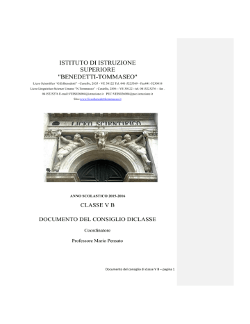 ISTITUTO DI ISTRUZIONE SUPERIORE "BENEDETTI-TOMMASEO" Liceo Scientifico “G.B.Benedetti” - Castello, 2835 - VE 30122 Tel. 041-5225369 - Fax041-5230818 Liceo Linguistico-Scienze Umane “N.Tommaseo” - Castello, 2856 – VE 30122 - tel. 0415225276 – fax . 0415225276 E-mail:[email protected] PEC:[email protected] Sito:www.liceobenedettitommaseo.it ANNO SCOLASTICO 2015-2016 CLASSE V B DOCUMENTO DEL CONSIGLIO DICLASSE Coordinatore Professore Mario Pensato Documento del consiglio di classe V B – pagina 1 Liceo Scientifico “G.BBenedetti” DOCUMENTO DEL CONSIGLIO DICLASSE Classe 5B Anno scolastico2015/2016 Dirigente Scolastico: Professore Roberto Sintini Componenti del Consiglio di Classe V B Docenti Materia BATTISTEL ELISABETTA Inglese CAMPIMATTEO Filosofia CESCO FRAREFRANCESCO ScienzeMotorie e Sportive DARISIMICHELE DE NARDUS GIOVANNI Religione GAMBATO GIOVANNA Scienze Naturali ** PENSATO MARIO Matematica eFisica * SEGA PAOLA Disegno e Storiadell’Arte * XAUSA ELISABETTA Storia Firma Italiano eLatino ** Coordinatore di classe e commissario interno * Commissario interno 1. Storia della classe nel triennio La classe è composta, alla fine dell’anno scolastico 2015 - 2016, da 19 studenti (8 maschi e 11 femmine); nella composizione del gruppo – classe le variazioni nel triennio sono state minime, come si può dedurre dalla seguente tabella: Classe III B IV B VB Anno scolastico 2013 - 2014 2014 - 2015 2015 -2016 Numero alunni 21 20 19 Promossi 21 19 Promossi con sospensione 5 5 Respinti 0 1 Ritirati o trasferiti 1 Nell’anno scolastico 2014 – 2015, un alunno si è trasferito in un’ altra città. La classe ha conservato le proprie caratteristiche iniziali: partecipazioni all’attività didattica, interazione con i docenti, impegno e applicazione sufficientemente continui, anche se, come naturale, in modo diversificato nelle diverse materie. Documento del consiglio di classe V B – pagina 2 2. Continuitàdidattica nel triennio Discipline Inglese Filosofia ScienzeMotorie Religione Italiano eLatino Scienze Naturali Matematica Fisica Disegno e Storiadell’Arte Storia Terza Gallese Luisa Piani Vincenzo Quarta Zernitz Michela Campi Matteo Cesco FrareFrancesco DarisiMichele Cesco FrareFrancesco DarisiMichele De NardusGiovanni Gambato Giovanna Marascalchi Adriana De NardusGiovanni Gambato Giovanna Marascalchi Adriana Preti Giovanni Marigonda Nicola Sega Paola Sega Paola Piani Vincenzo Savi Alessia Quinta Battistel Elisabetta CampiMatteo Cesco FrareFrancesco DarisiMichele De NardusGiovanni Gambato Giovanna Pensato Mario Pensato Mario Sega Paola Xausa Elisabetta La tabella evidenzia come sia mancata continuità didattica in fisica, inglese e storia: ogni anno un docente diverso. In filosofia la continuità si è conservata negli ultimi due anni, in matematica nei primi due (oltre che nel I biennio). Le difficoltà maggiori incontrate dai ragazzi sono state nelle materie di indirizzo, matematica e fisica, come si puòanalizzare, in modo più dettagliato, dagli allegati relativi alle singole discipline (All. A). 3. Andamento della classe nell’anno in corso Dopo un inizio difficile, a causa dei diversi metodi di insegnamento dei nuovi docenti, soprattutto nelle materie di indirizzo, la classe ha affrontato questo ultimo anno in modo responsabile, dimostrando impegno, applicazione, partecipazione all’attività didattica. Per caratteristiche dei ragazzi, le lezioni sono dialogate, con interazioni costruttive ed interventi pertinenti. Il rendimento è conforme alla storia scolastica dei singoli alunni, con la naturale maturazione nella padronanza dei linguaggi delle singole discipline. Il comportamento è sempre stato corretto e la frequenza,in generale, regolare. 4. Obiettivi generali (educativi e formativi) raggiunti Con modalità diversa nelle differenti discipline tutti gli alunni hanno dimostrato di aver raggiunto i seguenti obiettivi trasversali: Autonomia del lavoro individuale Padronanza di contenuti e tecniche specifiche di espressione Capacità di rielaborazione personale Capacità di analizzare un testo specifico o un problema fisico - matematico, con l’applicazione di strumenti idonei alla descrizione Capacità di tradurre in ambiti diversi concetti e contenuti appresi in un contesto specifico 5. Conoscenze, competenze e capacità raggiunte Si rimanda al’allegato relativo alle singole discipline (All. A). Documento del consiglio di classe V B – pagina 3 6. Attività extra/para/intercurricolari effettivamente svolte Viaggio di istruzione a Vienna e Praga Uscita a Gorizia, Redipuglia, Carso. Visita al MUSME (museo della Storia della Medicina) Visita all’Orto Botanico di Padova Conferenze sul suolo (Ecuador) e sull’Antartide Giornata del Ricordo, conferenza sul “tormentato confine orientale” Conferenza all’Ateneo sulla selezione naturale delle biomolecole (VIII Darwin Day) Partecipazione di gruppi di studenti alle olimpiadi di matematica (in tutti e tre gli anni) Partecipazione alle olimpiadi della Filosofia Uno studente si è qualificato per la fase regionale Partecipazione, da parte di alcuni allievi a competizioni sportive interistituti A.S. 2014/2015: viaggio di istruzione in Sicilia con visite guidate a Siracusa, sull’Etna, Piazza Armerina, Agrigento, Segesta, Palermo. Partecipazione alle olimpiadi della filosofia Uno studente si è qualificato per la fase regionale A. S. 2013 -2014: Museo di Storia Naturale. Venezia città medievale. Visita in basilica di S. Marco. Viaggio di istruzione in Toscana. 7. Criteri e strumenti di valutazione SCALA DI VALUTAZIONE PER TUTTE LEDISCIPLINE Griglia approvata nel Collegio dei Docenti ed inserita nel P.O.F. Giudizio Provanulla Molto negatio Gravemente insufficiente Insufficiente Voto 1-2 3 4 5 Indicatori e descrittori dellavalutazione rispettoalleconoscenze,abilitàecompetenzeraggiunte Totale mancanza di elementi significativi per lavalutazione. Conoscenzemoltolimitateescorrette. Nonsonoriscontrabiliattivitàdiapprend