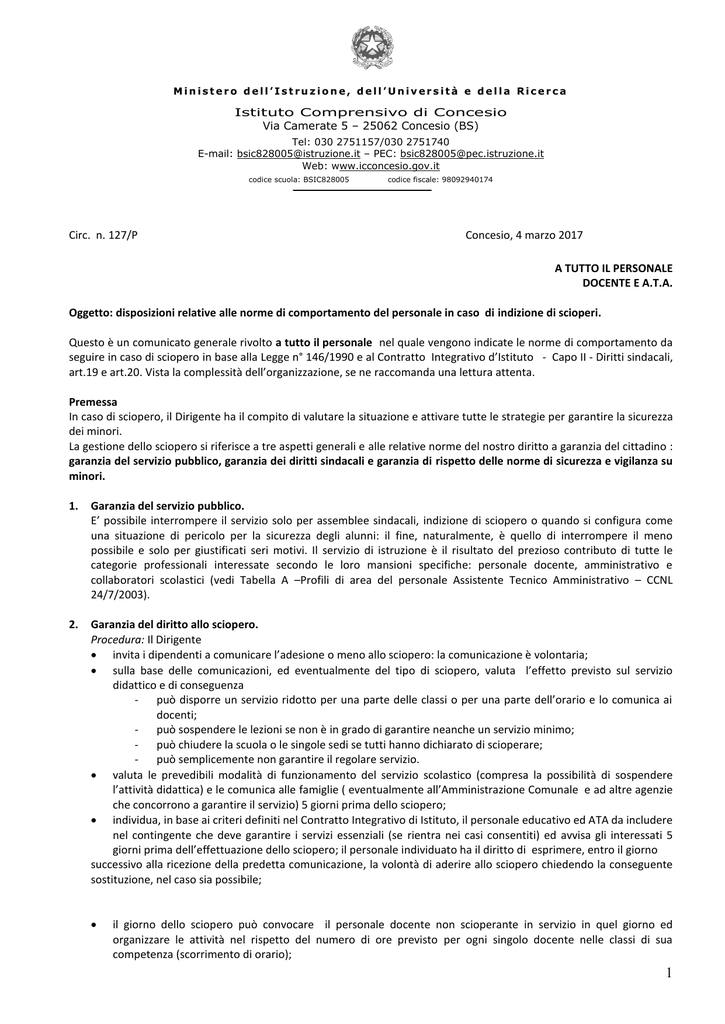 Ministero dell’Istruzione, dell’Università e della Ricerca Istituto Comprensivo di Concesio Via Camerate 5 – 25062 Concesio (BS) Tel: 030 2751157/030 2751740 E-mail: [email protected] – PEC: [email protected] Web: www.icconcesio.gov.it codice scuola: BSIC828005 Circ. n. 127/P codice fiscale: 98092940174 Concesio, 4 marzo 2017 A TUTTO IL PERSONALE DOCENTE E A.T.A. Oggetto: disposizioni relative alle norme di comportamento del personale in caso di indizione di scioperi. Questo è un comunicato generale rivolto a tutto il personale nel quale vengono indicate le norme di comportamento da seguire in caso di sciopero in base alla Legge n° 146/1990 e al Contratto Integrativo d’Istituto - Capo II - Diritti sindacali, art.19 e art.20. Vista la complessità dell’organizzazione, se ne raccomanda una lettura attenta. Premessa In caso di sciopero, il Dirigente ha il compito di valutare la situazione e attivare tutte le strategie per garantire la sicurezza dei minori. La gestione dello sciopero si riferisce a tre aspetti generali e alle relative norme del nostro diritto a garanzia del cittadino : garanzia del servizio pubblico, garanzia dei diritti sindacali e garanzia di rispetto delle norme di sicurezza e vigilanza su minori. 1. Garanzia del servizio pubblico. E’ possibile interrompere il servizio solo per assemblee sindacali, indizione di sciopero o quando si configura come una situazione di pericolo per la sicurezza degli alunni: il fine, naturalmente, è quello di interrompere il meno possibile e solo per giustificati seri motivi. Il servizio di istruzione è il risultato del prezioso contributo di tutte le categorie professionali interessate secondo le loro mansioni specifiche: personale docente, amministrativo e collaboratori scolastici (vedi Tabella A –Profili di area del personale Assistente Tecnico Amministrativo – CCNL 24/7/2003). 2. Garanzia del diritto allo sciopero. Procedura: Il Dirigente invita i dipendenti a comunicare l’adesione o meno allo sciopero: la comunicazione è volontaria; sulla base delle comunicazioni, ed eventualmente del tipo di sciopero, valuta l’effetto previsto sul servizio didattico e di conseguenza può disporre un servizio ridotto per una parte delle classi o per una parte dell’orario e lo comunica ai docenti; può sospendere le lezioni se non è in grado di garantire neanche un servizio minimo; può chiudere la scuola o le singole sedi se tutti hanno dichiarato di scioperare; può semplicemente non garantire il regolare servizio. valuta le prevedibili modalità di funzionamento del servizio scolastico (compresa la possibilità di sospendere l’attività didattica) e le comunica alle famiglie ( eventualmente all’Amministrazione Comunale e ad altre agenzie che concorrono a garantire il servizio) 5 giorni prima dello sciopero; individua, in base ai criteri definiti nel Contratto Integrativo di Istituto, il personale educativo ed ATA da includere nel contingente che deve garantire i servizi essenziali (se rientra nei casi consentiti) ed avvisa gli interessati 5 giorni prima dell’effettuazione dello sciopero; il personale individuato ha il diritto di esprimere, entro il giorno successivo alla ricezione della predetta comunicazione, la volontà di aderire allo sciopero chiedendo la conseguente sostituzione, nel caso sia possibile; il giorno dello sciopero può convocare il personale docente non scioperante in servizio in quel giorno ed organizzare le attività nel rispetto del numero di ore previsto per ogni singolo docente nelle classi di sua competenza (scorrimento di orario); 1 può sospendere le attività di classi/sezioni con orario pomeridiano convocando tutti i docenti non scioperanti nel turno della mattina; può sospendere servizi collaterali (trasporto, mensa, ecc.) in quanto, non sapendo se il personale aderirà o meno, non può prevedere l’accoglienza degli alunni da parte della scuola. 3. Garanzia della sicurezza. Le norme relative alla sicurezza nei posti di lavoro ( L. 626 del 1994 e successiva Dlgs 81 del 2008) ed in particolare nelle scuole (Vigilanza sui minori e responsabilità dei precettori - Codice Civile art. 2048) impongono di prevedere le possibili situazioni in cui si può prefigurare rischio o pericolo per gli alunni. La richiesta rivolta ai genitori di accompagnare gli alunni a scuola nel giorno dello sciopero risponde alla necessità di evitare situazioni di possibile rischio , ad esempio: - gruppi di alunni che arrivano con il pulmino o da soli, a piedi o in bicicletta, e che rimangono sul marciapiede fuori dalla scuola incustoditi in quanto il docente della prima ora ha aderito allo sciopero e non possono quindi entrare a scuola; - alunni che arbitrariamente, malgrado la presenza del docente, non entrano a scuola godendo di una mattinata di libertà fuori dal controllo sia dei docenti che dei genitori. Si puntualizza che la responsabilità della scuola inizia nel momento in cui gli alunni varcano il cancello. Procedura dello sciopero La normativa sullo sciopero prevede che il personale docente e A.T.A possa “volontariamente” comunicare la propria adesione allo sciopero. La materia è regolata contrattualmente, sulla base di quanto disposto dalla legge 146/90. Il testo di riferimento più recente è quello allegato al CCNL del 29/5/1999 che, all’art. 2 comma 3. La comunicazione della proclamazione di qualsiasi azione di sciopero relativa al solo comparto scuola, da parte delle rappresentanze sindacali, deve avvenire comunque con un preavviso non inferiore a 15 giorni. Il preavviso non può essere inferiore a giorni 10, nel caso di azioni di sciopero che interessino più comparti L. n. 146/90 art.3 c.1) PRIMA DELLO SCIOPERO In occasione di ogni sciopero, i capi di istituto inviteranno in forma scritta il personale a rendere comunicazione volontaria circa l’adesione allo sciopero. Il lavoratore è libero di dichiarare o di non dichiarare se intende scioperare. Chi non dichiara nulla non può essere cos