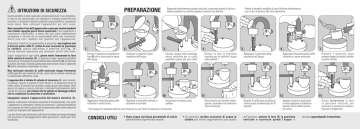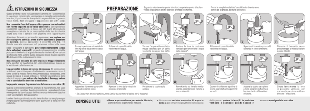 PREPARAZIONE ISTRUZIONI DI SICUREZZA Seguendo attentamente queste istruzioni, scoprirete quanto è facile e veloce preparare un ottimo espresso cremoso con Kamira. Presto le semplici modalità d’uso di Kamira diventeranno, con un po’ di pratica, del tutto spontanee. Questo prodotto è stato realizzato esclusivamente per l‘uso domestico. In caso di uso commerciale, uso improprio o mancata conformità alle istruzioni, il produttore declina qualsiasi responsabilità e la garanzia viene meno. Non utilizzare l‘apparecchio per altri scopi. Non consentire l’uso dell’apparecchio a persone (anche bambini) con ridotte capacità psico-fisico-sensoriali o con esperienza e conoscenze insufficienti, a meno che non siano attentamente sorvegliate e istruite da un responsabile della loro incolumità. Avere cura che i bambini non giochino con l’apparecchio. Attenzione, Kamira è un apparecchio a pressione: non togliere mai il braccio porta caffé (E), prima di aver scaricato la pressione in caldaia, questa operazione è descritta alla Fig. 14. Questa mancata operazione può provocare ustioni alla mano. 1 2 Portare in posizione orizzontale la leva (G) che si trova sotto la vasca dell’acqua. Dopo l’erogazione di ogni caffé, girare molto lentamente la leva della valvola di scarico (G); un’apertura troppo repentina potrebbe provocare la fuoriuscita di acqua bollente dalla vaschetta (C) con pericolo di ustioni alla mano. Durante questa operazione tenere chiuso il coperchio (B) della vaschetta e allontanare la mano. 3 Sollevare il coperchio della vaschetta dell’acqua. 5 4 Versare l’acqua nella vaschetta: mezza vaschetta per un caffè; vaschetta piena per due caffè. 6 Portare la leva in posizione verticale per far defluire l’acqua nella caldaia*. Abbassare il coperchio della vaschetta dell’acqua. 7 Sganciare il braccetto porta caffè ruotando in senso antiorario. Riempire il braccetto senza pressare troppo la miscela; livellare e pulire il bordo. Non utilizzate miscele di caffé macinato troppo finemente (caffé specifico per macchine da bar), usare solo le comuni miscele per la tradizionale caffettiera moka. L’apparecchio è dotato di valvola di sicurezza (I); sono normali, se saltuari, spruzzi di vapore e fischi dovuti a: un eccessivo carico di caffé; utilizzo di miscela non da moka; troppo acqua nella caldaia. Detti spruzzi di vapore e spruzzi indicano il normale funzionamento della valvola di sicurezza; per evitare che la valvola si danneggi evitare che le condizioni su descritte si verifichino. Impugnate sempre l’apparecchio dal manico atermico (A). Qualora si dovessero riscontrare anomalie di funzionamento, non usare l’apparecchio e contattare il centro di assistenza. L’azienda produttrice non risponde dei danni causati dall’inosservanza delle norme descritte e dall’uso improprio dell’apparecchio. Lasciare Kamira per distrazione sulla fonte di calore per tempi prolungati può provocare il danneggiamento delle guarnizioni e delle parti non metalliche. 9 8 Agganciare il braccetto porta caffè ruotando in senso orario. 10 Riportare la leva della valvola in posizione orizzontale. 11 Posizionare la tazzina sulla caldaia. * Se l’acqua non dovesse defluire, porre Kamira su una fonte di calore per 3-4 secondi. CONSIGLI UTILI • Usare acqua con bassa percentuale di calcio, preferibilmente oligominerale naturale. 12 Porre Kamira sul fornello mediogrande, accendere con fiamma a mezza intensità. • Un eventuale residuo eccessivo di acqua in caldaia può influire negativamente sulla qualità 13 Quando il caffè esce a palline di crema alzare la fiamma per 8-10 secondi. 14 Appena la tazzina sarà piena a metà spegnere la fiamma e lasciare che il caffè continui ad uscire. dell’espresso: portare la leva (G) in posizione verticale e scaricare quindi l’acqua in Girate lentamente la leva in posizione verticale, per scaricare la pressione residua e bloccare l’erogazione. eccesso capovolgendo la macchina. INDICAZIONI PER L’UTILIZZO PRIMO UTILIZZO Al primo utilizzo o dopo un periodo di inattività effettuare la pulizia del circuito dell’acqua per aromatizzare la macchina: basterà eseguire l’operazione di preparazione del caffè a perdere (procedere come per la preparazione normale dell’espresso), 2-3 volte, mettendo nel braccetto solo una minima quantità di miscela. PER UN ESPRESSO SEMPRE CALDO E CREMOSO A ogni utilizzo a macchina fredda, affinchè il primo caffè sia ben caldo, è sufficiente eseguire il INCONVENIENTI preriscaldamento: porre Kamira sulla fonte di calore con la leva (G) in posizione orizzontale e con la tazzina sulla caldaia sotto il tubetto di erogazione del caffè. Eseguire l’operazione per 10-15 secondi con fiamma a massima intensità. PER MOLTI CAFFÈ CONSECUTIVI SEMPRE CREMOSI Dovendo preparare molti caffé consecutivi è consigliabile raffreddare di volta in volta la caldaia tenendola 1-2 secondi sotto un getto di acqua corrente. Attenzione: prima di eseguire tale operazione, girate la leva (G) in posizione verticale. • Controllare con regolarità che tutti gli elementi che compongono Kamira siano integri, in particolare la guarnizione (D). • Lavare l’apparecchio, solo esternamente, con normale detersivo per stoviglie. • Mantenere pulita la sede della guarnizione. • Periodicamente si consiglia di eliminare il calcare che col tempo può accumularsi nella caldaia. Basterà versare dell’aceto (l’equivalente di due tazzine) nella caldaia attraverso la vaschetta dell’acqua. Fare agire l’aceto per 5-6 ore, portare la leva (G) in posizione verticale e svuotare il contenuto della caldaia capovolgendo Kamira, infine ripetere la procedura di Primo Utilizzo. • Utilizzare solo ricambi originali Kamira. GIRATE LA LEVA (G) IN POSIZIONE VERTICALE. PORRE LA MACCHINA SU UNA FONTE DI CALORE PER ALCUNI SECONDI. IL CAFFÉ NON ESCE. LA LEVA (G) È RIMASTA IN POSIZIONE VERTICALE. MANCA L’ACQUA NELLA CALDAIA. IL FILTRO DEL BRACCETTO È O