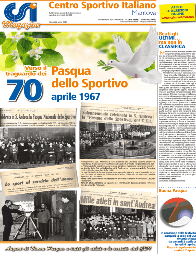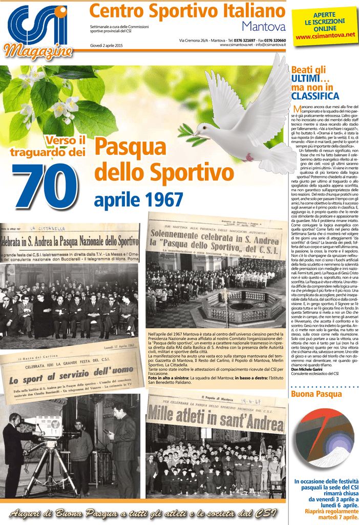 Centro Sportivo Italiano Mantova Settimanale a cura delle Commissioni sportive provinciali del CSI Magazine Giovedì 2 aprile 2015 Via Cremona 26/A - Mantova - Tel. 0376 321697 - Fax 0376 320660 www.csimantova.net - [email protected] APERTE LE ISCRIZIONI ONLINE www.csimantova.net Beati gli ULTIMI… ma non in CLASSIFICA M Verso il traguardo dei 70 Pasqua dello Sportivo aprile 1967 Nell’aprile del 1967 Mantova è stata al centro dell’universo ciessino perché la Presidenza Nazionale aveva affidato al nostro Comitato l’organizzazione della “Pasqua dello sportivo”, un evento a carattere nazionale trasmesso in ripresa diretta dalla RAI dalla Basilica di S. Andrea con la presenza delle Autorità civili, militari e sportive della città. La manifestazione ha avuto una vasta eco sulla stampa mantovana del tempo: Gazzetta di Mantova, Il Resto del Carlino, il Popolo di Mantova, Merlin Sportivo, La Cittadella. Tante sono state inoltre le attestazioni di compiacimento ricevute dal CSI per l’occasione. Foto in alto a sinistra: La squadra del Mantova; in basso a destra: l’Istituto San Benedetto Palidano. ancano ancora due mesi alla fine del campionato e la squadra del mio paese è già praticamente retrocessa. L’altro giorno ho incrociato uno dei membri dello staff tecnico mentre si stava recando allo stadio per l’allenamento. «Vai a torchiare i ragazzi?», gli ho buttato lì. «Oramai è tardi», è stata la sua risposta (in dialetto, per la verità). E io, di rimando: «Non è mai tardi, perché lo sport è sempre più importante della classifica». Un fatterello di nessun significato, non fosse che mi ha fatto balenare il celeberrimo detto evangelico riferito al regno dei cieli: «così gli ultimi saranno primi e i primi ultimi». Vi viene in mente qualcosa di più lontano dalla logica sportiva? Potremmo chiederlo al maratoneta giunto per ultimo al traguardo o allo spogliatoio della squadra appena sconfitta, ma non garantisco sull’appropriatezza delle loro reazioni. Del resto chiunque pratichi uno sport, anche solo per passare il tempo con gli amici, ha come obiettivo la vittoria, il successo sugli avversari e il primo posto in classifica. E, aggiungo io, è proprio questo che lo rende così stimolante da praticare e appassionante da guardare. Ma il problema rimane intatto. Come coniugare la logica evangelica con quella sportiva? Come farlo nel pieno della Settimana Santa che ci mostrerà nel volgere di tre giorni una serie di atteggiamenti “da sconfitto” di Gesù? La lavanda dei piedi, l’offerta del suo corpo e sangue nell’ultima cena, la passione, la croce, la morte e il sepolcro. Non c’è lo champagne da spruzzare nell’euforia del podio, non ci sono i fuochi artificiali della festa scudetto e nemmeno la solennità delle premiazioni con medaglie e inni nazionali. Fermi tutti, però. La Pasqua di Gesù Cristo non è solo questo e, soprattutto, non è una sconfitta. La Pasqua è vita e vittoria. Una vittoria difficile da comprendere nella logica umana che privilegia il più forte e il più ricco. Una vita complicata da accogliere, perché inseparabile dalla fiducia, dal sacrificio e dalla condivisione. E, in gergo sportivo, il Signore se l’è giocata tutta e se l’è giocata fino in fondo. In questa Settimana si rivela a noi un Dio che scende in campo, che non teme gli avversari e l’Avversario, che accetta il confronto e lo scontro. Gesù non tira indietro la gamba. Anzi, ci mette non solo la gamba, ma tutto se stesso, sulla croce come nella risurrezione. Solo così può portare a casa la vittoria, una vittoria che non è tanto per Lui (non ha di certo bisogno) quanto per noi. Una vittoria che si chiama vita, salvezza e amore. Uno stile di gioco e un senso del trionfo che non dovremmo mai dimenticare, né quando giochiamo né quando tifiamo. Don Michele Garini Consulente ecclesiastico del CSI Buona Pasqua Auguri di Buona Pasqua a tutti gli atleti e le società dal CSI In occasione delle festività pasquali la sede del CSI rimarrà chiusa da venerdì 3 aprile a lunedì 6 aprile. Riaprirà regolarmente martedì 7 aprile. 2 Magazine Giovedì 2 aprile 2015 CALCIO A 11 / Vignoni e Ival sole al comando A Rivoltella 2 spari in porta per il Real Girone A - Una sola squadra al comando nel girone A: è la Vignoni Castel Goffredo e la miglior posizione negli scontri diretti le permetterà di mantenere il primato sia nei confronti del Grazie Freddi, che ha solo un altro incontro da disputare, che della Marianese, ormai staccata di sei punti. Questo è il primo verdetto definitivo maturato grazie alla vittoria dei castellani contro i rivali del Colori Freddi, merito della doppietta di Pistoni che ha ribaltato l’iniziale vantaggio degli ospiti causato da un autorete di Fusari. Al terzo posto, momentaneamente, sale il Cerlongo che con il minimo scarto si prende i tre punti a Guidizzolo. Scende quindi dal podio la Marianese costretta ad abdicare a Gazoldo contro una brillante Torneria Pochì che si è messa alle spalle la cocente sconfitta di martedì scorso contro il Cerlongo battendo una diretta concorrente. Ora i ragazzi di Marco Gozzi sono ancora in piena corsa per i play off. Ma la squadra più favorita per accedere alle fasi finali resta il Casalpoglio che avrà un incontro in più da disputare rispetto alle altre e che sabato ha mostrato la propria forza e maturità battendo in trasferta il Casaloldo con il risultato più classico (2-0). Pesante il ko della Pozzolese per mano della Break Time, specializzata nel creare grattacapi alle grandi. Ore le speranze dei ragazzi di Brutti di agganciare almeno il quarto posto utile sono appese a un filo, forse troppo sottile per nutrire qualche ambizione. Girone B - E qualche verdetto è stato scritto anche nel girone B. E’ durato appena una settimana il primato del Bar La Torre, perché i poggesi non vanno oltre lo 0-0 a Marmirolo e allora ne approfitta subito l’Ival che effettua il controsorpasso dopo aver battuto a S. Si