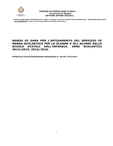 COMUNE DI POMIGLIANO D’ARCO (Provincia di Napoli) SETTORE AFFARI SOCIALI UFFICIO DI PIANO AMBITO TERRITORIALE N12 - CORSO V. EMANIELE, VICO RICCI, PIAZZETTA SAN GIOVANNI BOSCO – 80038 POMIGLIANO D’ARCO - TEL-FAX 0818033153 – email: [email protected]. BANDO DI GARA PER L’AFFIDAMENTO DEL SERVIZIO DI MENSA SCOLASTICA PER LE ALUNNE E GLI ALUNNI DELLE SCUOLE STATALI DELL’INFANZIA. ANNI SCOLASTICI 2014/2015, 2015/2016. APPROVATO CON DETERMINAZIONE DIRIGENZIALE N. 158 DEL 15/07/2014. 1 COMUNE DI POMIGLIANO D’ARCO (Provincia di Napoli) SETTORE AFFARI SOCIALI UFFICIO DI PIANO AMBITO TERRITORIALE N12 - CORSO V. EMANIELE, VICO RICCI, PIAZZETTA SAN GIOVANNI BOSCO – 80038 POMIGLIANO D’ARCO - TEL-FAX 0818033153 – email: [email protected]. Articolo 1 - Oggetto del Bando di gara e norme applicabili. 1. Il Comune di Pomigliano d’Arco indice una gara ad evidenza pubblica mediante procedura aperta per l’affidamento del servizio di mensa scolastica a favore delle alunne e degli alunni frequentanti le scuole statali dell’infanzia che insistono sul territorio del Comune di Pomigliano d’Arco. 2. Il presente bando di gara disciplina le procedure di appalto, i requisiti e le modalità di partecipazione alla gara, la documentazione da presentare, le modalità di presentazione e compilazione dell’offerta, e le condizioni di carattere generale regolanti la procedura di gara. 3. Il servizio oggetto del presente bando di gara rientra nella categoria n. 17, CPC 64 – CPV 55523100-3, Regolamento CE n. 213/2008 della Commissione del 28 novembre 2007, articolo 20 del D.lgs. n. 163/2006 e successive modificazioni e integrazioni. Codice gara: 5644895; Codice CIG: 5808155122. Si applicano, pertanto, gli articoli 65, 68 e 225 del D.lgs. n. 163/2006 e successive modificazioni e integrazioni. Le altre norme del D.lgs. n. 163/2006 e successive modificazioni e integrazioni trovano applicazione solo in quanto espressamente richiamate nel presente bando di gara e nel capitolato speciale di appalto. 4. Il soggetto affidatario del contratto di cui al presente bando di gara è tenuto ad eseguire in proprio il servizio di mensa scolastica. 5. Il contratto di appalto si intenderà risolto alla scadenza del termine stabilito, senza necessità di preventiva disdetta. 6. E’ esclusa la possibilità di rinnovo tacito del contratto. 7. Il responsabile del procedimento darà avvio all’esecuzione del contratto di appalto in via di urgenza, prima della stipula del contratto, in quanto la legge regionale n. 4 del 1 febbraio 2005 recante “Norme regionali per l’esercizio del diritto all’istruzione e alla formazione”, individua il servizio di mensa scolastica quale uno degli interventi idonei a rimuovere gli ostacoli che, di fatto, impediscono a tutti l’esercizio del diritto all’istruzione anche attraverso la generalizzazione del servizio pubblico della scuola dell’infanzia in modo da consentire la frequenza effettiva di tutti i bambini e le bambine dai 3 ai 6 anni. La mancata esecuzione immediata della prestazione dedotta nella presente gara determinerebbe, quindi, un danno all’interesse pubblico che è destinata a soddisfare. 2 COMUNE DI POMIGLIANO D’ARCO (Provincia di Napoli) SETTORE AFFARI SOCIALI UFFICIO DI PIANO AMBITO TERRITORIALE N12 - CORSO V. EMANIELE, VICO RICCI, PIAZZETTA SAN GIOVANNI BOSCO – 80038 POMIGLIANO D’ARCO - TEL-FAX 0818033153 – email: [email protected]. Articolo 2 – Amministrazione aggiudicatrice. 1. L’ Amministrazione aggiudicatrice è il Comune di Pomigliano d’Arco. La stazione appaltante è il Settore Affari Sociali – Ufficio di Piano – Corso V. Emanuele, Vico Ricci, Piazzetta S. Giovanni Bosco – 80038 Pomigliano d’Arco (Na) – Telefono/telefax 0818033153 – Indirizzo elettronico: www.comune.pomiglianodarco.gov.it. Email: [email protected]. 2. I concorrenti dovranno far pervenire il plico contenente l’offerta e la documentazione richiesta dal presente bando di gara, pena l’esclusione dalla gara, esclusivamente al seguente indirizzo: Settore Affari Sociali del Comune di Pomigliano d’Arco – Ufficio di Piano. Ufficio Protocollo Generale, Piazza Municipio, 1 – 80038 Pomigliano d’Arco (Na). Articolo 3 - Caratteristiche del servizio di mensa scolastica. 1. L’appalto ha per oggetto il servizio di preparazione dei pasti in un centro di cottura e di somministrazione dei pasti preparati agli alunni e alle alunne delle scuole statali dell’infanzia che insistono sul territorio del Comune di Pomigliano d’Arco negli anni scolastici 2014/2015 e 2015/2016 secondo il seguente calendario di massima: inizio il giorno 13 ottobre 2014 e termine il giorno 31 maggio 2015 per l’anno scolastico 2014/2015. Inizio il giorno 13 ottobre 2015 e termine il giorno 31 maggio 2016 per l’anno scolastico 2015/2016. Le date di inizio e di fine servizio possono subire variazioni secondo inappellabili decisioni della stazione appaltante. In tal caso le imprese concorrenti, nella definizione delle offerte economiche, e l’impresa aggiudicataria, nella esecuzione del contratto di appalto, non hanno nulla a pretendere, dall’Amministrazione aggiudicatrice, in termini di eventuali danni subiti a seguito delle predette variazioni. 2. I pasti devono essere trasportati dal centro di cottura ai plessi scolastici delle scuole dell’infanzia statali che usufruiranno del servizio di mensa scolastica, con mezzi di trasporto del concorrente e somministrati con personale del concorrente. 3. L’appalto prevede un passaggio di cantiere che riguarda complessivamente n. 30 lavoratori di cui 24 operatori di mensa e 6 autisti. 4. Il tipo di ristorazione collettiva cui si riferisce il presente bando di gara, è generalmente definito “a legame caldo”. Con tale termine, nel presente bando di gara, si intende la condizione nella quale i pasti vengono preparati in un centro di cottura, confezionati e 3 COMUNE DI POMIGLIANO D’ARCO (Provincia di Napoli) SETTORE AFFARI SOCIALI UFFICI