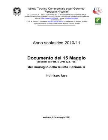 Istituto Tecnico Commerciale e per Geometri “Ferruccio Niccolini” Via Guarnacci, 6 – 56048 Volterra PI - Tel. + 39 0588 88506 Fax +39 0588 86626 Codice ministeriale PITD04000B – Codice Fiscale 83001950506 Partita IVA 01604880508 Internet http://www.itcniccolini.it e-mail [email protected] sezioni staccate: I.T.I.S. “A. Santucci”, Pomarance [email protected] - Casa Penale “R. Graziani”, Volterra Agenzia Formativa – Codice accreditamento Regione Toscana: PI0589 Anno scolastico 2010/11 Documento del 15 Maggio (ai sensi dell’art. 5 DPR 323 / ’98) del Consiglio della Quinta Sezione C Indirizzo: Igea Volterra, li 14 maggio 2011 Documento 15 maggio 2010/2011-05-05 5^ C Igea Pag 2 su 58 INDICE 1. 2. 3. 4. 5. 6. Composizione della classe:..................................................................................................3 Composizione del Consiglio di classe dell’ultimo anno: ..................................................3 Breve storia della classe:......................................................................................................4 Risultati dello scrutinio finale della classe Terza e Quarta..............................................4 Continuità didattica nel triennio: ..........................................................................................4 Frequenza alle lezioni, rapporti interpersonali, partecipazione al dialogo formativo e collaborazione nello svolgimento delle attività studentesche: ........................................4 7. Livello della preparazione iniziale della classe nell’ultimo anno, relativamente a conoscenze, competenze, capacità....................................................................................4 8. Obiettivi trasversali esplicitati nella programmazione di inizio anno: ............................5 9. Profilo formativo della classe in uscita: ..............................................................................5 10. Argomenti/attività pluridisciplinari ........................................................................................6 11. Attività di Laboratorio programmate e realizzate nell’ultimo anno : ...............................6 12. Attività extracurricolari programmate e realizzate: ...........................................................6 Tipologia di prove, elaborati, esercitazioni realizzate durante l’ultimo anno per verifiche e prove di misurazione : ...........................................................................................................6 13. Quadro riassuntivo delle verifiche scritte : .........................................................................6 14. Criteri per le valutazioni intermedie e finali: .......................................................................7 15. Griglia di valutazione della prova scritta di italiano ..........................................................7 16. Valutazione Seconda Prova Scritta: Economia Aziendale..............................................8 17. Indicatori e descrittori della valutazione ...........................................................................10 18. Griglia di valutazione per la terza prova: tipologia mista (4 domande a risposta multipla e 2 a risposta aperta per ogni disciplina) ..........................................................11 19. Colloquio pluridisciplinare..................................................................................................12 20. Attività di recupero e sostegno : ........................................................................................13 21. Simulazione della Terza Prova (tipologia mista 4 domande a .....................................13 risposta multipla e due a risposta aperta per ogni disciplina) ..................................................13 22. Criteri per il riconoscimento del Credito formativo: ........................................................13 23. Elenco degli allegati ............................................................................................................14 Programmi effettivamente svolti e Relazione finale di ogni docente: ................................14 24. Prospetto delle firme dei docenti del Consiglio di classe ..............................................58 Esame di stato anno scolastico 2010/2011 Documento 15 maggio 2010/2011-05-05 5^ C Igea Pag 3 1. Composizione della classe: La classe è composta da n. 13 studenti (5 ragazzi e 8 ragazze) 1 Bagnoli Dana 2 Carpineta Sara 3 Colivicchi Niccolò 4 Di Nardo Silvia 5 Fidanzi Francesca 6 Guerrieri Flavia 7 Innocenti Cristina 8 Lucaccini Enrico 9 Mazzinghi Francesca 10 Onnis Jasmine 11 Ragoni Mattia 12 Rosetti Francesco 13 Stamilla Marco 2. Composizione del Consiglio di classe dell’ultimo anno: Docente Disciplina Amidei Brunetta Gennai Ilaria Stefanelli Francesco Vannozzi Massimo Pacchini Andrea Giaquinto Alvina Osso Nuccio Ferri Arianna Righi Maurizio Veracini Roberto Religione Tedesco Matematica Economia aziendale Educazione fisica Diritto e Scienza delle finanze Francese Geografia economica Inglese Italiano e Storia Esame di stato anno scolastico 2010/2011 su 58 Documento 15 maggio 2010/2011-05-05 5^ C Igea Pag 4 su 58 3. Breve storia della classe: Tutti gli studenti, salvo una alunna, sono di Volterra. La classe si attesta su livelli medi, con qualche eccellenza in buona parte delle materie. Nel complesso, in questi anni il profitto è stato positivo e gli studenti si sono mostrati, per lo più, attivi e presenti nelle diverse attività collaterali che li hanno coinvolti. 4. Risultati dello scrutinio finale della classe Terza e Quarta Anno Classe Iscritti 2008/2009 2009/2010 Terza Quarta 13 13 Sospensione del giudizio 3 4 Promossi 13 13 5. Continuità didattica nel triennio: Per tre anni : Storia, Italiano, Inglese, Religione, Francese, Educazione fisica. Per due anni : Geografia economica, Matematica. Per Economia aziendale si segnala il cambio di docenza per ogni anno del trienn