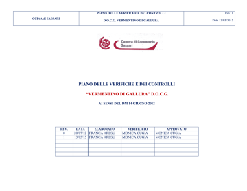 Rev. 1 PIANO DELLE VERIFICHE E DEI CONTROLLI CCIAA di SASSARI Data 13/05/2015 D.O.C.G. VERMENTINO DI GALLURA PIANO DELLE VERIFICHE E DEI CONTROLLI “VERMENTINO DI GALLURA” D.O.C.G. AI SENSI DEL DM 14 GIUGNO 2012 REV. 0 1 ELABORATO VERIFICATO 20/07/12 FRANCA ARESU 13/05/15 FRANCA ARESU DATA MONICA CUGIA MONICA CUGIA APPROVATO MONICA CUGIA MONICA CUGIA Rev. 1 PIANO DELLE VERIFICHE E DEI CONTROLLI CCIAA di SASSARI VITICOLTORE Soggett o 2 3 4 5 6 7 8 9 10 Fase di processo Requisiti Acquisizione documentazione (anche per via telematica) Attività di controllo Tipo di controllo Entità del controllo per anno Non conformità NC Gravità della NC Azione Correttiva Produzione delle uve a D.O.C.G. Vermentino di Gallura 1 Data 13/05/2015 D.O.C.G. VERMENTINO DI GALLURA Rispetto delle regole del disciplinare di produzione Rispetto dei limiti di resa di uva per ettaro previsti dal disciplinare di produzione e dalla normativa nazionale e comunitaria Acquisizione della documentazione necessaria ai fini della verifica ispettiva Verifica presso le aziende viticole della persistenza delle condizioni per l'iscrizione allo schedario viticolo con la verifica dell’osservanza delle disposizioni di tipo agronomico previste nel disciplinare di produzione Verifica ispettiva annuale ante vendemmia presso le aziende viticole per stimare la resa di uva per ettaro I 10% Non rispondenza alle disposizioni di tipo agronomico previste dal disciplinare Lievi ai sensi dell’art. 4 comma 6.. Richiesta di adeguamento della produzione con presentazione della modifica del dato contenuto nello schedario viticolo Perdita dei requisiti tecnico produttivi per l’idoneità alla D.O. Non conformità già considerate lievi, che non sono state risolte con azioni correttive Supero resa massima consentita dalla normativa nazionale e comunitaria Non conformità già considerate lievi che non sono state risolte con azioni correttive Grave Lieve Grave Richiesta di adeguamento della produzione con presentazione di eventuale dichiarazione di rinuncia alla D.O. con riscontro con la dichiarazione vendemmiale e/o di produzione o con nuova visita ispettiva ante vendemmia Rev. 1 PIANO DELLE VERIFICHE E DEI CONTROLLI CCIAA di SASSARI 1 Soggett o 2 3 4 5 6 Fase di processo Requisiti Acquisizione documentazione (anche per via telematica) Attività di controllo Tipo di controllo Commercializzazione delle uve a D.O.C.G. Vermentino di Gallura INTERMEDIARI DELLE UVE DESTINATE ALLA VINIFICAZIONE Iscrizione all’Organismo di controllo Rispetto delle regole del disciplinare di produzione Invio da parte del destinatario della copia documento di trasporto delle uve destinate alla D.O. e delle comunicazioni relative ad altre operazioni che generano modifiche del carico contabile (riclassificazioni, ecc.) Acquisizione della documentazione necessaria ai fini della verifica ispettiva Rispetto della normativa nazionale e comunitaria sui documenti di trasporto e sulla tenuta dei registri di cantina Data 13/05/2015 D.O.C.G. VERMENTINO DI GALLURA D 7 8 9 10 Entità del controllo per anno Non conformità NC Gravità della NC Azione Correttiva 100% Carenza documentazione; Controllo ai fini della rispondenza quantitativa sulle movimentazione di carico e scarico delle uve destinate alla DO Errori formali relativi alla documentazione di carico e scarico delle uve destinate a D.O. Non conformità già considerate lievi, che non sono state risolte con azioni correttive Verifica ispettiva annuale presso le aziende intermediatrici, per accertare: - la corrispondenza quantitativa del prodotto detenuto con riscontro ai relativi documenti e registri di cantina - la rispondenza con i requisiti previsti dal disciplinare Lieve I 10% Errori formali relativi alla documentazione di carico e scarico delle uve destinate a DO o alla omessa o irregolare tenuta della contabilità obbligatoria Non rispondenza dei quantitativi detenuti con la documentazione e i registri di carico e scarico Grave Lieve Grave Non conformità già considerate lievi, che non sono state risolte con azioni correttive Non rispondenza dei requisiti previsti dal disciplinare di produzione Richiesta di adeguamento con presentazione e/o integrazione della documentazione relativa al carico di uva o errori formali, o quant’altro necessario alla risoluzione della N.C. rilevata con verifica di riscontro documentale Grave Richiesta di adeguamento con presentazione e/o integrazione della documentazione relativa al carico di vino o errori formali, o quant’altro necessario alla risoluzione della N.C. rilevata con nuova visita ispettiva Rev. 1 PIANO DELLE VERIFICHE E DEI CONTROLLI CCIAA di SASSARI 1 2 3 4 5 6 Soggetto Fase di processo Requisiti Acquisizione documentazione (anche per via telematica) Attività di controllo Tipo di controllo Iscrizione all’Organismo di controllo Rispetto delle regole del disciplinare di produzione Invio da parte del destinatario della copia documento di trasporto dei vini a DO e atti alla DO commercializzati sfusi e delle comunicazioni delle movimentazioni e pratiche enologiche sul vino a DO e atto alla DO in grado di modificarne i carichi (tagli, assemblaggi, riclassificazioni, declassamenti, ecc.) Controllo ai fini della rispondenza quantitativa sui carichi e sulle movimentazioni dei vini a DO e atti alla DO D 7 Entità del controllo per anno 100% Produzione Vino D.O.C.G. Vermentino di Gallura VINIFICATORE Per i vini atti alla DO, richiesta di prelievo per utilizzo della DO Verifica della coerenza dei carichi di vino a DO e atto alla DO con la dichiarazione vendemmiale e/o della dichiarazione di produzione Rispetto della normativa nazionale e comunitaria sui documenti di trasporto e sulla tenuta dei registri di cantina 9 10 Non conformità NC Gravità della NC Azione Correttiva Carenza documentazione Supero della resa di uva in vino in base a quanto stabilito dal disciplinare Lieve Richiesta di adeguamento con presentazione e/o integrazione della documentazione relativa al carico d