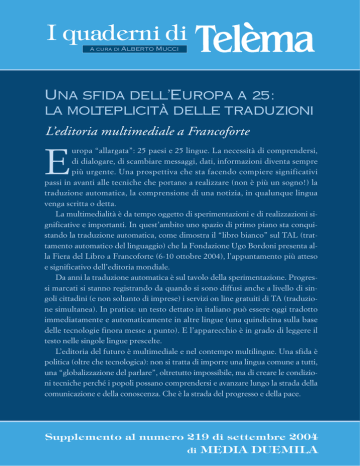 I quaderni di A cura di Alberto Mucci Una sfida dell’Europa a 25: la molteplicità delle traduzioni L’editoria multimediale a Francoforte uropa “allargata”: 25 paesi e 25 lingue. La necessità di comprendersi, di dialogare, di scambiare messaggi, dati, informazioni diventa sempre più urgente. Una prospettiva che sta facendo compiere significativi passi in avanti alle tecniche che portano a realizzare (non è più un sogno!) la traduzione automatica, la comprensione di una notizia, in qualunque lingua venga scritta o detta. La multimedialità è da tempo oggetto di sperimentazioni e di realizzazioni significative e importanti. In quest’ambito uno spazio di primo piano sta conquistando la traduzione automatica, come dimostra il “libro bianco” sul TAL (trattamento automatico del linguaggio) che la Fondazione Ugo Bordoni presenta alla Fiera del Libro a Francoforte (6-10 ottobre 2004), l’appuntamento più atteso e significativo dell’editoria mondiale. Da anni la traduzione automatica è sul tavolo della sperimentazione. Progressi marcati si stanno registrando da quando si sono diffusi anche a livello di singoli cittadini (e non soltanto di imprese) i servizi on line gratuiti di TA (traduzione simultanea). In pratica: un testo dettato in italiano può essere oggi tradotto immediatamente e automaticamente in altre lingue (una quindicina sulla base delle tecnologie finora messe a punto). E l’apparecchio è in grado di leggere il testo nelle singole lingue prescelte. L’editoria del futuro è multimediale e nel contempo multilingue. Una sfida è politica (oltre che tecnologica): non si tratta di imporre una lingua comune a tutti, una “globalizzazione del parlare”, oltretutto impossibile, ma di creare le condizioni tecniche perché i popoli possano comprendersi e avanzare lungo la strada della comunicazione e della conoscenza. Che è la strada del progresso e della pace. E Supplemento al numero 219 di settembre 2004 di MEDIA DUEMILA INDICE Il “libro bianco” sul TAL 59 Dal sogno meccanico alla e-translation – la traduzione automatica è diventata realtà? 60 Traduzione automatica: storia, situazione e prospettive 67 Comunicare con le tecnologie del linguaggio nell’era globale 71 L’informatica a sostegno del multilinguismo: il servizio di traduzione della Commissione europea 79 Il Quaderno è stato realizzato dalla Fondazione Ugo Bordoni (Presidente il Prof. Giordano Bruno Guerri, Direttore Generale il Consigliere Guido Salerno, Direttore delle Ricerche l’Ing. Mario Frullone). Coordinatore del Quaderno l’ing. Andrea Paoloni. Hanno collaborato: Andrea Di Carlo, Fondazione Ugo Bordoni; Johanna Monti, Università degli Studi di Napoli “L’Orientale”; Claudio Cirilli, SYNTHEMA s.r.l.; Gianni Lazzari, Itc-irst; Elisa Ranucci-Fischer, DGT. Sono usciti: I satelliti nella società multimediale Telefonia mobile e emissioni elettromagnetiche Le reti di telecomunicazioni diventano intelligenti Mentre viaggi lavori con Internet Come garantire sicurezza con lo sviluppo di Internet Le macchine che parlano Le macchine che capiscono Il progresso tecnologico fra brevetti e standard La rendicontazione? Automatica, ma… Le nuove tecnologie fotoniche Il progetto Galileo sta diventando realtà Non confondere la biometrica con il “grande fratello Dal call center al contact center dicembre-gennaio 2003 febbraio 2003 marzo 2003 aprile 2003 maggio 2003 giugno 2003 luglio-agosto 2003 settembre 2003 ottobre 2003 novembre 2003 dicembre-gennaio 2004 febbraio 2004 marzo 2004 La larga banda si diffonde cambia la vita della gente aprile 2004 I campi elettromagnetici non sono più “sconosciuti” maggio 2004 Anche l’Italia si dota di un organismo che certifica la sicurezza informatica Il digitale terrestre accende i motori giugno 2004 luglio-agosto 2004 Una sfida dell’Europa a 25: la molteplicità delle traduzioni Il “libro bianco” sul TAL I l ForumTAL sul trattamento automatico del linguaggio, costituito presso il ministero delle comunicazioni con l’obiettivo di supportare la ricerca e lo sviluppo nelle tematiche della comunicazione parlata e scritta (Trattamento Automatico del Linguaggio TAL), ha individuato come suo primo obiettivo la stesura di un libro bianco che fornisca, nel medesimo tempo, un riferimento sullo stato dell’arte di questa tecnologia e una guida del mercato italiano delle tecnologie del linguaggio contenente l’elenco completo degli Enti interessati al TAL nell’ambito della ricerca, della formazione e dell’industria. Il Libro Bianco sul TAL vuole pertanto essere uno strumento di lavoro per tutti coloro che svolgono un’attività nel campo della linguistica computazionale e soprattutto una guida per coloro che sono interessanti ad introdurre queste tecnologie nella loro attività per migliorare l’impatto della loro offerta commerciale. Il Libro Bianco parte dalla definizione di cosa sia il TAL, e il compito non è facile perché il trattamento del linguaggio pervade molte applicazioni senza identificarsi nella relativa tecnologia di riferimento. Si pensi ai telefonini, che contengono numerose tecnologie TAL, relative sia all’elaborazione del parlato, come la codifica della voce alla base della tecnologia “GSM”, sia il riconoscimento del parlato, per consentire di effettuare una chiamata senza comporre il numero di telefono ma semplicemente pronunciando un nome, sia l’elaborazione del testo, si pensi alle tecniche di scrittura degli SMS; nonostante ciò il cellulare non viene identificato come prodotto TAL. Un altro esempio di uso inconsapevole della tecnologia TAL è il correttore di testi (in genere disponibile per varie lingue) che tutti abbiamo sul computer, che Settembre 2004 tutti usiamo, soprattutto per evitare i refusi; un altro esempio è costituito dai sistemi di traduzione automatica, che permettono anche a chi non conosce una lingua di avere almeno un’idea del contenuto di un messaggio o di una pagina web. Il testo present