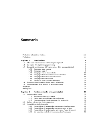 Sommario Prefazione all’edizione italiana Prefazione Capitolo 1 Introduzione 1.1 1.2 1.3 Che cos’è l’elaborazione dell’immagine digitale? Le origini del digital image processing Esempi di applicazione dell’elaborazione delle immagini digitali 1.3.1 Imaging a raggi gamma 1.3.2 Imaging a raggi X 1.3.3 Imaging a bande ultraviolette 1.3.4 Imaging nelle bande infrarosse e del visibile 1.3.5 Imaging nella banda delle microonde 1.3.6 Imaging nella banda radio 1.3.7 Esempi di altre modalità di imaging 1.4 Processi di base tipici del digital image processing 1.5 Le componenti di un sistema di image processing Riepilogo Bibliografia Capitolo 2 2.1 2.2 2.3 Fondamenti delle immagini digitali La percezione visiva 2.1.1 Struttura dell’occhio umano 2.1.2 La formazione dell’immagine nell’occhio 2.1.3 Adattamento e discriminazione alla luminosità La luce e lo spettro elettromagnetico Acquisizione delle immagini 2.3.1 Acquisizione di immagini attraverso un singolo sensore 2.3.2 Acquisizione di immagini attraverso sensori in linea 2.3.3 Acquisizione di un’immagine attraverso l’array di sensori 2.3.4 Un semplice modello di creazione di un’immagine xiii xv 1 1 3 7 7 8 11 13 19 20 21 26 28 30 31 35 35 36 38 38 43 46 46 48 49 50 vi Sommario 2.4 Campionamento e quantizzazione delle immagini 2.4.1 Concetti base di campionamento e quantizzazione 2.4.2 Rappresentazione delle immagini digitali 2.4.3 Risoluzione spaziale e di intensità 2.4.4 Interpolazione di un’immagine 2.5 Alcune relazioni di base tra pixel 2.5.1 Intorno di un pixel 2.5.2 Adiacenza, connettività, regioni e bordo 2.5.3 Misure di distanza 2.6 Introduzione agli strumenti matematici usati nell’elaborazione delle immagini digitali 2.6.1 Operazioni matriciali e puntuali 2.6.2 Operazioni lineari e non lineari 2.6.3 Operazioni aritmetiche 2.6.4 Insiemi e operazioni logiche 2.6.5 Operazioni spaziali 2.6.6 Operazioni vettoriali e matriciali 2.6.7 Trasformazioni di immagini 2.6.8 Metodi probabilistici Riepilogo Bibliografia Problemi Capitolo 3 3.1 3.2 3.3 3.4 3.5 51 52 53 57 63 66 66 66 68 70 70 70 72 77 82 88 90 93 95 96 97 Trasformazioni di intensità e filtraggio spaziale 101 Background 3.1.1 Fondamenti di trasformazioni di intensità e filtraggio spaziale 3.1.2 Esempi di questo capitolo Alcune funzioni per la trasformazione di intensità 3.2.1 Negativi dell’immagine 3.2.2 Trasformazioni logaritmiche 3.2.3 Trasformazioni di potenza (gamma) 3.2.4 Funzioni di trasformazione lineare a tratti Elaborazione di istogrammi 3.3.1 Equalizzazione di istogrammi 3.3.2 Matching tra istogrammi 3.3.3 Elaborazione locale degli istogrammi 3.3.4 Utilizzo delle statistiche di un istogramma per il miglioramento dell’immagine Elementi di base del filtraggio spaziale 3.4.1 Funzionamento del filtraggio spaziale 3.4.2 Correlazione e convoluzione spaziale 3.4.3 Rappresentazione vettoriale del filtraggio lineare 3.4.4 Creazione di maschere per filtri spaziali Filtri spaziali di smoothing 3.5.1 Filtri lineari di smoothing 3.5.2 Filtri (non lineari) basati sulle statistiche d’ordine 101 101 104 104 104 106 107 111 115 116 123 132 134 139 139 141 144 145 146 146 148 Sommario 3.6 Filtri spaziali di sharpening 3.6.1 Fondamenti 3.6.2 Utilizzo delle derivate seconde per lo sharpening: il metodo laplaciano 3.6.3 Unsharp masking e filtraggio highboost 3.6.4 Uso delle derivate del primo ordine per lo sharpening (non lineare) delle immagini: il gradiente 3.7 Combinazione di metodi spaziali 3.8 Uso di tecniche fuzzy per le trasformazioni di intensità e il filtraggio spaziale 3.8.1 Introduzione 3.8.2 Principi della teoria degli insiemi fuzzy 3.8.3 Utilizzo degli insiemi fuzzy 3.8.4 Utilizzo di insiemi fuzzy per le trasformazioni di intensità 3.8.5 Utilizzo degli insiemi fuzzy per il filtraggio spaziale Riepilogo Bibliografia Problemi Capitolo 4 4.1 4.2 4.3 4.4 4.5 Filtraggio nel dominio della frequenza Background 4.1.1 Breve storia delle serie e della trasformata di Fourier 4.1.2 Esempi di questo capitolo Concetti preliminari 4.2.1 Numeri complessi 4.2.2 Serie di Fourier 4.2.3 Impulsi e proprietà di sifting 4.2.4 La trasformata di Fourier di una variabile continua 4.2.5 Convoluzione Campionamento e trasformata di Fourier di funzioni campionate 4.3.1 Campionamento 4.3.2 La trasformata di Fuorier di funzioni campionate 4.3.3 Il teorema del campionamento 4.3.4 Aliasing 4.3.5 Ricostruzione (recupero) di una funzione dai dati campionati Trasformata discreta di Fourier (DFT, Discrete Fourier Trasform) a una variabile 4.4.1 Ottenere la DFT da una trasformata continua di una funzione campionata 4.4.2 Relazioni fra il campionamento e gli intervalli in frequenza Estensione alle funzioni a due variabili 4.5.1 Impulso 2-D e la sua proprietà di sifting 4.5.2 Coppia di Fourier continua 2-D 4.5.3 Campionamento bidimensionale e teorema del campionamento 2-D 4.5.4 Aliasing nelle immagini vii 151 151 153 156 158 162 165 165 166 170 179 181 183 184 185 191 192 192 193 193 193 194 195 196 201 202 202 203 205 208 211 211 212 214 216 216 217 218 220 viii Sommario 4.5.5 La trasformata discreta di Fourier 2-D e la sua inversa Alcune proprietà della trasformata discreta di Fourier 2-D 4.6.1 Relazione tra gli intervalli spaziali e gli intervalli della frequenza 4.6.2 Traslazione e rotazione 4.6.3 Periodicità 4.6.4 Proprietà di simmetria 4.6.5 Spettro di Fourier e angolo di fase 4.6.6 Teorema della convoluzione 2-D 4.6.7 Riepilogo delle proprietà della trasformata discreta di Fourier 2-D 4.7 Le basi per il filtraggio nel dominio della frequenza 4.7.1 Caratteristiche aggiuntive del dominio della frequenza 4.7.2 Filtraggio nel dominio della frequenza 4.7.3 Riepilogo delle procedure di filtraggio nel dominio della frequenza 4.7.4 Corrispondenza tra il filtraggio nel dominio spaziale e quello nel dominio della frequenza 4.8 Smoothing di un’immagine utilizzando i filtri nel dominio della frequenza 4.8.1 Filtri low pass ideali 4.8.2 Filtri low pass di Butterworth 4.8.3 Filtri low 