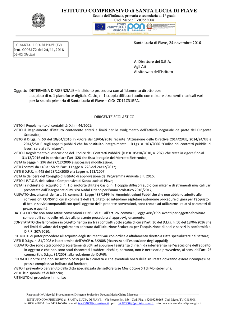 ISTITUTO COMPRENSIVO di SANTA LUCIA DI PIAVE Scuole dell’infanzia, primaria e secondaria di 1° grado Cod. Mecc.: TVIC853008 Santa Lucia di Piave, 24 novembre 2016 Al Direttore dei S.G.A. Agli Atti Al sito web dell’Istituto Oggetto: DETERMINA DIRIGENZIALE – Indizione procedura con affidamento diretto per: acquisto di n. 1 pianoforte digitale Casio, n. 1 coppia diffusori audio con mixer e strumenti musicali vari per la scuola primaria di Santa Lucia di Piave – CIG: ZD11C31BFA. IL DIRIGENTE SCOLASTICO VISTO il Regolamento di contabilità D.I. n. 44/2001; VISTO il Regolamento d’istituto contenente criteri e limiti per lo svolgimento dell’attività negoziale da parte del Dirigente Scolastico; VISTO il D.Lgs. n. 50 del 18/04/2016 in vigore dal 19/04/2016 recante “Attuazione delle Direttive 2014/23UE, 2014/24/UE e 2014/25/UE sugli appalti pubblici che ha sostituito integralmente il D.Lgs. n. 163/2006 “Codice dei contratti pubblici di lavori, servizi e forniture”; VISTO il Regolamento di esecuzione del Codice dei Contratti Pubblici (D.P.R. 05/10/2010, n. 207) che resta in vigore fino al 31/12/2016 ed in particolare l’art. 328 che fissa le regole del Mercato Elettronico; VISTA la Legge n. 296 del 27/12/2006 e successive modificazioni; VISTI i commi da 149 a 158 dell’art. 1 Legge n. 228 del 24/12/2012; VISTI il D.P.R. n. 445 del 28/12/2000 e la Legge n. 123/2007; VISTA la delibera del Consiglio di Istituto di approvazione del Programma Annuale E.F. 2016; VISTO il P.T.O.F. dell’Istituto Comprensivo di Santa Lucia di Piave; VISTA la richiesta di acquisto di n. 1 pianoforte digitale Casio, n. 1 coppia diffusori audio con mixer e di strumenti musicali vari presentata dall’insegnante di musica Nadal Tiziano per l’anno scolastico 2016/2017; RILEVATO che, ai sensi dell’art. 26, comma 3, Legge 488/1999, le Amministrazioni Pubbliche che non abbiano aderito alle convenzioni CONSIP di cui al comma 1 dell’art. citato, ed intendano espletare autonome procedure di gara per l’acquisto di beni e servizi comparabili con quelli oggetto delle predette convenzioni, sono tenute ad utilizzarne i relativi parametri di prezzo e qualità; DATO ATTO che non sono attive convenzioni CONSIP di cui all’art. 26, comma 1, Legge 488/1999 aventi per oggetto forniture comparabili con quelle relative alla presente procedura di approvvigionamento; CONSTATATO che la fornitura in oggetto rientra sia tra i contratti sotto soglia di cui all’art. 36 del D.Lgs. n. 50 del 18/04/2016 che nei limiti di valore del regolamento adottato dall’Istituzione Scolastica per l’acquisizione di beni e servizi in conformità al D.P.R. 207/2010; RITENUTO di poter procedere all’acquisto degli strumenti vari con ordine e affidamento diretto a Ditte specializzate nel settore; VISTI il D.Lgs. n. 81/2008 e la determina dell’AVCP n. 3/2008 (sicurezza nell’esecuzione degli appalti); RILEVATO che sono stati condotti accertamenti volti ad appurare l’esistenza di rischi da interferenza nell’esecuzione dell’appalto in oggetto e che non sono stati riscontrati i suddetti rischi e, pertanto, non è necessario provvedere, ai sensi dell’art. 26 comma 3bis D.Lgs. 81/2008, alla redazione del DUVRI; RILEVATO inoltre che non sussistono costi per la sicurezza e che eventuali oneri della sicurezza dovranno essere ricompresi nel prezzo complessivo indicato dal fornitore; VISTO il preventivo pervenuto dalla ditta specializzata del settore Esse Music Store Srl di Montebelluna; VISTE le disponibilità di bilancio; RITENUTO di procedere in merito; Responsabile Unico del Procedimento: Dirigente Scolastico Dott.ssa Maria Chiara Massenz -----------------------------------------------------------ISTITUTO COMPRENSIVO di SANTA LUCIA DI PIAVE – Via Foresto Est, 1/b – Cod. Fisc. : 82003230263 Cod. Mecc. TVIC853008 – tel 0438 460133 Fax 0438 460416 e.mail: [email protected] pec: [email protected] sito: www.icsantaluciadipiave.gov.it ISTITUTO COMPRENSIVO di SANTA LUCIA DI PIAVE Scuole dell’infanzia, primaria e secondaria di 1° grado Cod. Mecc.: TVIC853008 DETERMINA 1. di indire, per le motivazioni in premessa e con le modalità previste dal D.P.R. 207/2010, una procedura per l’acquisto, con affidamento diretto alla Ditta Esse Music Store Srl di Montebelluna dei seguenti articoli: DESCRIZIONE METALLOFONO APRX (25 PIASTE SEPARABILI) BATTENTE LEGNO PER METALLOFONO (MISTI) GUIRO COMET 301190 PLASTIC MARACAS NINO 582 TAMBOURINE SCHALLOCH VIMINI BITONALE LINKO WOOD BLOCK G37L COPPIA LEGNETTI ACACIA SCHAGWERK CL8105 CABASA MEDIUM SCHALLOCH TRIANGOLO STAGG TRI-4 TRIANGOLO STAGG TRI-6 TRIANGOLO STAGG TRI-8 TRIANGOLO GEWA 25 CM COD.827525 OCEAN DRUM REMO ET-0212-00 RAINMAKER SCHALLOCH LEGNO 120CM COPPIA DI PIATTI NINO B020 CHIMES LP ASPIRE LPA280 CAMPANELLINI DA MANO STAGG MOB-9 CAMPANELLINI HAYMAN HB-90 TAMBOURINE 10" STAGG STA-3110 TAMBURELLO COMET C301510 DJEMBE' MEINL PADJ2-M-G NATURAL HEAD WOOD BONGOS 3NT-BK NATURAL BLACK NINO XILOFONO XL15A 301837 PAIO MALLETS GEWA 821532 PAIO MALLETS GEWA 821534 PAIO MALLETS ANGEL 300940 PAIO MALLETS ANGEL 300941 PAIO MALLETS ANGEL 300942 PIANOFORTE DIGITALE CASIO PX160 SUPPORTO PER TASTIERA QUIK LOK T/20 DIFFUSORE (CASSE) AUDIO JBL EON 612 COPPIA STATIVI (ASTE) PER DIFFUSORI PROEL FRE300 MIXER PHONIC AM440D COPPIA MICROFONI PLAMARI TAKSTAR TS-6310HH SET CAVI DI COLLEGAMENTO PER AUDIO QUANTITA’ 01 10 02 03 03 04 04 01 02 02 02 02 01 01 01 01 04 02 03 03 01 01 01 01 01 01 01 01 01 01 02 01 01 01 01 con un impegno di spesa quale valore presunto pari a € 1.969,26 (millenovecentosessantanove/26) Iva esclusa; 2. di dare atto che non sussistono costi per la sicurezza per rischio da interferenza, in quanto non sono state rilevate interferenze; 3. di stabilire che gli eventuali oneri della sicurezza dovranno essere ricompresi nei prezzi complessivi indicati dai fornitori; 4. di effettuare l’ordine di acquisto con affidamento diretto alla Ditta Esse Music Store Srl di Montebelluna in quanto rispond