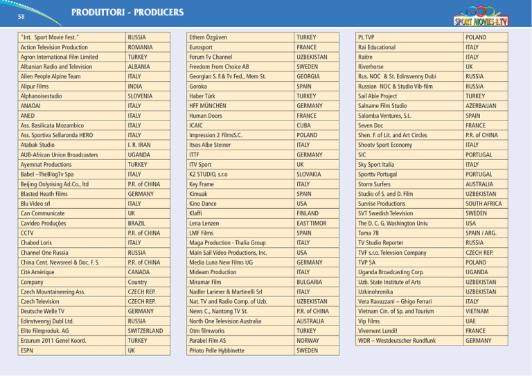 58 PRODUTTORI - PRODUCERS "Int. Sport Movie Fest." RUSSIA Ethem Özgüven TURKEY PL TVP POLAND Action Television Production ROMANIA Eurosport FRANCE Rai Educational ITALY Agron International Film Limited TURKEY Forum Tv Channel UZBEKISTAN Raitre ITALY Albanian Radio and Television ALBANIA Freedom From Choice AB SWEDEN Riverhorse UK Alien People Alpine Team ITALY Georgian S. F.& Tv Fed., Mem St. GEORGIA Rus. NOC & St. Edinsvenny Dubi RUSSIA Alipur Films INDIA Goroka SPAIN Russian NOC & Studio Vib-film RUSSIA Alphanoisestudio SLOVENIA Haber Türk TURKEY Sail Able Project TURKEY ANAOAI ITALY HFF MÜNCHEN GERMANY Salname Film Studio AZERBAIJAN ANED ITALY Human Doors FRANCE Salomba Ventures, S.L. SPAIN Ass. Basilicata Mozambico ITALY ICAIC CUBA Seven Doc FRANCE Ass. Sportiva Sellaronda HERO ITALY Impression 2 FilmsS.C. POLAND Shen. F. of Lit. and Art Circles P.R. of CHINA Atabak Studio I. R. IRAN Itsos Albe Steiner ITALY Shootv Sport Economy ITALY AUB-African Union Broadcasters UGANDA ITTF GERMANY SIC PORTUGAL Ayemnat Productions TURKEY ITV Sport UK Sky Sport Italia ITALY Babel –TheBlogTv Spa ITALY K2 STUDIO, s.r.o SLOVAKIA Sporttv Portugal PORTUGAL Beijing Onlyrising Ad.Co., ltd P.R. of CHINA Key Frame ITALY Storm Surfers AUSTRALIA Blasted Heath Films GERMANY Kimuak SPAIN Studio of S. and D. Film UZBEKISTAN Blu Video srl ITALY Kino Dance USA Sunrise Productions SOUTH AFRICA Can Communicate UK Klaffi FINLAND SVT Swedish Television SWEDEN Cavídeo Produções BRAZIL Lena Lenzen EAST TIMOR The D. C. G. Washington Univ. USA CCTV P.R. of CHINA LMF Films SPAIN Toma 78 SPAIN / ARG. Chabod Loris ITALY Maga Production - Thalia Group ITALY TV Studio Reporter RUSSIA Channel One Russia RUSSIA Main Sail Video Productions, Inc. USA TVF s.r.o. Televsion Company CZECH REP. China Cent. Newsreel & Doc. F. S. P.R. of CHINA Media Luna New Films UG GERMANY TVP SA POLAND Cité Amérique CANADA Mideam Production ITALY Uganda Broadcasting Corp. UGANDA Company Country Miramar Film BULGARIA Uzb. State Institute of Arts UZBEKISTAN Czech Mountaineering Ass. CZECH REP. Nadler Larimer & Martinelli Srl ITALY Uzkinohronika UZBEKISTAN Czech Television CZECH REP. Nat. TV and Radio Comp. of Uzb. UZBEKISTAN Vera Ravazzani – Ghigo Ferrari ITALY Deutsche Welle TV GERMANY News C., Nantong TV St. P.R. of CHINA Vietnam Cin. of Sp. and Tourism VIETNAM Edinstvennyj Dubl Ltd. RUSSIA North One Television Australia AUSTRALIA Vip Films UAE Elite Filmproduk. AG SWITZERLAND Otm filmworks TURKEY Vivement Lundi! FRANCE Erzurum 2011 Genel Koord. TURKEY Parabel Film AS NORWAY WDR – Westdeutscher Rundfunk GERMANY ESPN UK PHoto Pelle Hybbinette SWEDEN DOCUMENTARY Individual sport Sala Donzelli: sabato 29 ottobre - 21.15 Sala Terrazzo: sabato 29 ottobre - 15.30 Sala Colonne: lunedì 31 ottobre - 16.25 Sala Donzelli: sabato 29 ottobre - 18.00 CHAMPION FROM CASBI DIVE INTO THE PYRAMID Arti Marziali / Martial Arts UZKINOHRONIKA UZBEKISTAN 2011, 14 min Director / Regista: E. Mamedov Immersioni / Diving ALPHANOISESTUDIO SLOVENIA 2011, 46 min Director / Regista: Toni Cahunek Editing / Montaggio: Toni Cahunek Photography / Fotografia: Aljoša Korenčan Soundtrack / Colonna Sonora: Sphericube Actors / Attori: Bojan Švabičwe, Marko Krašovec Voice Off / Voce Narrante: Toni Cahunek Producer / Produttore: Grega Švabič CoProducer / CoProduttore: Jure Vizjak HOSELUPF – ODER WIE MAN EIN BÖSER WIRD INCERCAREA THE ATTEMPT Lotta alpina svizzera / Swiss Alpine Wrestling ELITE FILMPRODUKTION AG SWITZERLAND 2011, 93 min Director / Regista: This Lüscher Editing / Montaggio: Daniel Cherbuin Photography / Fotografia: Christine Munz Soundtrack / Colonna Sonora: Alexander T. Faehndrich Actors / Attori: Beat Schlatter Producer / Produttore: Karin G. Dietrich; Ralph S. Dietrich; Daniel Hoeltschi CoProducer / CoProduttore: SRF, Urs Augstburger / Teleclub, Mohan Mani Sollevamento Pesi / Weight-Lifting ACTION TELEVISION PRODUCTION ROMANIA 2011, 18 min Director / Regista: Alina Cosmoiu, Bogdan Malciu Editing / Montaggio: Bogdan Malciu, Alina Cosmoiu Photography / Fotografia: Bogdan Malciu, Ionut Constantin Soundtrack / Colonna Sonora: Dmitri Shostakovich, Ludwig van Beethoven Actors / Attori: Laura Pricop Producer / Produttore: Action Television Production Un giorno nella vita di una giovane campionessa di arti marziali dell’Uzbekistan, Gulzoda Momatova. Dagli allenamenti mattutini ai momenti passati con la propria famiglia a cucinare e chiacchierare, dalle numerose immagini di medaglie e diplomi vinti, a quelle da insegnante di arti marziali ai bambini che sognano di diventare grandi campioni. A day in the life of a young Uzbekistan martial art female champion, Gulzoda Momatova. From the trainings in the early morning, to the moments spent with her family cooking and chatting, from the numerous images of medals and diplomas won, to those as martial arts teacher of children who want to become great champions. Il mistero sull’esistenza della valle delle Piramidi bosniache ha tentato, ancora una volta, esperti sommozzatori. Diversi anni fa, vicino alla “piramide del sole” a Visoko, la più alta e apparentemente la più antica del mondo, sono stati scoperti dei tunnel sotterranei, mentre nella primavera del 2011 sono stati ritrovati nuovi stabili contenti dell’acqua nei tunnel di Ravne. I tunnel sono collegati alla Piramide o la collina Visočica ha solo una rete di tunnel naturali? I sommozzatori sloveni diventano ricercatori immergendosi nella misteriosa struttura con delle macchine fotografiche per provare che i tunnel sono stati creati dall’uomo. Forse la pista li porterà nel cuore della stessa Piramide. Mystery of the existence of the Bosnian Pyramid Valley has once again lured experienced divers. Near the highest and supposedly the oldest Pyramid in the world, Pyramid of the sun in Visoko, underground tunnels were discovered years ago. - in the spring of 2011 in the Ravne tunnels new premises with water were discovered. Are tunnels connected to a 