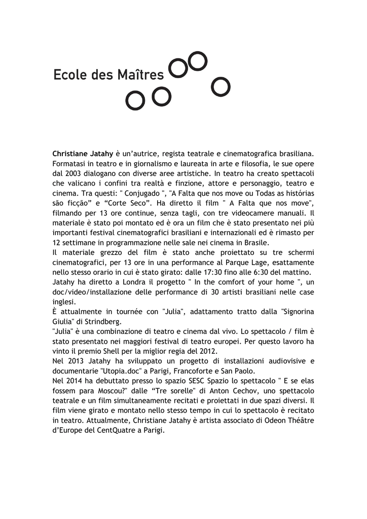 Christiane Jatahy è un’autrice, regista teatrale e cinematografica brasiliana. Formatasi in teatro e in giornalismo e laureata in arte e filosofia, le sue opere dal 2003 dialogano con diverse aree artistiche. In teatro ha creato spettacoli che valicano i confini tra realtà e finzione, attore e personaggio, teatro e cinema. Tra questi: " Conjugado ", "A Falta que nos move ou Todas as histórias são ficção” e “Corte Seco”. Ha diretto il film " A Falta que nos move", filmando per 13 ore continue, senza tagli, con tre videocamere manuali. Il materiale è stato poi montato ed è ora un film che è stato presentato nei più importanti festival cinematografici brasiliani e internazionali ed è rimasto per 12 settimane in programmazione nelle sale nei cinema in Brasile. Il materiale grezzo del film è stato anche proiettato su tre schermi cinematografici, per 13 ore in una performance al Parque Lage, esattamente nello stesso orario in cui è stato girato: dalle 17:30 fino alle 6:30 del mattino. Jatahy ha diretto a Londra il progetto " In the comfort of your home ", un doc/video/installazione delle performance di 30 artisti brasiliani nelle case inglesi. È attualmente in tournée con "Julia", adattamento tratto dalla "Signorina Giulia" di Strindberg. "Julia" è una combinazione di teatro e cinema dal vivo. Lo spettacolo / film è stato presentato nei maggiori festival di teatro europei. Per questo lavoro ha vinto il premio Shell per la miglior regia del 2012. Nel 2013 Jatahy ha sviluppato un progetto di installazioni audiovisive e documentarie "Utopia.doc" a Parigi, Francoforte e San Paolo. Nel 2014 ha debuttato presso lo spazio SESC Spazio lo spettacolo " E se elas fossem para Moscou?" dalle “Tre sorelle" di Anton Cechov, uno spettacolo teatrale e un film simultaneamente recitati e proiettati in due spazi diversi. Il film viene girato e montato nello stesso tempo in cui lo spettacolo è recitato in teatro. Attualmente, Christiane Jatahy è artista associato di Odeon Théâtre d’Europe del CentQuatre a Parigi.