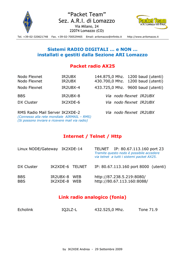 “Packet Team” Sez. A.R.I. di Lomazzo Via Milano, 24 22074 Lomazzo (CO) Tel. +39-02-320621748 Fax. +39-02-700529465 Email: [email protected] http://www.arilomazzo.it Sistemi RADIO DIGITALI … e NON … installati e gestiti dalla Sezione ARI Lomazzo Packet radio AX25 Nodo Flexnet Nodo Flexnet IR2UBX IR2UBX 144.875,0 Mhz. 1200 baud (utenti) 430.700,0 Mhz. 1200 baud (utenti) Nodo Flexnet IR2UBX-4 433.725,0 Mhz. 9600 baud (utenti) BBS IR2UBX-8 Via nodo flexnet IR2UBX DX Cluster IK2XDE-6 Via nodo flexnet IR2UBX RMS Radio Mail Server IK2XDE-2 Via nodo flexnet IR2UBX (Connesso alla rete mondiale AIRMAIL – RMS) (Si possono inviare e ricevere mail via radio) Internet / Telnet / Http Linux NODE/Gateway IK2XDE-14 TELNET IP: 80.67.113.160 port 23 Tramite questo nodo è possibile accedere via telnet a tutti i sistemi packet AX25. DX Cluster IK2XDE-6 TELNET IP: 80.67.113.160 port 8000 (utenti) BBS BBS IR2UBX-8 WEB IK2XDE-8 WEB http://87.238.5.219:8080/ http://80.67.113.160:8088/ Link radio analogico (fonia) Echolink IQ2LZ-L 432.525,0 Mhz. by IK2XDE Andrea - 29 Settembre 2009 Tone 71.9 “Packet Team” Sez. A.R.I. di Lomazzo Via Milano, 24 22074 Lomazzo (CO) Tel. +39-02-320621748 Fax. +39-02-700529465 Email: [email protected] http://www.arilomazzo.it APRS – packet ax25 Nodo APRS Nodo APRS Nodo APRS IR2UBX-11 IW2GFJ-11 IZ2EWR-11 144.800,0 Mhz. Lomazzo 144.800,0 Mhz. Menaggio 144.800,0 Mhz. Piantedo (Co) - JN45MQ (Co) - JN46OA (So) - JN46RD Servizi aggiuntivi APRS attivati: - PBBS (personal BBS) – IQ2LZ-5 Con questo servizio gli utenti registrati possono interrogare il sistema in APRS per poi ricevere bollettini informativi via mail. • Viabilità autostrade A4 - A8 – A9 – Tang. Milano • Meteo allert di tutta Italia • Previsioni meteo Lombardia • Situazione sismica Italia (ultime 48 ore) - EYEBALL “Traffico” – IQ2LZ-10 Vengono emesse automaticamente icone con una sintesi del traffico nelle zone congestionate. Le informazioni sono fonte AUTOSTRADE, le icone sono emesse solo se c'è una segnalazione e sono automaticamente cancellate quando cessa lo stato di segnalazione. Aggiornamento ogni 15 min. - Icona/objects QUAKE “SISMA” (IQ2LZ) Viene emessa un’icona con il simbolo QUAKE qualora avvenga un sisma con magnitudine >=2.5, solo in Nord Italia (Lat. 4700.00N – 4400.00N) e solo nelle prime 12 ore dall’evento. L’icona è posizionata con le coordinate del sisma e ne contiene data/ora e magnitudine/profondità. - Icona/object ProCiv (IQ2LZ) Viene emessa un’icona con il simbolo Protezione Civile (CivDef) quando la Direzione Generale della Protezione Civile, Regione Lombardia segnala fenomeni atmosferici o ambientali che comportano particolare attenzione, allerta o allarme, e/o nel caso di eventi sismici con magnitudine >= 4.0. Nell’icona è riportato un riassunto del Bollettino o le informazioni relative al sisma. Il posizionamento dell’icona è sul vertice del triangolo del Lago di Como (Bellagio). - Icona AREA OBJECTS (IQ2LZ-15) Il sistema IQ2LZ è inoltre predisposto per lanciare, tramite particolari comandi in remoto, delle Lycon Area su determinate zone. Es: C’è un’esercitazione od emergenza sul Lago di Como e vogliamo evidenziare la zona del nostro impiego, possiamo circondare l’area con un ovale, triangolo, quadrato, rettangolo. by IK2XDE Andrea - 29 Settembre 2009 “Packet Team” Sez. A.R.I. di Lomazzo Via Milano, 24 22074 Lomazzo (CO) Tel. +39-02-320621748 Fax. +39-02-700529465 Email: [email protected] http://www.arilomazzo.it Per tutti i sistemi sopraelencati, ove necessaria la registrazione, si prega di contattare: Sysop: Co-Sysop: IK2XDE Andrea IK2XDF Gianpaolo [email protected] [email protected] Totale risorse impiegate: 9 Computer 9 Radio 9 Antenne 6 Alimentatori 12v 2 Router 2 Linee ADSL E tanto tempo dedicato dai soci ….!! Chiunque volesse partecipare alle nostre attività, e contribuire in modo attivo alle fasi di progettazione, realizzazione ed ampliamento dei sistemi, può rivolgersi tutti i Venerdì sera ai responsabili di sezione. Ci auguriamo che sempre più colleghi utilizzino i nostri sistemi, nel rispetto delle normative, del buon senso, e dell’etica radioamatoriale. Approfondimenti ed istruzioni sono reperibili sulle nostre pagine web http://www.arilomazzo.it Per la Sez. ARI Lomazzo IK2XDE Andrea by IK2XDE Andrea - 29 Settembre 2009