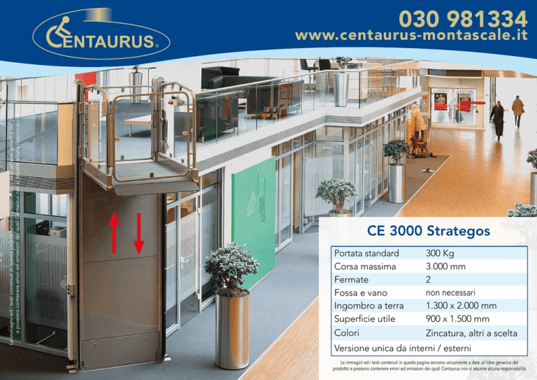 030 981334 Le immagini ed i testi contenuti in questa pagina servono unicamente a dare un’idea generica del prodotto e possono contenere errori ed omissioni dei quali Centaurus non si assume alcuna responsabilità www.centaurus-montascale.it CE 3000 Strategos Portata standard Corsa massima Fermate Fossa e vano Ingombro a terra Superficie utile 300 Kg 3.000 mm 2 non necessari 1.300 x 2.000 mm 900 x 1.500 mm Colori Zincatura, altri a scelta Versione unica da interni / esterni Le immagini ed i testi contenuti in questa pagina servono unicamente a dare un’idea generica del prodotto e possono contenere errori ed omissioni dei quali Centaurus non si assume alcuna responsabilità