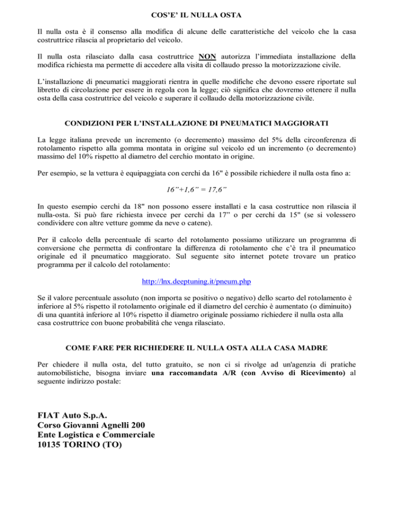 COS’E’ IL NULLA OSTA Il nulla osta è il consenso alla modifica di alcune delle caratteristiche del veicolo che la casa costruttrice rilascia al proprietario del veicolo. Il nulla osta rilasciato dalla casa costruttrice NON autorizza l’immediata installazione della modifica richiesta ma permette di accedere alla visita di collaudo presso la motorizzazione civile. L’installazione di pneumatici maggiorati rientra in quelle modifiche che devono essere riportate sul libretto di circolazione per essere in regola con la legge; ciò significa che dovremo ottenere il nulla osta della casa costruttrice del veicolo e superare il collaudo della motorizzazione civile. CONDIZIONI PER L’INSTALLAZIONE DI PNEUMATICI MAGGIORATI La legge italiana prevede un incremento (o decremento) massimo del 5% della circonferenza di rotolamento rispetto alla gomma montata in origine sul veicolo ed un incremento (o decremento) massimo del 10% rispetto al diametro del cerchio montato in origine. Per esempio, se la vettura è equipaggiata con cerchi da 16" è possibile richiedere il nulla osta fino a: 16”+1,6” = 17,6” In questo esempio cerchi da 18" non possono essere installati e la casa costruttice non rilascia il nulla-osta. Si può fare richiesta invece per cerchi da 17” o per cerchi da 15" (se si volessero condividere con altre vetture gomme da neve o catene). Per il calcolo della percentuale di scarto del rotolamento possiamo utilizzare un programma di conversione che permetta di confrontare la differenza di rotolamento che c’è tra il pneumatico originale ed il pneumatico maggiorato. Sul seguente sito internet potete trovare un pratico programma per il calcolo del rotolamento: http://lnx.deeptuning.it/pneum.php Se il valore percentuale assoluto (non importa se positivo o negativo) dello scarto del rotolamento è inferiore al 5% rispetto il rotolamento originale ed il diametro del cerchio è aumentato (o diminuito) di una quantità inferiore al 10% rispetto il diametro originale possiamo richiedere il nulla osta alla casa costruttrice con buone probabilità che venga rilasciato. COME FARE PER RICHIEDERE IL NULLA OSTA ALLA CASA MADRE Per chiedere il nulla osta, del tutto gratuito, se non ci si rivolge ad un'agenzia di pratiche automobilistiche, bisogna inviare una raccomandata A/R (con Avviso di Ricevimento) al seguente indirizzo postale: FIAT Auto S.p.A. Corso Giovanni Agnelli 200 Ente Logistica e Commerciale 10135 TORINO (TO) All’interno della busta dobbiamo inserire: 1) la richiesta debitamente compilata. Potete consultare il file “FAC-SIMILE_nulla osta” (sostituite le scritte rosse con i vostri dati); 2) la copia della tabella CUNA (evidenziando le misure del pneumatico originale e del pneumatico maggiorato). Trovate la tabella nel file “TabellaCUNA”; 3) la fotocopia fronte retro del libretto di circolazione. ERRORI DA NON COMMETTERE Affinchè la nostra richiesta di nulla osta sia correttamente compilata dobbiamo attenerci ad alcune indicazioni: Codice di velocità: la FIAT non riconosce la validità del codice di velocità Z usato da alcuni produttori di gomme, quindi scrivendo 215/40ZR17 la nostra richiesta verrà sicuramente respinta. Si DEVE scrivere semplicemente 215/40R17 e poi aggiungere l’indice di carico ed il codice di velocità, per esempio 87W. Se dobbiamo installare gli pneumatici maggiorati su un Coupé Fiat 20 valvole turbo, siccome supera i 240 km/h, dovremo scegliere un pneumatico con codice di velocità W o Y (tranne gomme invernali, vedi oltre): Codice di velocità (SI) Q R S T U H V W Y Velocità massima (Km/h) 160 170 180 190 200 210 240 270 300 Tutti gli pneumatici che superano i 240 km/h devono avere la lettera Z riportata all'interno dell'indicazione dimensionale dello pneumatico. Per esempio 215/40 ZR 17. La lettera Z non è un codice ufficiale ma significa genericamente che lo pneumatico può sopportare velocità oltre i 240 km/h. Indice di carico: l'indice di carico deve essere uguale o superiore a quello riportato sul libretto per gli penumatici di prima installazione. Per la Coupé Fiat 20 valvole turbo deve essere almeno 86, ma le gomme in commercio si trovano da 87, 89 ed anche 91. Meglio comunque riportare sulla richiesta di nulla osta l'indice di carico riportato sulle gomme che vogliamo montare, purché logicamente non inferiore ad 86. Indice di carico (SI) 60 76 84 91 98 Carico ammissibile per ruota (kg) 250 400 500 615 750 IMPORTANTE Va considerato che il codice di velocità e l’indice di carico sono vincolanti quindi se FIAT autorizza una misura con un certo codice di velocità ed indice di carico e poi si montano pneumatici con codici inferiori siamo assolutamente fuorilegge e non passeremo il collaudo della motorizzazione civile. CONSIGLI Se vogliamo richiedere più di una misura di pneumatici possiamo farlo anche nella stessa lettera. FIAT non ha imposto un limite di misure richieste per ciascuna domanda e concederà il nulla osta per tutte le misure attinenti alla normativa. Scegliete gli pneumatici seguendo le indicazioni riportate sopra facendo attenzione all’incremento diametrale, all’incremento del rotolamento, al codice di velocità e all’indice di carico. ECCEZIONI Sono esentate dalla richiesta del nulla osta tutti gli pneumatici invernali purché il codice velocità non sia inferiore a Q. (Se è inferiore a Q occorre chiedere il nulla-osta e passare il collaudo in Motorizzazione). Di solito, per le gomme adatte ad un Coupé, il codice invernale è H e quindi con limitazione a 210 Km/h. Per essere in regola dovremo applicare sul volante un bollo che indichi il codice di velocità della gomma e ricordi di non superare i 210 km/h. Se le coperture invernali sono chiodate il limite di velocità scende a 90 km/h. TEMPI DI ATTESA Bisogna prepararsi ad attendere anche due mesi dalla data di spedizione della raccomandata. Se dopo tale termine non abbiamo avuto risposta, si può telefonare per un sollecito della domanda al numero verde