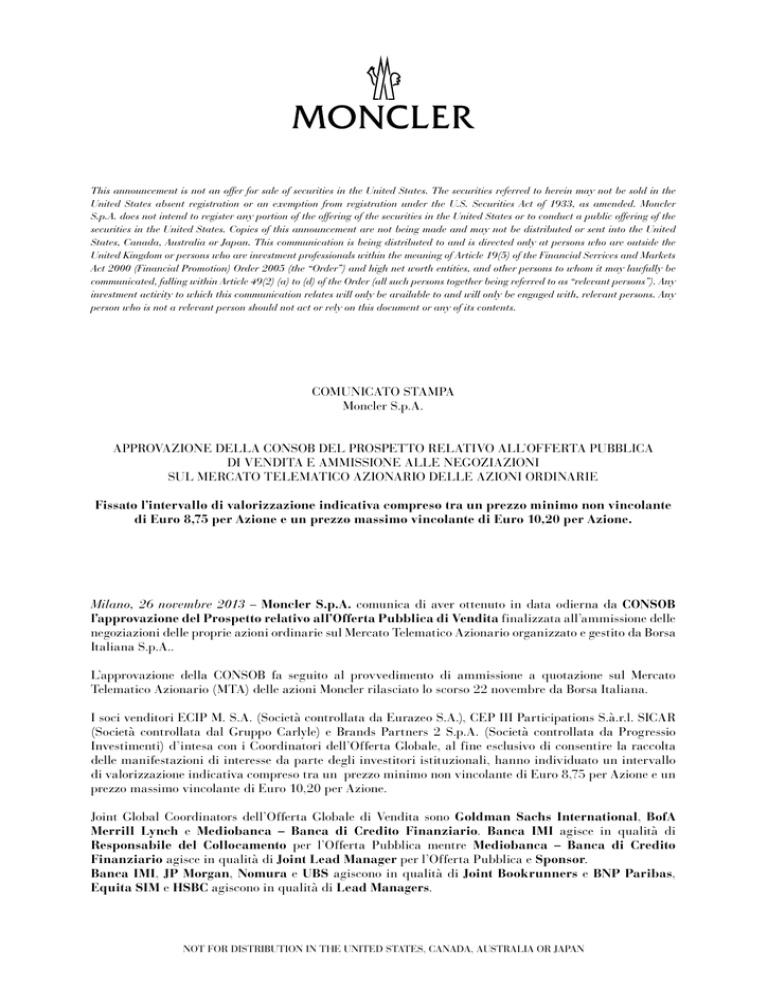 This announcement is not an offer for sale of securities in the United States. The securities referred to herein may not be sold in the United States absent registration or an exemption from registration under the U.S. Securities Act of 1933, as amended. Moncler S.p.A. does not intend to register any portion of the offering of the securities in the United States or to conduct a public offering of the securities in the United States. Copies of this announcement are not being made and may not be distributed or sent into the United States, Canada, Australia or Japan. This communication is being distributed to and is directed only at persons who are outside the United Kingdom or persons who are investment professionals within the meaning of Article 19(5) of the Financial Services and Markets Act 2000 (Financial Promotion) Order 2005 (the “Order”) and high net worth entities, and other persons to whom it may lawfully be communicated, falling within Article 49(2) (a) to (d) of the Order (all such persons together being referred to as “relevant persons”). Any investment activity to which this communication relates will only be available to and will only be engaged with, relevant persons. Any person who is not a relevant person should not act or rely on this document or any of its contents. COMUNICATO STAMPA Moncler S.p.A. APPROVAZIONE DELLA CONSOB DEL PROSPETTO RELATIVO ALL’OFFERTA PUBBLICA DI VENDITA E AMMISSIONE ALLE NEGOZIAZIONI SUL MERCATO TELEMATICO AZIONARIO DELLE AZIONI ORDINARIE Fissato l’intervallo di valorizzazione indicativa compreso tra un prezzo minimo non vincolante di Euro 8,75 per Azione e un prezzo massimo vincolante di Euro 10,20 per Azione. Milano, 26 novembre 2013 – Moncler S.p.A. comunica di aver ottenuto in data odierna da CONSOB l’approvazione del Prospetto relativo all’Offerta Pubblica di Vendita finalizzata all’ammissione delle negoziazioni delle proprie azioni ordinarie sul Mercato Telematico Azionario organizzato e gestito da Borsa Italiana S.p.A.. L’approvazione della CONSOB fa seguito al provvedimento di ammissione a quotazione sul Mercato Telematico Azionario (MTA) delle azioni Moncler rilasciato lo scorso 22 novembre da Borsa Italiana. I soci venditori ECIP M. S.A. (Società controllata da Eurazeo S.A.), CEP III Participations S.à.r.l. SICAR (Società controllata dal Gruppo Carlyle) e Brands Partners 2 S.p.A. (Società controllata da Progressio Investimenti) d’intesa con i Coordinatori dell’Offerta Globale, al fine esclusivo di consentire la raccolta delle manifestazioni di interesse da parte degli investitori istituzionali, hanno individuato un intervallo di valorizzazione indicativa compreso tra un prezzo minimo non vincolante di Euro 8,75 per Azione e un prezzo massimo vincolante di Euro 10,20 per Azione. Joint Global Coordinators dell’Offerta Globale di Vendita sono Goldman Sachs International, BofA Merrill Lynch e Mediobanca – Banca di Credito Finanziario. Banca IMI agisce in qualità di Responsabile del Collocamento per l’Offerta Pubblica mentre Mediobanca – Banca di Credito Finanziario agisce in qualità di Joint Lead Manager per l’Offerta Pubblica e Sponsor. Banca IMI, JP Morgan, Nomura e UBS agiscono in qualità di Joint Bookrunners e BNP Paribas, Equita SIM e HSBC agiscono in qualità di Lead Managers. NOT FOR DISTRIBUTION IN THE UNITED STATES, CANADA, AUSTRALIA OR JAPAN Per Moncler, Claudio Costamagna e Lazard agiscono in qualità di advisor finanziario, Latham & Watkins LLP agisce in qualità di advisor legale Italiano e Internazionale e KPMG agisce in qualità di società di revisione. Linklaters agisce in qualità di advisor legale Italiano e Internazionale per i Joint Global Coordinators, i Joint Bookrunners e i Lead Managers. Il Prospetto sarà depositato presso la CONSOB e messo a disposizione presso i Collocatori nonché presso la sede legale di Moncler S.p.A. (in Via Stendhal 47, 20144 Milano). Il Prospetto sarà disponibile anche sul sito della Società www.monclergroup.com e sul sito internet dei Collocatori e di Borsa Italiana S.p.A.. L’avviso di avvenuta pubblicazione del Prospetto verrà pubblicato sui quotidiani Il Sole 24 Ore e MFMilano Finanza, giovedì 28 novembre 2013. PER ULTERIORI INFORMAZIONI: Moncler: Domenico Galluccio – Press Office Tel. +39 02 42204425 [email protected] Paola Durante – Investor Relations Tel. +39 02 42204095 [email protected] Italy: Image Building Simona Raffaelli, Emanuela Borromeo Tel. +39 02 89011300 [email protected] International: Stockwell Communications Laura Gilbert, Zoe Watt Tel. +44 20 72402486 [email protected] About Moncler Moncler nasce in Francia, a Monestier de Clermont, Grenoble, nel 1952 ed ha attualmente sede in Italia. Il marchio ha affiancato negli anni allo stile una continua ricerca tecnologica coadiuvata da esperti nel campo delle attività legate al mondo della montagna. Le collezioni Moncler coniugano le esigenze più estreme dell’outwear alla quotidianità metropolitana. Nel 2003 Remo Ruffini ha rilevato la Maison della quale è Presidente e Amministratore Delegato. Moncler produce e distribuisce direttamente le collezioni Moncler abbigliamento e accessori, Moncler Gamme Rouge, Moncler Gamme Bleu, Moncler Grenoble e Moncler Enfant, tramite boutique dirette e attraverso i più esclusivi Department Store e multimarca internazionali. NOT FOR DISTRIBUTION IN THE UNITED STATES, CANADA, AUSTRALIA OR JAPAN AVVERTENZE Il presente comunicato è stato predisposto dalla Società sotto la propria esclusiva responsabilità. Le informazioni contenute nel presente comunicato hanno unicamente scopo informativo e non devono essere intese come complete o esaustive. Non dovrebbe essere fatto nessun affidamento per nessuna finalità sulle informazioni contenute nel presente comunicato o sulla loro accuratezza o completezza. Qualunque acquisto delle azioni ordinarie di Moncler S.p.A. (le “Azioni Ordinarie”) nel contesto dell’Offerta Globale di vendita deve 