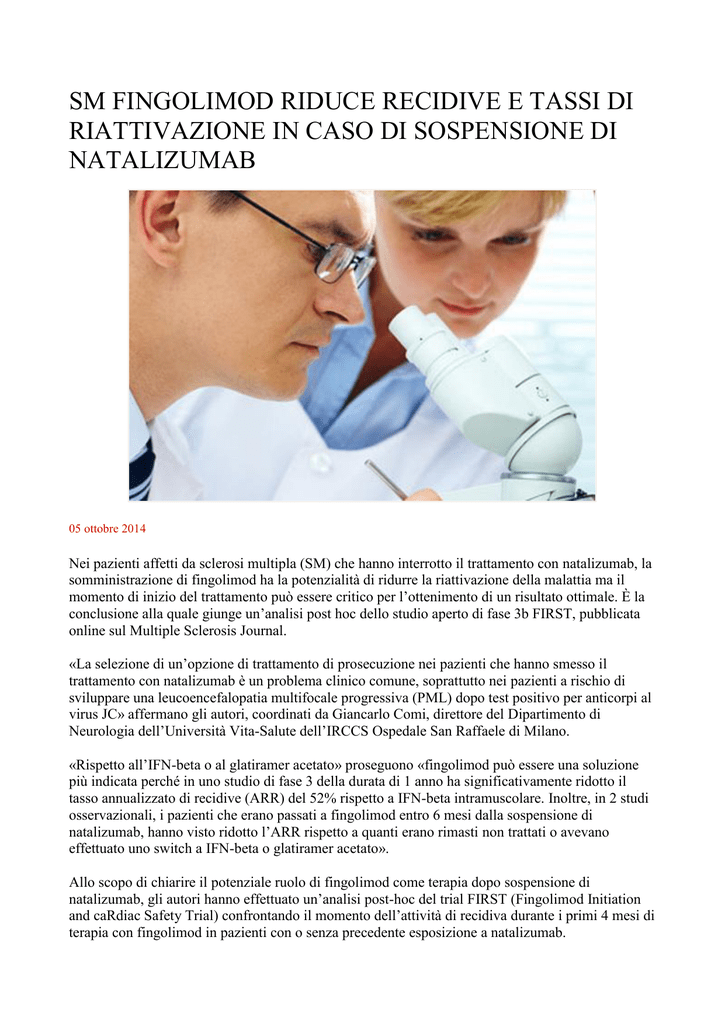 sm fingolimod riduce recidive e tassi di riattivazione in