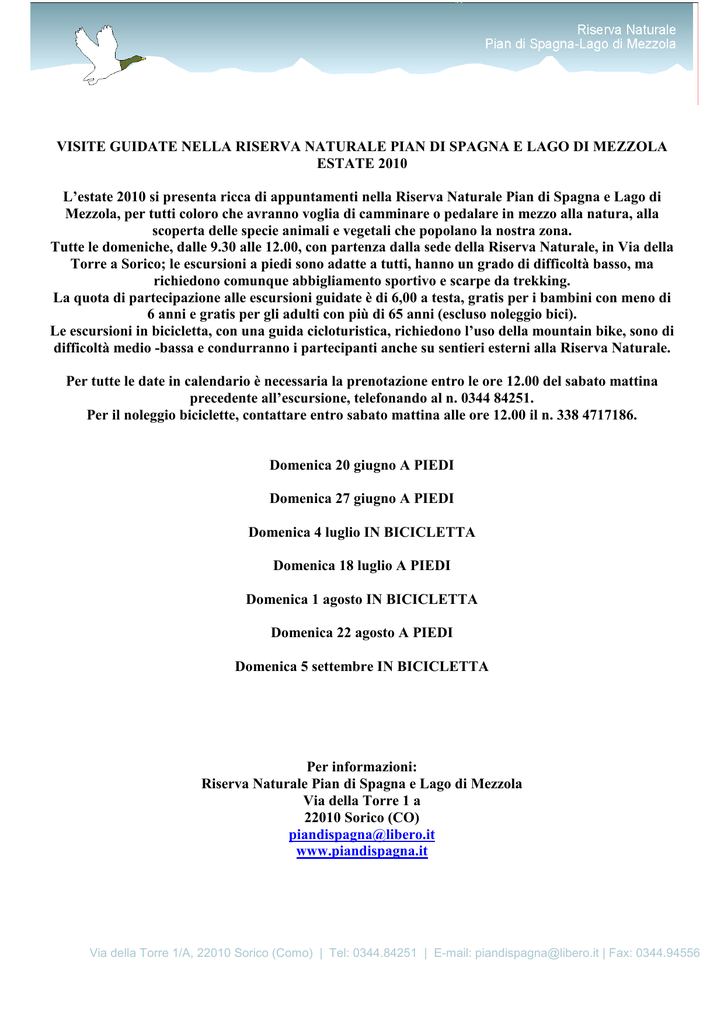 VISITE GUIDATE NELLA RISERVA NATURALE PIAN DI SPAGNA E LAGO DI MEZZOLA ESTATE 2010 L’estate 2010 si presenta ricca di appuntamenti nella Riserva Naturale Pian di Spagna e Lago di Mezzola, per tutti coloro che avranno voglia di camminare o pedalare in mezzo alla natura, alla scoperta delle specie animali e vegetali che popolano la nostra zona. Tutte le domeniche, dalle 9.30 alle 12.00, con partenza dalla sede della Riserva Naturale, in Via della Torre a Sorico; le escursioni a piedi sono adatte a tutti, hanno un grado di difficoltà basso, ma richiedono comunque abbigliamento sportivo e scarpe da trekking. La quota di partecipazione alle escursioni guidate è di 6,00 a testa, gratis per i bambini con meno di 6 anni e gratis per gli adulti con più di 65 anni (escluso noleggio bici). Le escursioni in bicicletta, con una guida cicloturistica, richiedono l’uso della mountain bike, sono di difficoltà medio -bassa e condurranno i partecipanti anche su sentieri esterni alla Riserva Naturale. Per tutte le date in calendario è necessaria la prenotazione entro le ore 12.00 del sabato mattina precedente all’escursione, telefonando al n. 0344 84251. Per il noleggio biciclette, contattare entro sabato mattina alle ore 12.00 il n. 338 4717186. Domenica 20 giugno A PIEDI Domenica 27 giugno A PIEDI Domenica 4 luglio IN BICICLETTA Domenica 18 luglio A PIEDI Domenica 1 agosto IN BICICLETTA Domenica 22 agosto A PIEDI Domenica 5 settembre IN BICICLETTA Per informazioni: Riserva Naturale Pian di Spagna e Lago di Mezzola Via della Torre 1 a 22010 Sorico (CO) [email protected] www.piandispagna.it Via della Torre 1/A, 22010 Sorico (Como) | Tel: 0344.84251 | E-mail: [email protected] | Fax: 0344.94556 Il gruppo ‘GITE IN BARCA’ di Dascio propone una piacevole alternativa alle escursioni a piedi nelle seguenti date: Domenica 11 luglio Domenica 25 luglio Domenica 8 agosto Domenica 29 agosto Partendo dal lungolago di Dascio, si attraverserà in barca il Lago di Mezzola fino a raggiungere la chiesina di S.Fedelino e si ritornerà a Dascio. Nelle date indicate sarà presente sull’imbarcazione anche una Guida naturalistica della Riserva Naturale Pian di Spagna e Lago di Mezzola che descriverà ai presenti le bellezze dell’area protetta da una prospettiva nuova e insolita, quella delle acque del lago. Ritrovo alle ore 10.30 nel parcheggio di Dascio, oltrepassata la chiesa. Durata dell’escursione: 1 ora e ½ circa Costo a persona: € 12,00 - Per i bambini sotto i 6 anni: € 7,00 E’ obbligatoria la prenotazione entro il sabato precedente all’escursione in barca, telefonando ai seguenti recapiti: 346 0873962 o 389 3438863 Oppure scrivendo a: [email protected] Via della Torre 1/A, 22010 Sorico (Como) | Tel: 0344.84251 | E-mail: [email protected] | Fax: 0344.94556