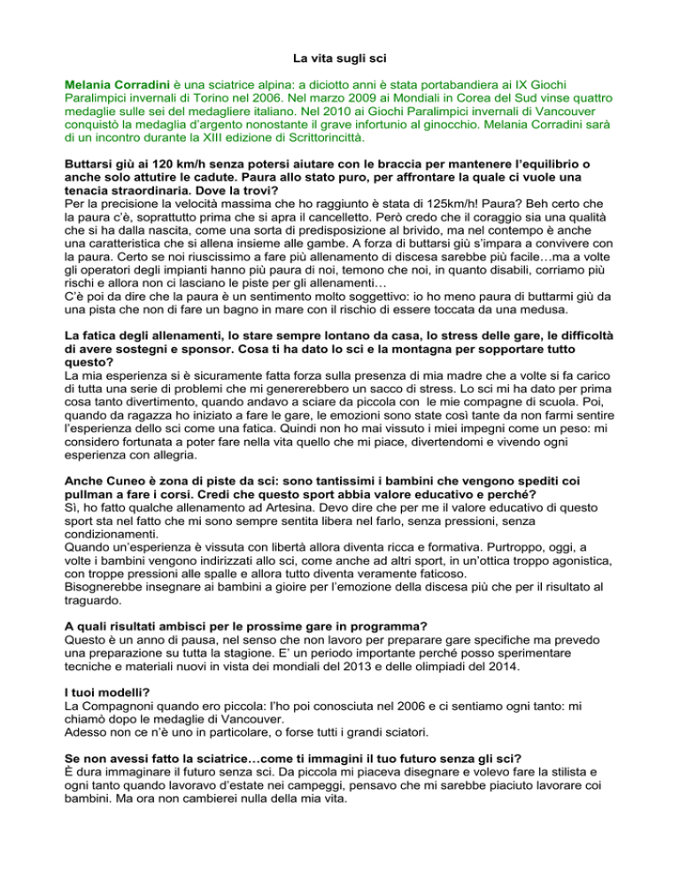 La vita sugli sci Melania Corradini è una sciatrice alpina: a diciotto anni è stata portabandiera ai IX Giochi Paralimpici invernali di Torino nel 2006. Nel marzo 2009 ai Mondiali in Corea del Sud vinse quattro medaglie sulle sei del medagliere italiano. Nel 2010 ai Giochi Paralimpici invernali di Vancouver conquistò la medaglia d’argento nonostante il grave infortunio al ginocchio. Melania Corradini sarà di un incontro durante la XIII edizione di Scrittorincittà. Buttarsi giù ai 120 km/h senza potersi aiutare con le braccia per mantenere l’equilibrio o anche solo attutire le cadute. Paura allo stato puro, per affrontare la quale ci vuole una tenacia straordinaria. Dove la trovi? Per la precisione la velocità massima che ho raggiunto è stata di 125km/h! Paura? Beh certo che la paura c’è, soprattutto prima che si apra il cancelletto. Però credo che il coraggio sia una qualità che si ha dalla nascita, come una sorta di predisposizione al brivido, ma nel contempo è anche una caratteristica che si allena insieme alle gambe. A forza di buttarsi giù s’impara a convivere con la paura. Certo se noi riuscissimo a fare più allenamento di discesa sarebbe più facile…ma a volte gli operatori degli impianti hanno più paura di noi, temono che noi, in quanto disabili, corriamo più rischi e allora non ci lasciano le piste per gli allenamenti… C’è poi da dire che la paura è un sentimento molto soggettivo: io ho meno paura di buttarmi giù da una pista che non di fare un bagno in mare con il rischio di essere toccata da una medusa. La fatica degli allenamenti, lo stare sempre lontano da casa, lo stress delle gare, le difficoltà di avere sostegni e sponsor. Cosa ti ha dato lo sci e la montagna per sopportare tutto questo? La mia esperienza si è sicuramente fatta forza sulla presenza di mia madre che a volte si fa carico di tutta una serie di problemi che mi genererebbero un sacco di stress. Lo sci mi ha dato per prima cosa tanto divertimento, quando andavo a sciare da piccola con le mie compagne di scuola. Poi, quando da ragazza ho iniziato a fare le gare, le emozioni sono state così tante da non farmi sentire l’esperienza dello sci come una fatica. Quindi non ho mai vissuto i miei impegni come un peso: mi considero fortunata a poter fare nella vita quello che mi piace, divertendomi e vivendo ogni esperienza con allegria. Anche Cuneo è zona di piste da sci: sono tantissimi i bambini che vengono spediti coi pullman a fare i corsi. Credi che questo sport abbia valore educativo e perché? Sì, ho fatto qualche allenamento ad Artesina. Devo dire che per me il valore educativo di questo sport sta nel fatto che mi sono sempre sentita libera nel farlo, senza pressioni, senza condizionamenti. Quando un’esperienza è vissuta con libertà allora diventa ricca e formativa. Purtroppo, oggi, a volte i bambini vengono indirizzati allo sci, come anche ad altri sport, in un’ottica troppo agonistica, con troppe pressioni alle spalle e allora tutto diventa veramente faticoso. Bisognerebbe insegnare ai bambini a gioire per l’emozione della discesa più che per il risultato al traguardo. A quali risultati ambisci per le prossime gare in programma? Questo è un anno di pausa, nel senso che non lavoro per preparare gare specifiche ma prevedo una preparazione su tutta la stagione. E’ un periodo importante perché posso sperimentare tecniche e materiali nuovi in vista dei mondiali del 2013 e delle olimpiadi del 2014. I tuoi modelli? La Compagnoni quando ero piccola: l’ho poi conosciuta nel 2006 e ci sentiamo ogni tanto: mi chiamò dopo le medaglie di Vancouver. Adesso non ce n’è uno in particolare, o forse tutti i grandi sciatori. Se non avessi fatto la sciatrice…come ti immagini il tuo futuro senza gli sci? È dura immaginare il futuro senza sci. Da piccola mi piaceva disegnare e volevo fare la stilista e ogni tanto quando lavoravo d’estate nei campeggi, pensavo che mi sarebbe piaciuto lavorare coi bambini. Ma ora non cambierei nulla della mia vita.
