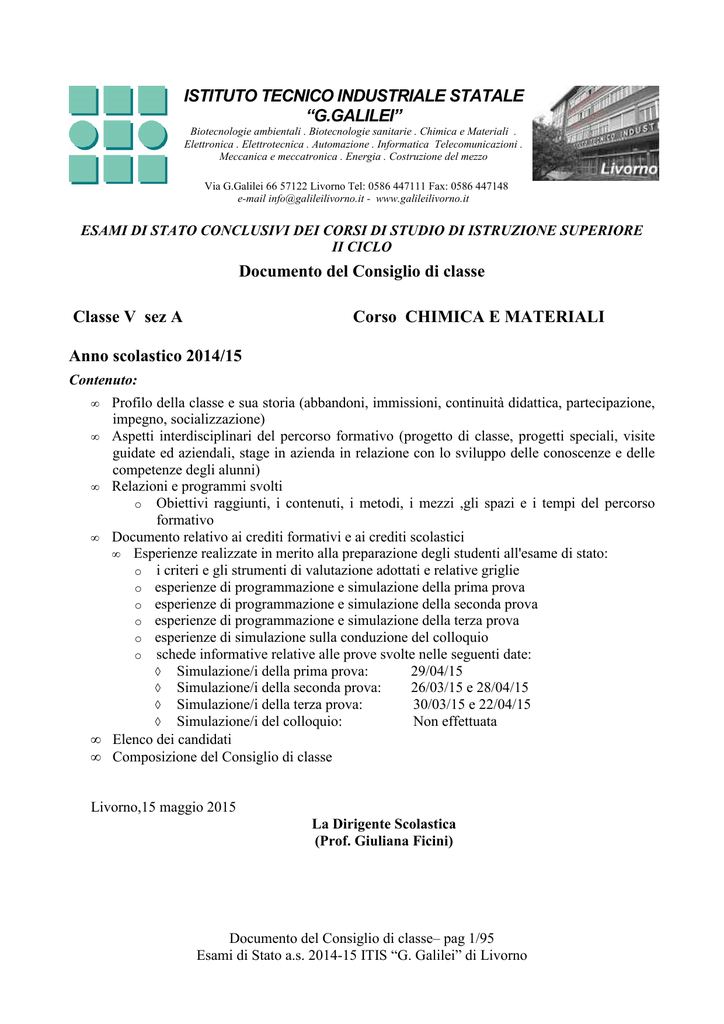 ISTITUTO TECNICO INDUSTRIALE STATALE “G.GALILEI” Biotecnologie ambientali . Biotecnologie sanitarie . Chimica e Materiali . Elettronica . Elettrotecnica . Automazione . Informatica Telecomunicazioni . Meccanica e meccatronica . Energia . Costruzione del mezzo Via G.Galilei 66 57122 Livorno Tel: 0586 447111 Fax: 0586 447148 e-mail [email protected] - www.galileilivorno.it ESAMI DI STATO CONCLUSIVI DEI CORSI DI STUDIO DI ISTRUZIONE SUPERIORE II CICLO Documento del Consiglio di classe Classe V sez A Corso CHIMICA E MATERIALI Anno scolastico 2014/15 Contenuto: • Profilo della classe e sua storia (abbandoni, immissioni, continuità didattica, partecipazione, impegno, socializzazione) • Aspetti interdisciplinari del percorso formativo (progetto di classe, progetti speciali, visite guidate ed aziendali, stage in azienda in relazione con lo sviluppo delle conoscenze e delle competenze degli alunni) • Relazioni e programmi svolti o Obiettivi raggiunti, i contenuti, i metodi, i mezzi ,gli spazi e i tempi del percorso formativo • Documento relativo ai crediti formativi e ai crediti scolastici • Esperienze realizzate in merito alla preparazione degli studenti all'esame di stato: o i criteri e gli strumenti di valutazione adottati e relative griglie o esperienze di programmazione e simulazione della prima prova o esperienze di programmazione e simulazione della seconda prova o esperienze di programmazione e simulazione della terza prova o esperienze di simulazione sulla conduzione del colloquio o schede informative relative alle prove svolte nelle seguenti date: ◊ Simulazione/i della prima prova: 29/04/15 ◊ Simulazione/i della seconda prova: 26/03/15 e 28/04/15 ◊ Simulazione/i della terza prova: 30/03/15 e 22/04/15 ◊ Simulazione/i del colloquio: Non effettuata • Elenco dei candidati • Composizione del Consiglio di classe Livorno,15 maggio 2015 La Dirigente Scolastica (Prof. Giuliana Ficini) Documento del Consiglio di classe– pag 1/95 Esami di Stato a.s. 2014-15 ITIS “G. Galilei” di Livorno Allegati: 1. Profilo della classe e sua storia (abbandoni, immissioni, continuità didattica, partecipazione, impegno, socializzazione) 2. Obiettivi raggiunti, i contenuti, i metodi, i mezzi ,gli spazi e i tempi del percorso formativo 3. Aspetti interdisciplinari del percorso formativo (progetto di classe, progetti speciali, viaggi e visite guidate ed aziendali, stage in azienda in relazione con lo sviluppo delle conoscenze e delle competenze degli alunni) 4. Relazioni e programmi svolti relativi alle seguenti materie: Lingua e lettere italiane Storia ed educazione civica Lingua straniera inglese Scienze Motorie Religione Tecnologie chimiche industriali Matematica e Complementi di Matematica Chimica analitica e strumentale Chimica organica e biochimica 5. Documento relativo ai crediti formativi e ai crediti scolastici 6. Esperienze realizzate in merito alla preparazione degli studenti all'esame di stato: i criteri e gli strumenti di valutazione adottati e relative griglie esperienze di programmazione e simulazione della prima esperienze di programmazione e simulazione della seconda prova esperienze di programmazione e simulazione della terza prova; esperienze di simulazione sulla conduzione del colloquio. 7. Elenco dei candidati. Bambi Ludovica Borghi Simone Casali Matilde Di Giorgi Alessandra Faraoni Federica Ferrini Margherita Galli Jodi Gallinari Costanza Galotto Anna Garigliani Greta Giuliani Elisa Ibba Leonardo Leonardi Swany Macchioni Nicola Sardelli Giulia Documento del Consiglio di classe– pag 2/95 Esami di Stato a.s. 2014-15 ITIS “G. Galilei” di Livorno 8. Composizione del Consiglio di classe Disciplina Lingua e lettere italiane Storia ed educazione civica Lingua straniera inglese Scienze Motorie Religione Matematica e Complementi di Matematica Chimica analitica e strumentale Chimica organica e biochimica Tecnologie chimiche industriali Docente FRANCESCA CAPANNA RAFFAELLA DANI CRISTINA CAPRAI FABIO GUIDI CRISTINA MANCINI SILVIA RAPACCINI FABIOLA SERAVALLE ANTONELLA RAMACCIOTTI PATRIZIA MARTELLI LUIGI MARCOLINI Documento del Consiglio di classe– pag 3/95 Esami di Stato a.s. 2014-15 ITIS “G. Galilei” di Livorno 1. Profilo della classe e sua storia nel triennio (partecipazione, impegno,socializzazione, abbandoni, immissioni, continuità didattica) La classe è composta da 15 alunni, di cui 4 maschi e 11 femmine. In terza erano iscritti 21 alunni; al termine dell’anno scolastico quattro non sono stati ammessi alla classe successiva. In quarta la classe era formata da 21 alunni, di cui quattro ripetenti, due provenienti dall’Istituto e due provenienti da altri Istituti. All’inizio della quinta gli alunni erano 17 perché quattro alunni non sono stati ammessi. Nel corso dell’anno due alunni si sono ritirati per motivi di salute. Nel triennio si è riscontrata continuità del corpo docente delle discipline di Analisi strumentale (insegnate teorico), Chimica Organica, Italiano, Storia, Matematica ed Educazione Fisica. I docenti di laboratorio di Analisi e di Inglese sono cambiati in quinta, mentre il docente di Tecnologie chimiche è cambiato in quarta ed è rimasto anche in quinta. La classe ha sempre tenuto un comportamento corretto, non ci sono mai stati nell’arco dei tre anni episodi che abbiano richiesto la necessità di rapporti disciplinari. La frequenza però non è mai stata molto regolare, nonostante il numero ridotto di alunni, sono veramente pochi i giorni in cui la classe è stata presente al completo, molti alunni sono soliti fare assenze saltuarie, non comprendendo a pieno l’importanza di una partecipazione assidua allo svolgimento del lavoro in classe, sia teorico che pratico. Il clima in classe è sereno, non ci sono stati particolari problemi di socializzazione se non in quarta, quest’anno il gruppo classe è abbastanza unito. La partecipazione alle lezioni frontali è soddisfacente, anche se la maggior parte degli studenti si limita ad as