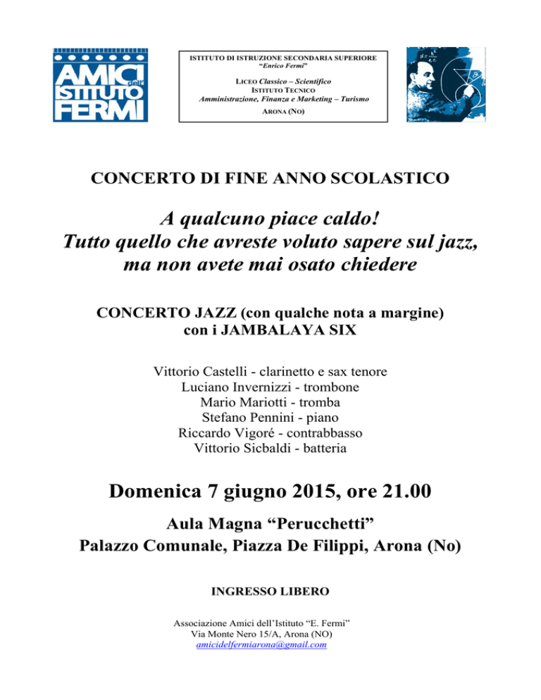 ISTITUTO DI ISTRUZIONE SECONDARIA SUPERIORE “Enrico Fermi” LICEO Classico – Scientifico ISTITUTO TECNICO Amministrazione, Finanza e Marketing – Turismo ARONA (NO) CONCERTO DI FINE ANNO SCOLASTICO A qualcuno piace caldo! Tutto quello che avreste voluto sapere sul jazz, ma non avete mai osato chiedere CONCERTO JAZZ (con qualche nota a margine) con i JAMBALAYA SIX Vittorio Castelli - clarinetto e sax tenore Luciano Invernizzi - trombone Mario Mariotti - tromba Stefano Pennini - piano Riccardo Vigoré - contrabbasso Vittorio Sicbaldi - batteria Domenica 7 giugno 2015, ore 21.00 Aula Magna “Perucchetti” Palazzo Comunale, Piazza De Filippi, Arona (No) INGRESSO LIBERO Associazione Amici dell’Istituto “E. Fermi” Via Monte Nero 15/A, Arona (NO) [email protected] PROGRAMMA Siete tutti appassionati al vecchio jazz? Quello che fa ballare e cantare, sognare e divertire? Volete sentire lo struggente spiritual e il genuino blues del Delta del Mississippi? Volete trascorre una serata al suono del Dixieland? I Jambalaya Six vi propongono un percorso ragionato sulla storia del jazz, dal ragtime, la musica pianistica delle origini, allo swing, il jazz da ballo degli anni della crisi economica negli Stati Uniti del secolo scorso. Durante il concerto saranno presentati alcuni classici brani del jazz di quei tempi, riportandoci nell’atmosfera piena di vita di New Orleans. SCOPO DELL’INIZIATIVA Il progetto rientra nelle attività dell’Associazione amici del’Istituto “Fermi” per promuovere la conoscenza dell’associazione e raccogliere aiuti per supportare gli obiettivi didattici e socioeducativi dell’Istituto scolastico. In quest’occasione, diversamente dal Concerto di Natale, sono stati coinvolti musicisti professionisti che hanno accettato di suonare gratuitamente, offrendo la propria professionalità per sostenere la scuola in questo difficile momento di crisi. A loro va il nostro sentito ringraziamento! JAMBALAYA SIX Alcuni componenti dei “JAMBALAYA SIX” hanno all’attivo numerosi dischi e hanno collaborato con i migliori jazzisti internazionali e partecipato a centinaia di festival jazz. Vittorio Castelli, musicista e giornalista, suona il clarinetto e il sax tenore e ha curato la pubblicazione di numerosi libri sul jazz e articoli per “Panorama”, “Europeo” e “Corriere della Sera”. Luciano Invernizzi con il suo trombone ha portato il jazz tradizionale in Italia, fondando la “Bovisa Jazz Band” nel 1963. Ha suonato con Louis Armstrong e numerosi altri grandi del jazz. Mario Mariotti si è fatto le ossa suonando saltuariamente un po' con tutte le jazz band di Milano e dintorni. Poi si è diplomato in tromba e ora svolge attività professionale sia nel jazz che nella musica classica. E' stato invitato a questo concerto dei Jambalaya Six per la sua versatilità e la sua esperienza specifica nel campo del jazz tradizionale. Stefano Pennini, diplomato in pianoforte alla Scuola civica jazz di Milano, è una giovane promessa (26 anni). Suona ovunque e con tutti. Siamo fortunati ad averlo spesso con noi! Riccardo Vigoré, "veterano" del suo strumento, ha suonato spesso con gruppi di stili anche molto lontani fra loro. Quando non è impegnato a suonare in Italia e all'estero, insegna contrabbasso e basso elettrico a giovani aspiranti musicisti. Ha collaborato con tutti i maggiori jazzisti italiani "storici", da Gianni Basso a Glauco Masetti, da Gil Cuppini a Sergio Fanni. Vittorio Sicbaldi, docente di Lettere dall’Istituto comprensivo “G. Curioni” di Romagnano Sesia, si diletta a sbatacchiare sui tamburi, accompagnando con maestria e simpatia i Jambalaya Six. .