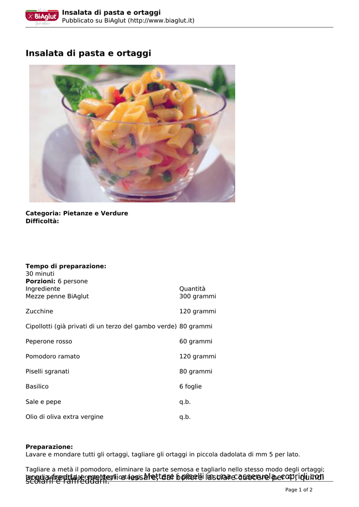 Insalata di pasta e ortaggi Pubblicato su BiAglut (http://www.biaglut.it) Insalata di pasta e ortaggi Categoria: Pietanze e Verdure Difficoltà: Tempo di preparazione: 30 minuti Porzioni: 6 persone Ingrediente Mezze penne BiAglut Quantità 300 grammi Zucchine 120 grammi Cipollotti (già privati di un terzo del gambo verde) 80 grammi Peperone rosso 60 grammi Pomodoro ramato 120 grammi Piselli sgranati 80 grammi Basilico 6 foglie Sale e pepe q.b. Olio di oliva extra vergine q.b. Preparazione: Lavare e mondare tutti gli ortaggi, tagliare gli ortaggi in piccola dadolata di mm 5 per lato. Tagliare a metà il pomodoro, eliminare la parte semosa e tagliarlo nello stesso modo degli ortaggi; tenerli daleresto degli ortaggi. Mettere i piselli lasciare in una casseruola, coprirli con acquaseparati fredda metterli a lessare; dal bollore cuocere per 4’, quindi scolarli e raffreddarli. Page 1 of 2 Insalata di pasta e ortaggi Pubblicato su BiAglut (http://www.biaglut.it) Mettere a bollire dell’acqua in una casseruola adeguata alla quantità della pasta. Riunire in una padella gli ortaggi tranne i pomodori, condirli con due cucchiai di olio, fare prendere calore a fiamma alta e lasciarli rosolare per circa un minuto, salare e pepare. Al termine versare il tutto in un piatto, allargare e lasciare raffreddare. Versare la pasta nell’acqua bollente e salata, fare riprendere il bollore e lasciare cuocere, a fiamma moderata, per circa 4’, mescolare di tanto in tanto. Scolare la pasta e raffreddarla con acqua fredda corrente, sgocciolarla bene e versarla in una ciotola. Condire con gli ortaggi preparati, il pomodoro tagliato, qualche foglia di basilico, sale, pepe e due cucchiai di olio di oliva e.v. Mescolare con cura e lasciare riposare in frigorifero per almeno 30’ prima di servirla. I consigli dello chef: Per cuocere al meglio la pasta il bollore non deve essere mai eccessivo, mescolare immediatamente dopo avere versato la pasta e continuate ogni minuto circa. La pasta dovrà risultare molto al dente, tenete presente che la pasta a contato con elementi “umidi” continua a gonfiarsi ed ammorbidirsi. La pasta cosi preparata potrà essere conservata in frigorifero al massimo per 36 ore. Vota: 0 Ancora nessun voto Tweet Page 2 of 2
