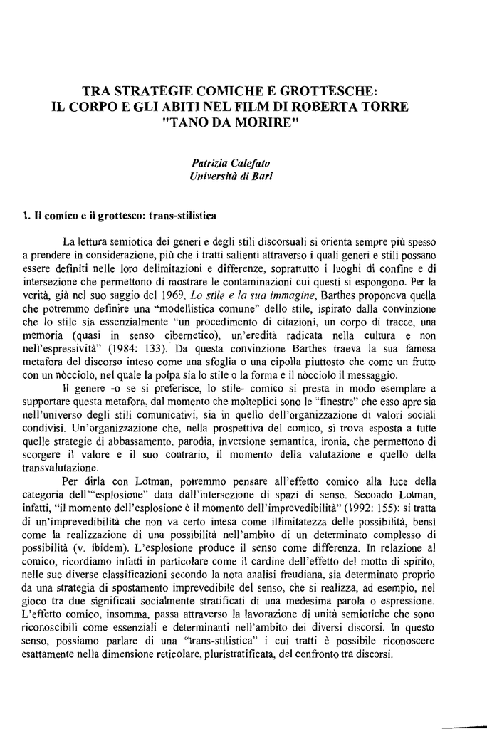 TRA STRATEGIE COMICHE E GROTTESCHE: IL CORPO E GLI ABITI NEL FILM DI ROBERTA TORRE "TANO DA MORIRE" Patrizia Cate/ato UniversitiJ: di Bari 1. Il comico e il grottesco: trans-stilistica La lettura semiotica dei generi e degli stili discorsuali si orienta sempre piu spesso a prendere in considerazione, piu che i tratti salienti attraverso i quali generi e stili possano essere definiti nelie loro delimitazioni e differenze, soprattutto i luoghi di confine e di intersezione che permettono di mostrare le contaminazioni cui questi si espongono. Per la verita, gia nel suo saggio del 1969, La stile e la sua immagine, Barthes proponeva quella che potremmo definire una "modellistica comune" dello stile, ispirato dalla convinzione che 10 stile sia essenzialmente "un procedimento di citazioni, un corpo di tracce, una memoria (quasi in senso cibemetico), un' eredita radicata nella cultura e non nell'espressivita" (1984: 133). Da questa convinzione Barthes traeva la sua famosa metafora del discorso inteso come una sfoglia 0 una cipoUa piuttosto che come un frutto con un nocciolo, nel quale la polpa sia 10 stile 0 la forma e il nocciolo it messaggio. [J genere -0 se si preferisce, 10 stile- comico si presta in modo esemplare a supportare questa metafora, dal momento che molteplici sono le "finestre" che esso apre sia nell'universo degli stili comunicativi, sia in quello dell'organizzazione di valori sociali condivisi. Un' organizzazione che, nella prospettiva del comico, si trova esposta a tutte quelle strategie di abbassamento, parodia, inversione semantica, ironia, che permettono di scorgere il valore e il suo contrario, il momento della valutazione e quello della transvalutazione. Per dirla con Lotman, potremmo pensare all' effetto comico alia (uce della categoria dell"'esplosione" data dall'intersezione di spazi di senso. Secondo Lotman, infatti, "il momento dell'esplosione e il momento dell'imprevedibilita" (1992: 155): si tratta di un'imprevedibilita che non va certo intesa come illimitatezza delle possibilita, bensi come la realizzazione di una possibilita nell'ambito di un determinato complesso di possibilita (v. ibidem). L'esplosione produce il senso come differenza. In relazione al comico, ricordiamo infatti in particolare come il cardine deIl'effetto del motto di spirito, nelle sue diverse classificazioni secondo la nota analisi freudiana, sia determinato proprio da una strategia di spostamento imprevedibile del senso, che si realizza, ad esempio, nel gioco tra due significati socialmente stratificati di una medesima parola 0 espressione. L'effetto comico, insomma, passa attraverso la lavorazione di unita semiotiche che sono riconoscibili come essenziali e determinanti nell 'ambito dei diversi discorsi. In questo senso, possiamo parlare di una "trans-stilistica" i cui tratti e possibile riconoscere esattamente nella dimensione reticolare, pluristratificata, del confronto tra discorsi. Lee/ora, 5-6 (l999-2000) 118 2. 11 corpo grottesco L'aspetto semioticamente rilevante del comico, .in confronto si.a alla impostazione freudiana, sia a quella piu strettamente linguistico retonca (Olbrechts- fytheca), Sla anche rispetto a una visione piu filosofica (pensiamo al riso per Bergson), SI carattenzza per due aspetti fondamentali: I. ,., la visione inter-testuale, in senso ampio, della generazione dell'effetto comico come istituzione di una strategia sociodiscorsuale compkssiva; I'individuazione di unitl semiotiche la cui manipolazione produce la situazione el' cffetto del riso, Riuuardo al primo aspetto, ricordiamo come iJ comico abbia soprattutto a che fare con la sua ;appresentazione, anche quando si tratta di comico involontario 0 quotidiano. 11 comico cioe presuppone comunque una sottolineatura, un dito puntato, dunque SI pone quasi naturalmente come un percorso stratificato e l1letasemiotico del senso. Teatro e cinema sono i luoghi in cui questa dimensione vie ne piu esplicitamente rea!Izzata, ma, come gia delto, la comicita involontaria di una caduta su una buccia di banana pUG essere anch'essa considerata una performance. dal momento che presuppone almeno un attore e uno spettatore entrambi collocati nell'ambito della percezione dell'imprevedibilita 0 del "mondo capovolto" rispetto alla vita quotidiana. Riguardo al secondo aspetto, si tratta di considerare a seconda dei testi quali siano le unita strutturali, verbali e non verbali, piu esposte allavoro della comic ita. Questo testa si concentra sull'intersezione tra il comico e il grottesco nell'ambito del cinema, in particolare prendendo in considerazione le modal ita di realizzazione dell'effetto comico attraverso la manipolazione di unita semiotiche essenziali nel contesto del discorso filmico, quali il corpo e gli abiti. L'abito nel cinema funziona come unita strutturale portante che funge spesso come una sorta di "schermo nello schermo", un segno carico di senso in cui si appella, si pretigura e si indirizza il giudizio e il gusto dello spettatore 1• 11 corpo, a sua volta, e il supporto organico di quelle trasformazioni stilistiche che condensano 0 da cui si diparte l'effetto comico (per esempio, il corpo di Chariot, con il suo abito caratteristico e il suo trucco di scena, e indispensabile nella realizzazione della gag). 11 corpo che genera il comico viene qui inteso come corpo grottesco, nel senso bachtiniano, e anche nel senso di corpo rivestito, nel quale il rivestimento e protuberanza camevalesca, parodica seconda pe lie, apertura e non delimitazione 0 confine. 11 grottesco, con le sue caratteristiche di esagerazione, iperbole, indeterminatezza, inversione semantica e glorificazione del basso e delle aperture corporee, permette un'analisi esemplare delle possibili molteplici trasformazioni del corpo, del decentramento percettivo degli oggetti, dell'esacerbazione del senso comune, tutti elementi che contribuiscono alia realizzazione della situazione e dell'effetto comico. 11 grottesco apre altres! uno spazio immenso per una lettura 