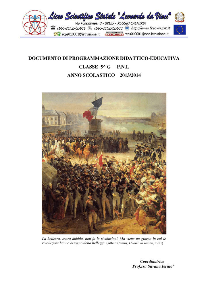 DOCUMENTO DI PROGRAMMAZIONE DIDATTICO-EDUCATIVA CLASSE 5^ G P.N.I. ANNO SCOLASTICO 2013/2014 La bellezza, senza dubbio, non fa le rivoluzioni. Ma viene un giorno in cui le rivoluzioni hanno bisogno della bellezza. (Albert Camus, L'uomo in rivolta, 1951) Coordinatrice Prof.ssa Silvana Ierino’ COMPOSIZIONE DELLA CLASSE ALUNNI N. 1 BORRELLO COSIMO 2 CANALE MARCO 3 CANALE VITTORIA 4 COLOSI MARIALUCIA 5 COVANI MARCO 6 FEDERICO FRANCESCO JOANNES 7 GATTO SIMONE 8 GIACOPINO SIMONA 9 GUERRERO MATUTE EDWIN SAMUEL 10 IDONE MADDALENA 11 LABOCCETTA CONSOLATA CARMELA 12 LARIZZA LEO 13 LIONTE GIUSEPPE 14 LIUZZO GIUSEPPE 15 MARINO ALESSIA 16 MARRA DEMETRIO 17 MARTINO ANDREA 18 MEGALE EUGENIO 19 MOLINARI FRANCESCO 20 MUSOLINO ANNALISA 21 OROBONI FORTUNATO 22 PANGALLO PIERMATTEO 23 POSTORINO SANTO 24 SALSONE EUGENIO ELENCO DELLE DISCIPLINE E DEI RISPETTIVI DOCENTI DISCIPLINE DOCENTI RELIGIONE CATERINA FORTANI ITALIANO E LATINO MARGHERITA CUTRUPI INGLESE SILVANA IERINO’ STORIA E FILOSOFIA CLARA IANNELLO MATEMATICA DANIELA BATTEGLIO FISICA CONCETTA FIORE SCIENZE DANIELA PLAIA DISEGNO - STORIA ARTE GIUSEPPA ZACCURI SCIENZE MOTORIE QUATTRONE DOMENICO Il Consiglio di Classe, dopo aver analizzato la situazione di partenza, nella riunione dell’08/10/2013, ha definito la struttura della programmazione didattico-educativa della classe V sez. G per l’anno scolastico 2013 - 2014 in coerenza con le indicazioni del Collegio dei Docenti e dei Dipartimenti delle varie discipline. Il presente documento è stato elaborato nella convinzione che la scuola debba costantemente stimolare e coinvolgere gli allievi in un processo di apprendimento che, per essere efficace, deve averli come protagonisti. Il Consiglio di Classe ribadisce il carattere modulare della programmazione delle attività scolastiche affinché l’azione didattica non si riveli mera trasmissione e frazionamento dei saperi, ma giunga ad una visione organica e unitaria delle conoscenze per essere funzionale agli interessi ed ai bisogni cognitivi degli studenti. In questo documento viene esplicitato, mediante l’indicazione di obiettivi, contenuti, metodologie, attività curriculari ed extracurriculari, modalità e criteri di verifica e di valutazione, il processo formativo che la classe compirà al fine di concretizzare la crescita culturale degli allievi, per promuoverne le potenzialità e raggiungere così il pieno successo formativo. PRESENTAZIONE DELLA CLASSE La classe 5^ sez. G si compone di 24 alunni, di cui 17 ragazzi e 7 ragazze, tutti provenienti dalla 4^ G dell’anno precedente. L’allieva Colosi Maria Lucia, però, nello scorso anno scolastico, ha frequentato una scuola in Ungheria, nell’ambito della mobilità studentesca internazionale, progetto Intercultura, da settembre 2012 a luglio 2013. La prof.ssa Ierinò, tutor dell’alunna e coordinatrice della classe, ha tenuto contatti frequenti con la ragazza per aggiornarla circa le attività didattiche svolte ed informarsi del processo di studi seguito da lei all’estero, ragguagliando poi regolarmente gli altri docenti. In data 08/10/2013 il Consiglio ha sottoposto l’alunna ad un colloquio mirante all’accertamento delle competenze di base per la frequenza del V anno di studi e per l’attribuzione del credito scolastico per l’a.s. 2012-2013, al cui verbale si rimanda per i dettagli del caso. L’ordinamento seguito dalla classe è quello sperimentale P.N.I. Dal punto di vista socio-relazionale gli alunni evidenziano un comportamento corretto e responsabile, un atteggiamento di disponibilità al dialogo educativo e allo studio personale. Buone appaiono anche le relazioni interpersonali all’interno della classe ed il rapporto con i docenti. Dal punto di vista cognitivo-didattico si nota nell’insieme un apprezzabile livello di attenzione ed interesse nelle varie discipline: quasi tutti si impegnano a casa, partecipano attivamente in classe ed un buon gruppo approfondisce personalmente pervenendo a conoscenze espresse anche con spirito critico. Non mancano tuttavia allievi meno motivati che evidenziano una preparazione di partenza ancora superficiale ed un atteggiamento culturale non del tutto maturo e responsabile. NORME COMPORTAMENTALI ED ATTEGGIAMENTI RELAZIONALI COMUNI Per impostare un efficace lavoro scolastico e per perseguire contenuti e obiettivi comuni, tutti i docenti, oltre ad illustrare alla classe il programma da svolgere, sottolineeranno i relativi obiettivi didattici, cercando di: • Assumere un ruolo guida; • Instaurare con gli allievi un rapporto amichevole aperto al dialogo; • Richiamare costantemente al lavoro già svolto e chiedere interventi chiari, ordinati e pertinenti; • Illustrare i criteri di valutazione delle prove e i criteri di valutazione finale; • Dare visione degli elaborati scritti il più presto possibile, e mai oltre i 15 giorni dalla data della verifica; • Tenere un comportamento coerente; • Distribuire carichi settimanali in modo equilibrato; • Intervenire fermamente nel richiedere il rispetto delle cose, delle persone, degli ambienti; • Non far coincidere due compiti scritti nella stessa giornata; • Controllare sistematicamente i compiti assegnati. FINALITA’ FORMATIVE • • • • • • • • Promuovere il senso di responsabilità e di impegno etico finalizzato a libere e consapevoli scelte valoriali. Dotare ciascuno studente di validi strumenti di organizzazione del pensiero e idonee tecniche operative al fine di ottenere una comunicazione efficace. Rafforzare il gusto per la ricerca e per il sapere partecipando costruttivamente al dialogo educativo. Perseguire la formazione umana, culturale e civile degli studenti, attraverso la riflessione critica sulle questioni fondamentali dell’essere, dell’essere con gli altri, del conoscere, dell’agire, del produrre. Sviluppare la capacità di problematizzare eventi, teorie, prassi consolidate, costumi e credenze radicate. Favorire la flessibilità di pensiero intesa c
