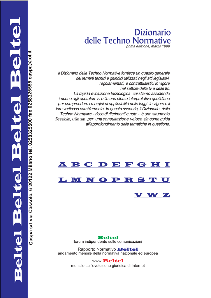 Caspa srl via Cassolo, 6 20122 Milano tel. 0258325500 fax 0258325555 [email protected] Beltel Beltel Beltel Beltel Dizionario delle TechnoprimaNormative edizione, marzo 1999 Il Dizionario delle Techno Normative fornisce un quadro generale dei termini tecnici e giuridici utilizzati negli atti legislativi, regolamentari, e contrattualistici in vigore nel settore della tv e delle tlc. La rapida evoluzione tecnologica cui stiamo assistendo impone agli operatori tv e tlc uno sforzo interpretativo quotidiano per comprendere i margini di applicabilità delle leggi in vigore e il loro vorticoso cambiamento. In questo scenario, il Dizionario delle Techno Normative - ricco di riferimenti e note - è uno strumento flessibile, utile sia per una consultazione veloce sia come guida all’approfondimento delle tematiche in questione. A B C D E F G H I L M N O P R S T U V W Z Beltel forum indipendente sulle comunicazioni Rapporto Normativo Beltel andamento mensile della normativa nazionale ed europea www Beltel mensile sull’evoluzione giuridica di Internet Beltel A ABBONATO: Ogni persona fisica o giuridica che sia parte di un contratto con un fornitore di servizi di telecomunicazioni accessibili al pubblico avente ad oggetto la fornitura di detti servizi. ACKNOWLEDGEMENT: Letteralmente “riscontro”. Si tratta di un codice di trasmissione internazionale inviato dal terminale ricevente a quello trasmittente per indicare la corretta ricezione di un pacchetto d’informazioni. ADSL (Asymmetric Digital Subscriber Line): Tecnologia di trasmissione dati ad alta velocità attualmente ancora in evoluzione, originalmente sviluppata dal Bellcore (BELL COmmunications REsearch). Attualmente l’ADSL è standardizzato dall’ANSI (American National Standard Institute) come T1.413; l’ETSI (European Telecommunications Standard Institute) lo ha recepito modificandolo parzialmente al fine di adattarlo alle esigenze Europee. Il sistema ADSL utilizza i cavi di rame UTP dalla centrale telefonica al terminale dell’utente; implica l’uso di dispositivi specifici (modem ADSL), tanto da parte del carrier quanto da parte dell’utilizzatore del servizio; permette il transito ad alta velocità di dati lungo le linee telefoniche convenzionali; consente di trasferire un numero di informazioni superiore a quanto dei cavi in rame potrebbero supportare dal momento che la trasmissione avviene in maniera monodirezionale (da qui il termine asymmetric, che compare nell’acronimo. ALTA DEFINIZIONE: L’High Definition Television è uno standard televisivo capace di migliorare la risoluzione grafica dell’immagine televisiva fino a renderla simile a quella della pellicola cinematografica. La definizione dell’immagine dipende dal numero delle linee di cui è composto un quadro e dal numero dei quadri al secondo (vd PAL, SECAM e NTSC). L’alta definizione è stata sperimentata negli anni ’70, in occasione delle olimpiadi di Seoul, dal- 1 la televisione nazionale giapponese NHK in collaborazione con la Sony, ed il sistema era in grado di fornire 1125 linee per 30 quadri al secondo. Un analogo progetto è stato studiato a livello europeo, il progetto Eureka, ed ha coinvolto sia alcune importanti reti televisive, sia aziende elettroniche, in particolare: RAI, Telettra, Seleco, Philips, Selenia. Nello standard europeo, denominato HD-MAC (High Definition Multiplexed Analogue Components), la risoluzione grafica dell’immagine è pari a 1250 linee per 25 quadri al secondo; mentre in Giappone si sta lavorando ad uno standard che permetta di arrivare a 2048 linee per quadro. Inoltre, l’alta definizione prevede anche un diverso rapporto tra la base e l’altezza dello schermo televisivo (5,33:3 rispetto ai 4:3 attuali) ed una più elevata ampiezza di banda per le trasmissioni (fino a 10 volte superiore all’attuale), problema parzialmente risolto attraverso il progresso della tecnologia digitale la quale aumenta la capacità delle reti di trasmissione. AMPIEZZA DI BANDA: Nelle telecomunicazioni questa locuzione indica l’ampiezza di un canale di comunicazioni. Nelle comunicazioni analogiche tale ampiezza viene tipicamente misurata in Hertz. In quelle digitali l’unità di misura convenzionale è il bps (bit per secondo). Una conversazione in fonia in formato analogico ha un’ampiezza di 3.000 Hz e viene trasmesso in un canale di un’ampiezza di 4.000 Hz. Nelle comunicazioni digitali codificate in PCM l’ampiezza richiesta per un’identica comunicazione è di 64.00 bps. ANALOGICO: Segnale che può assumere un numero infinito di valori e che varia in modo continuo in relazione al fenomeno fisico rappresentato. La trasmissione analogica consiste in una rappresentazione originale delle informazioni elementari basata sulla corrispondenza tra due segnali, di trasmissione e di origine, in cui il primo Dizionario delle Techno Normative Beltel è la rappresentazione del secondo e varia proporzionalmente al variare di questo. Nel settore televisivo si è fatto sino ad oggi largo uso delle tecniche analogiche per il trattamento delle immagini mediante la conversione di ogni tipo di messaggio in onde elettromagnetiche, mentre dagli anni ’80 si sta assistendo all’affermazione dei sistemi digitali di trasmissione del segnale televisivo che consiste nella rappresentazione di qualsiasi grandezza in valori numerici binari (vd. digitale). Per quanto concerne l’uso del segnale analogico nelle telecomunicazioni si veda la voce TACS. APPARECCHIATURA TERMINALE: Apparecchi allacciati direttamente o indirettamente al punto terminale di una rete pubblica di telecomunicazioni per trasmettere, trattare o ricevere informazioni. In entrambi i casi di allacciamento, diretto o indiretto, esso può essere realizzato via cavo, fibra ottica o via elettromagnetica1. APPARECCHIO TELEFONICO PUBBLICO A PAGAMENTO: Un’apparecchiatura telefonica fissa destinata ad uso pubblico il cui funzionamento avviene tramite monete, carte di credito o tramite le apposit