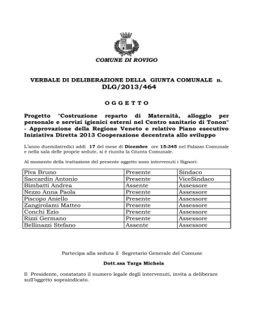 COMUNE DI ROVIGO VERBALE DI DELIBERAZIONE DELLA GIUNTA COMUNALE n. DLG/2013/464 OGGETTO Progetto "Costruzione reparto di Maternità, alloggio per personale e servizi igienici esterni nel Centro sanitario di Tonon" - Approvazione della Regione Veneto e relativo Piano esecutivo Iniziativa Diretta 2013 Cooperazione decentrata allo sviluppo L’anno duemilatredici addì 17 del mese di Dicembre ore 15:345 nel Palazzo Comunale e nella sala delle proprie sedute, si è riunita la Giunta Comunale. Al momento della trattazione del presente oggetto sono intervenuti i Signori: Piva Bruno Saccardin Antonio Bimbatti Andrea Nezzo Anna Paola Piscopo Aniello Zangirolami Matteo Conchi Ezio Rizzi Germano Bellinazzi Stefano Presente Presente Assente Presente Presente Presente Presente Presente Assente Sindaco ViceSindaco Assessore Assessore Assessore Assessore Assessore Assessore Assessore Partecipa alla seduta il Segretario Generale del Comune Dott.ssa Targa Michela Il Presidente, constatato il numero legale degli intervenuti, invita a deliberare sull’oggetto sopraindicato. LA GIUNTA COMUNALE Premesso che: - in data 09 maggio 2013 il Comune di Rovigo ha approvato la partecipazione al Bando regionale di Iniziative Dirette L.R.55/99 con il Progetto “Costruzione reparto di Maternità, alloggio per personale e servizi igienici esterni nel Centro sanitario di Tonon “ in Burkina Faso, in partnership con l’ Ass.ne ACSA, L’Ass.ne Croce Verde Adria. L’Ass.ne culturale L’isola dei Tesori di Codevigo (Pd). il Sindaco del Comune di Silly e il Comitato di Gemellaggio di Satonevri, per l’anno 2013; - il progetto ha lo scopo di realizzare l’ampliamento del Centro sanitario di Tonon Burkina Faso con la costruzione di un reparto di Maternità con annessi alloggi del personale sanitario e dei servizi igienici esterni; Dato atto che il Comune di Rovigo intende continuare le relazioni internazionali attraverso la realizzare di progetti di Cooperazione decentrata allo sviluppo, in particolare a Satonevri, Burkina Faso in virtù del Patto di gemellaggio 2004; Considerata che la Regione Veneto con il Piano annuale 2013 degli interventi di cooperazione decentrata allo sviluppo e solidarietà internazionaleiniziative dirette, ha approvato il progetto del Comune di Rovigo “Costruzione reparto di Maternità, alloggio per personale e servizi igienici esterni nel Centro sanitario di Tonon” con un finanziamento di € 30.000,00; Preso atto che il costo complessivo del progetto è di € 61.360,00 e che i Partner: l’ Ass.ne ACSA, L’Ass.ne Croce Verde Adria. L’Ass.ne culturale L’isola dei Tesori di Codevigo (Pd). il Sindaco del Comune di Silly e il Comitato di Gemellaggio di Satonevri. si impegnano a cofinanziare il progetto, come previsto dal Piano Esecutivo del progetto allegato A); Dato atto che, il presente atto non comporterà nessun impegno finanziario da parte di questa Amministrazione, in quanto il Comune in qualità di capofila parteciperà alla parte amministrativa del progetto mediante la condivisione di risorse umane interne; Vista la delibera di C.C. n. 31 del 31.07.2013, recante “Approvazione Bilancio di Previsione Esercizio Finanziario 2013, Relazione Previsionale e Programmatica 2013/2015, Bilancio Pluriennale 2013/2015 e relativi allegati dichiarata I.E.”; Vista la delibera di G.M.n.306 del 03/09/2013 recante “Approvazione Piano Esecutivo di Gestione anno 2013; piano dettagliato degli obiettivi e piano delle performance”. Visto l’art. il D. L.gs 267/2000 “Testo Unico delle leggi sull’ordinamento degli Enti Locali”; Visto l’art. 48 del D.Lgs.n. 267/2000 e l’art. 26 del vigente Statuto comunale riguardanti le competenze della Giunta comunale; Preso atto che, ai sensi dell’art. 49 del medesimo D.Lgs.n.267/2000, sono stati espressi i seguenti pareri: - del Responsabile del servizio interessato in ordine alla regolarità tecnica: favorevole - del Responsabile di Ragioneria in ordine alle regolarità contabile: favorevole Previa votazione favorevole unanime espressa in forma palese DELIBERA 1. di approvare il progetto “Costruzione reparto di Maternità, alloggio per il personale e servizi igienici esterni nel centro Sanitario di Tonon” e il relativo Piano esecutivo Iniziativa diretta 2013, in collaborazione con l’ Ass.ne ACSA, L’Ass.ne Croce Verde Adria. L’Ass.ne culturale L’isola dei Tesori di Codevigo (Pd). Il Sindaco del Comune di Silly e il Comitato di Gemellaggio di Satonevri: 2. di impegnare la spesa del finanziamento regionale di € 30.000,00 nel Bilancio 2013 al cap.310150/9510 (Vinc. Entrata 310222/9510); 3. di demandare al Dirigente del Settore competente all’assunzione di tutti i conseguenti atti amministrativi gestionali con la Direzione Relazioni Internazionali della Regione Veneto e alla stesura della convenzione per la realizzazione del Progetto: 4. di dichiarare la presente deliberazione, con separata votazione unanime e palese, immediatamente eseguibile, ai sensi dell’art. 134, comma 4, del Decreto Lgs. n. 267/2000, stante l’urgenza. REGIONE VENETO Direzione Relazioni Internazionali L. R. n. 55/1999 “Interventi regionali per la promozione dei diritti umani, la cultura di pace, la cooperazione allo sviluppo e la solidarietà” Capo III. PIANO ESECUTIVO del progetto INIZIATIVA DIRETTA 2013 Cooperazione decentrata allo sviluppo 1) ENTE PROPONENTE 1.a) DATI GENERALI Denominazione COMUNE DI ROVIGO Via e numero civico Città P.zza Vittorio Emanuele II Rovigo Telefono fax 0425/2061 CAP 0425/206330 Provincia 45100 Rovigo pec e-mail [email protected] 1.b) REFERENTE PER IL PROGETTO Nome e cognome Daniela Scarparo Telefono fax 0425/206495 e-mail 0425/206581 [email protected] 2) DATI RELATIVI AL PROGETTO 2.a) TITOLO DEL PROGETTO1 Costruzione reparto di Maternità, alloggio per personale e servizi igienici esterni nel Centro sanitario di Tonon. LOCALITA’ d’intervento (Regione, Provincia, Distretto ecc.)2 2.b) STATO BURKINA FASO,SISSILLI,SILLY,TON