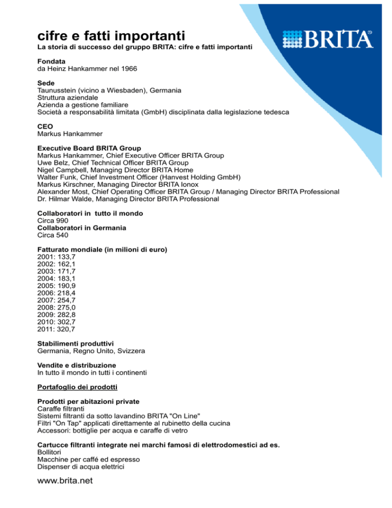 cifre e fatti importanti La storia di successo del gruppo BRITA: cifre e fatti importanti Fondata da Heinz Hankammer nel 1966 Sede Taunusstein (vicino a Wiesbaden), Germania Struttura aziendale Azienda a gestione familiare Società a responsabilità limitata (GmbH) disciplinata dalla legislazione tedesca CEO Markus Hankammer Executive Board BRITA Group Markus Hankammer, Chief Executive Officer BRITA Group Uwe Belz, Chief Technical Officer BRITA Group Nigel Campbell, Managing Director BRITA Home Walter Funk, Chief Investment Officer (Hanvest Holding GmbH) Markus Kirschner, Managing Director BRITA Ionox Alexander Most, Chief Operating Officer BRITA Group / Managing Director BRITA Professional Dr. Hilmar Walde, Managing Director BRITA Professional Collaboratori in tutto il mondo Circa 990 Collaboratori in Germania Circa 540 Fatturato mondiale (in milioni di euro) 2001: 133,7 2002: 162,1 2003: 171,7 2004: 183,1 2005: 190,9 2006: 218,4 2007: 254,7 2008: 275,0 2009: 282,8 2010: 302,7 2011: 320,7 Stabilimenti produttivi Germania, Regno Unito, Svizzera Vendite e distribuzione In tutto il mondo in tutti i continenti Portafoglio dei prodotti Prodotti per abitazioni private Caraffe filtranti Sistemi filtranti da sotto lavandino BRITA "On Line" Filtri "On Tap" applicati direttamente al rubinetto della cucina Accessori: bottiglie per acqua e caraffe di vetro Cartucce filtranti integrate nei marchi famosi di elettrodomestici ad es. Bollitori Macchine per caffé ed espresso Dispenser di acqua elettrici www.brita.net Frigoriferi Cartucce filtranti integrate nei rubinetti delle cucine, che forniscono acqua filtrata BRITA direttamente dal dispenser Sistemi filtranti e cartucce filtranti per Macchine per caffé ed espresso Lavastovigli Forni a vapore Distributori automatici Erogatori di acqua potabile collegati alla rete idrica Erogatori di acqua potabile a marchio Ionox (all'inizio solo in Germania) Erogatori di acqua potabile a marchio enviva (all'inizio solo in Germania) Il gruppo BRITA (BRITA GmbH e le sue filiali) BRITA GmbH, Germania (sede principale) BRITA Water Filter Systems PTY Ltd., Australia BRITA SARL, Francia BRITA Manufacturing Company Ltd., Gran Bretagna BRITA Water Filter Systems Ltd., Gran Bretagna BRITA Italia S.r.l. Unipersonale, Italia BRITA Japan KK, Giappone BRITA Korea, Corea BRITA Polska S.p.z.o.o., Polonia BRITA AG, Svizzera BRITA Iberia S.L.U., Spagna MAVEA LLC, USA MAVEA Canada Inc., Canada BRITA Professional GmbH & Co. KG Ionox Wasser-Technologie GmbH Il gruppo BRITA Con un fatturato totale di 302,7 milioni di euro nell'esercizio finanziario 2010 e 990 dipendenti in tutto il mondo, il gruppo BRITA è una delle aziende leader nel settore della filtrazione dell'acqua potabile. Il marchio BRITA, consolidatosi negli anni e sinonimo in molte nazioni di caraffe filtranti, domina il settore della filtrazione dell'acqua mondiale. Con sede centrale a Taunusstein vicino a Wiesbaden, in Germania, l'azienda a gestione familiare è rappresentata in oltre 60 nazioni su tutti i cinque continenti attraverso filiali, partner industriali e di vendita, una joint venture e gestisce stabilimenti produttivi in Germania, Gran Bretagna, Svizzera. Fondata nel 1966, BRITA è stata la prima a inventare il filtro per caraffe ad uso domestico e ora sviluppa, produce e vende una vasta gamma di filtri innovativi per l'acqua potabile sia per uso domestico (caraffe filtranti; sistemi collegati alla rete idrica; soluzioni integrate BRITA per famosi marchi di grandi e piccoli elettrodomestici) e commerciale (soluzioni per gastronomia, catering e distribuzione automatica), ed erogatori di acqua potabile con i marchi Ionox ed enviva per l'uso in uffici, scuole e nel settore sanitario (ospedali, cliniche private) dove l'igiene è di importanza fondamentale. Per altre informazioni per la stampa contattare: Dr. Sabine Rohlff Head of Corporate Communications / Press Officer BRITA GmbH Heinrich-Hertz-Str. 4 D-65232 Taunusstein Tel. +49 (0)6128 / 746-5743; cell.: +49 (0)175-45 29 438 E-mail : [email protected]