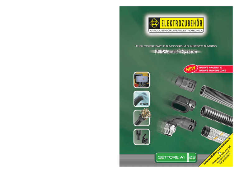 ELEKTROZUBEHÖR È DISTRIBUTORE IN ITALIA DELLA SOCIETÀ FLEXA. ARTICOLI SPECIALI PER ELETTROTECNICA La società Flexa GmbH ha conseguito la certificazione IRIS (International Railway Industry Standard) che qualifica la Flexa come produttore di sistemi di protezione dei cavi per l'industria ferroviaria. La certificazione IRIS è uno standard riconosciuto a livello mondiale per la valutazione dei sistemi di qualità e di gestione di aziende che operano nel settore ferroviario. TUBI CORRUGATI E RACCORDI AD INNESTO RAPIDO ® FLEXAquick - System Leggi il codice QR per un accesso immediato NEW a tutti i nostri prodotti. NUOVI PRODOTTI NUOVE DIMENSIONI ELEKTROZUBEHÖR SPA Sede legale: Via F.lli Bronzetti, 24 - 20129 MILANO MI Centro logistico e Punto vendita: Via Cadorna, 66/A - 20090 Vimodrone MI C w .e l 23 w SETTORE a1 w Per richieste di campionature gratuite: [email protected] Per richieste di offerte: [email protected] Per ordini: [email protected] edizion e Tel: 02 701471 - Fax: 02 70147247 - E-mail: [email protected] ek on su tr ag lt oz a su gio il u be i p r n si ro am to h do e pe or tt nt r g .it i! i li IP 69K ELEKTROZUBEHÖR SPA Elektrozubehör è un’azienda italiana specializzata nella fornitura di prodotti di qualità per il settore elettrotecnico. Propone da sempre quanto di meglio e di più particolare offre il mercato mondiale: dall’articolo più semplice a quello più sofisticato in una completa gamma di dimensioni, colori, accessori e varianti. Elektrozubehör garantisce elasticità nelle forniture e si adopera per soddisfare al meglio le richieste di ogni singolo cliente, realizzando anche esecuzioni speciali su disegno. Elektrozubehör è anche massima attenzione e cura in ogni fase, il tutto con il più assoluto rispetto in materia di normative vigenti ed in tema di sicurezza e prevenzione. Elektrozubehör ha raggiunto nel 2004 un importante traguardo: 50 anni di attività. Un lungo percorso caratterizzato da dedizione al lavoro, da impegno costante, da sfide superate e da continui obiettivi che nel corso degli anni sono stati via via concretizzati. I successi conseguiti grazie all’esperienza acquisita nel settore e grazie alla politica aziendale di ricerca della qualità, sia nei prodotti che nel customer care, forniscono al team aziendale la forza e l’entusiasmo per procedere di questo passo, con la speranza di continuare ad essere, per tanti anni ancora, un punto di riferimento affidabile per coloro che operano nel settore elettrotecnico. Nell’attrezzarsi ad affrontare i nuovi scenari competitivi che si sono aperti all’inizio del nuovo secolo, Elektrozubehör si è trasformata in un’azienda ancor più dinamica e moderna, capace di fronteggiare ogni esigenza sia in campo logistico che in campo tecnologico. In campo logistico, è stato aperto un nuovo grande distaccamento a Vimodrone (Milano) per lo stoccaggio dei prodotti e per poter essere ancora più tempestivi nell’evasione degli ordini. Il nuovo distaccamento ospita anche il rinnovato Punto Vendita e, a breve, lo Showroom. In campo tecnologico, è stato realizzato un nuovo sito internet completamente ristrutturato ed aggiornato sia nella grafica che, soprattutto, nei contenuti. Elektrozubehör ha conseguito, da Novembre 2009, la certificazione UNI EN ISO 9001:2008 che garantisce un sistema aziendale di gestione qualità evoluto e mirato al continuo miglioramento delle proprie prestazioni ed alla massima soddisfazione dei clienti. Elektrozubehör è in grado di supportare le richieste dei clienti in conformità ai requisiti della Direttiva Europea 2002/95/CE (RoHS). www.elektrozubehor.it 01-07 pagine Iniziali 2013.qxd:04-07 Panoramica 2009 24/07/13 13:04 Pagina 2 PANORAMICA PRODOTTI TUBI CORRUGATI RACCORDI Pag. A-3 RQG1 A-5 ZI OTE ONE C PR O B-6 A-6 ZI OTE ONE C PR O L’ACQU RO A NT IP L’ACQU RO A NT IP 69K RQW1 IP 66 B-21 RQW IP 68 B-22 RQWC-N CSA B-23 IP 68 SURIZZAT ES A PR IP 68 69K RQG1-S B-7 RQY-PA B-24 IP 68 IP 66 L’ACQU RO A NT IP SURIZZAT ES A PR Poliammide, per alte temperature 69K RQGK Poliammide 6, spessorato ROHRflex - PA 6-HT L’ACQU RO A NT IP B-20 IP 68 B-4 B-5 IP 68 RQBK90DR 69K RQGC-N CSA Poliammide 6 ROHRflex - PA 6-D ROHRflex - PA 6-DB IP ZI OTE ONE C PR O A-4 L’ACQU RO A NT SURIZZAT ES A PR ROHRflex - PA 6 ROHRflex - PA 6 B IP 68 SURIZZAT ES A PR RQG B-3 SURIZZAT ES A PR IP 66 Poliammide 6 ZI OTE ONE C PR O ROHRflex - PA 6-S Pag. ZI OTE ONE C PR O Pag. 69K NEW A-11 RQB45 A-12 ROHRflex - PA-ZIP A-14 L’ACQU RO A NT IP IP RQLG1 ZI OTE ONE C PR O ZI OTE ONE C PR O B-27 IP 66 B-17 RQLB1 90 B-28 IP 66 B-18 RQLB1 45 B-29 IP 66 SURIZZAT ES A PR ZI OTE ONE C PR O B-26 B-15 69K L’ACQU RO A NT IP 69K IP 66 B-20 IP 68 IP RQGST SURIZZAT ES A PR L’ACQU RO A NT RQB90DR Indice dettagliato a pag. A-2 B-14 B-19 IP 68 L’ACQU RO A NT 69K RQBK90 Kit tubo con chiusura a “ZIP” B-13 69K IP 66 IP 68 B-26 IP 68 ZI OTE ONE C PR O ZI OTE ONE C PR O ZI OTE ONE C PR O ZI OTE ONE C PR O ZI OTE ONE C PR O RQB1 90 RQB90 L’ACQU RO A NT IP RQGR 69K SURIZZAT ES A PR Trecciato in acciaio zincato, in acciaio inox e in rame zincato IP B-12 B-16 IP 68 A-13 L’ACQU RO A NT RQBK45 Poliammide ROHRflex PA/PP/PU ...AZ/AI/CU IP 66 IP 68 B-11 SURIZZAT ES A PR ROHRflex - PA 6-L ROHRflex - PA 6-LB RQB1 45 B-25 IP 68 69K SURIZZAT ES A PR Poliuretano L’ACQU RO A NT IP ZI OTE ONE C PR O ROHRflex - PU ROHRflex - PU B IP 68 69K RQWF-R 69K SURIZZAT ES A PR RQGKZE IP 69K L’ACQU RO A NT IP B-10 L’ACQU RO A NT SURIZZAT ES A PR Polipropilene IP 68 L’ACQU RO A NT IP ZI OTE ONE C PR O RQGKZ IP 68 69K SURIZZAT ES A PR A-10 IP 66 SURIZZAT ES A PR ROHRflex - PP RQGZ IP B-25 IP 68 69K SURIZZAT ES A PR Poliammide 12, spessorato RQGZ1 L’ACQU RO A NT RQK-PA SURIZZAT ES A PR A-9 L’ACQU RO A NT IP B-24 IP 68 B-8 B-10 IP 68 RQT-PA 69K RQGK2 Poliammide 12 ROHRflex - PA 12-D ROHRflex - PA 12-DB L’ACQU RO A NT IP ZI OTE ONE C PR O A-8 IP 68 B-7 SURIZZAT ES A PR RQG2 IP 66 SURIZZAT ES A PR ROHRflex - PA 12 ROHRflex - 