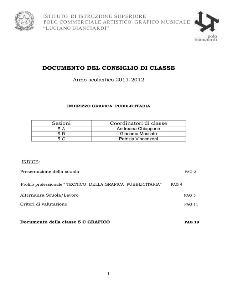ISTITUTO DI ISTRUZIONE SUPERIORE POLO COMMERCIALE ARTISTICO GR AFICO MUSICALE “LUCIANO BIANCIARDI” DOCUMENTO DEL CONSIGLIO DI CLASSE Anno scolastico 2011-2012 INDIRIZZO GRAFICA PUBBLICITARIA Sezioni Coordinatori di classe 5A 5B 5C Andreana Chiappone Giacomo Moscato Patrizia Vincenzoni INDICE: Presentazione della scuola PAG 2 Profilo professionale “ TECNICO DELLA GRAFICA PUBBLICITARIA” PAG 4 Alternanza Scuola/Lavoro PAG 5 Criteri di valutazione PAG 11 Documento della classe 5 C GRAFICO PAG 18 1 PRESENTAZIONE DELLA SCUOLA Il Polo Commerciale, Artistico, Grafico e Musicale “L. Bianciardi” è un’istituzione scolastica completamente nuova. Questa si è costituita il 1 settembre 2011, per effetto del dimensionamento della rete scolastica provinciale determinato dalla DGR Toscana n. 40 del 31.01.2011 ed è stata ufficialmente intitolata allo scrittore e intellettuale grossetano Luciano Bianciardi il 15 dicembre 2011. La nuova autonomia comprende: un ordinamento liceale, con il Liceo musicale-coreutico, di nuova istituzione, e il Liceo artistico, scorporato dal Polo liceale “P. Aldi” di Grosseto, con quattro indirizzi: Arti figurative, Architettura e ambiente, Audiovisivo e multimediale, Grafico; un ordinamento tecnico, con l’Istituto tecnico della grafica e comunicazione, di nuova istituzione; un ordinamento professionale, con l’indirizzo dei Servizi commerciali (AziendaleGrafico) , scorporato dall’ ex Istituto professionale “L. Einaudi”. La nascita di questo nuovo polo è stata determinata dalla necessità di istituire un’autonomia scolastica che offrisse una formazione vocata alla comunicazione in generale, con particolare riferimento alla comunicazione artistica e commerciale. Questo, naturalmente, ha messo la nuova istituzione scolastica di fronte alla necessità di dover ricreare una nuova identità, che tenesse conto di un’offerta formativa in gran parte cambiata rispetto a quella dell’ex Istituto professionale “L. Einaudi” e del Polo Liceale. Risorse strutturali - AULE, LABORATORI ED UFFICI SEDE DI PIAZZA DE MARIA Piano seminterrato: 5 laboratori di informatica, 1 laboratorio hardware, 1 centro assistenza, un locale destinato ad archivio. Piano terra: 2 aule (A. Magna e Lab. Rosso), 10 servizi di segreteria (Affari generali, contabilità, personale, alunni, Dirigente scolastico, D.S.G.A., Coordinamento di plesso, EDA, Sala insegnanti), 1 laboratorio informatica, 1 biblioteca. Primo piano: 9 aule, 1 laboratorio (ex lab. Servizi Sociali). Secondo piano: 10 aule, 1 servizio segreteria (ufficio Ag. Formativa), 2 servizi didattici (Centro Ausili Didattici). 2 palestre. 1 centro per le attività di carattere sociale - AULE, LABORATORI ED UFFICI SEDE DI VIA BRIGATE PARTIGIANE Piano terra: 6 aule, 1 laboratorio di cinema e sala posa, 3 laboratori di computer, 1 laboratorio di comunicazione, 1 aula speciale, 1 laboratorio per l’agenzia formativa (attualmente corso parrucchieri). Piano ammezzato: 3 aule, 1 sala insegnanti. Primo piano: 5 aule, 1 biblioteca, 1 aula speciale. - AULE, LABORATORI ED UFFICI SEDE DI VIA PIAN D’ALMA Piano terra: 11 laboratori (dislocati su 15 locali: laboratorio incisione, di pittura, scultura formatura, architettura, fotografia, disegno), 1 sala insegnanti, 1 servizio segreteria (direzione) 1archivio, 1 magazzino, 1 gipsoteca, 1 palestra. Primo piano: 14 aule, 2 laboratori di informatica, 1 laboratorio di fisica, 1 aula multimediale, 1 aula speciale, 1 biblioteca, 1 servizio di segreteria. 1 palestra 2 I numeri del Polo Commerciale, Artistico, Grafico e Musicale “L. Bianciardi” 49 classi distribuite in: 25 classi dell’Istituto Professionale (di cui 3 classi quinte nell’indirizzo Informatico Aziendale e 3 nell’indirizzo Grafico); 2 classi prime dell’Istituto tecnico; 10 classi del Liceo Artistico (di cui 2 classi quinte e 1 classe quarta PRIMA SEZIONE ACCADEMIA); 10 classi del Serale Aziendale DOL (di cui 2 classi quinte); 2 classi del Serale Artistico. Impianto curricolare classi terze, quarte e quinte L’orario delle classi, articolato in unità orarie di sessanta minuti, è suddiviso in: Area di equivalenza Questa area comprende le materie di formazione generale, comuni a tutti gli indirizzi : Italiano, Storia, una Lingua straniera, Matematica, Educazione fisica, Religione/attività alternative, insegnate per cinque anni; Tecnologie dell'informazione e della comunicazione, Scienze della terra e biologia, Diritto ed economia insegnate nel biennio. Area di indirizzo L’area di Indirizzo include le materie professionalizzanti proprie dell’indirizzo scelto dall’alunno ed è fortemente impostata sull'esperienza di laboratorio, per un approccio concreto alla professionalità. Soprattutto a partire dal terzo anno, l'area di indirizzo concorre in modo specifico e mirato a costruire conoscenze, competenze e capacità in linea con il corso di qualifica, aprendosi ad integrazione con la formazione professionale, con la realtà del mondo del lavoro e con gli sbocchi universitari e di Istruzione Tecnica Superiore. 3 PROFILO PROFESSIONALE TECNICO DELLA GRAFICA PUBBLICITARIA La sezione di Grafica pubblicitaria oltre ad ampliare l’offerta formativa dell’Istituto, ha colmato un vuoto nella rete formativa pubblica di un’area che supera gli stessi confini della provincia di Grosseto. Dopo un triennio di formazione di base in cui affrontano le problematiche del disegno e della rappresentazione, familiarizzando con gli strumenti peculiari della grafica, gli studenti accedono al biennio post-qualifica in cui l’approfondimento delle esperienze operative e conoscitive è arricchito dall’inserimento, nel regolare corso di studi, di veri e propri corsi di specializzazione tenuti da professionisti. Il tecnico della grafica pubblicitaria è in grado di elaborare, organizzare e realizzare attività produttive per la comunicazione integrata. Deve possedere capacità di: - decodificare in modo interattivo i fenomeni connessi con 