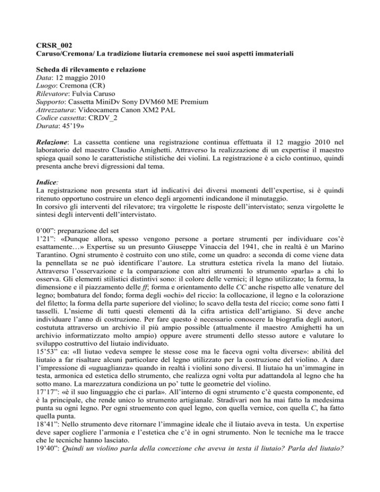 CRSR_002 Caruso/Cremona/ La tradizione liutaria cremonese nei suoi aspetti immateriali Scheda di rilevamento e relazione Data: 12 maggio 2010 Luogo: Cremona (CR) Rilevatore: Fulvia Caruso Supporto: Cassetta MiniDv Sony DVM60 ME Premium Attrezzatura: Videocamera Canon XM2 PAL Codice cassetta: CRDV_2 Durata: 45’19» Relazione: La cassetta contiene una registrazione continua effettuata il 12 maggio 2010 nel laboratorio del maestro Claudio Amighetti. Attraverso la realizzazione di un expertise il maestro spiega quail sono le caratteristiche stilistiche dei violini. La registrazione è a ciclo continuo, quindi presenta anche brevi digressioni dal tema. Indice: La registrazione non presenta start id indicativi dei diversi momenti dell’expertise, si è quindi ritenuto opportuno costruire un elenco degli argomenti indicandone il minutaggio. In corsivo gli interventi del rilevatore; tra virgolette le risposte dell’intervistato; senza virgolette le sintesi degli interventi dell’intervistato. 0’00”: preparazione del set 1’21”: «Dunque allora, spesso vengono persone a portare strumenti per individuare cos’è esattamente…» Expertise su un presunto Giuseppe Vinaccia del 1941, che in realtà è un Marino Tarantino. Ogni strumento è costruito con uno stile, come un quadro: a seconda di come viene data la pennellata se ne può identificare l’autore. La struttura estetica rivela la mano del liutaio. Attraverso l’osservazione e la comparazione con altri strumenti lo strumento «parla» a chi lo osserva. Gli elementi stilistici distintivi sono: il colore delle vernici; il legno utilizzato; la forma, la dimensione e il piazzamento delle ff; forma e orientamento delle CC anche rispetto alle venature del legno; bombatura del fondo; forma degli «ochi» del riccio: la collocazione, il legno e la colorazione del filetto; la forma della parte superiore del violino; lo scavo della testa del riccio; come sono fatti I tasselli. L’nsieme di tutti questi elementi dà la cifra artistica dell’artigiano. Si deve anche individuare l’anno di costruzione. Per fare questo è necessario conoscere la biografia degli autori, costututa attraverso un archivio il più ampio possible (attualmente il maestro Amighetti ha un archivio informatizzato molto ampio) oppure avere strumenti dello stesso autore e valutare lo sviluppo costruttivo del liutaio individuato. 15’53” ca: «Il liutao vedeva sempre le stesse cose ma le faceva ogni volta diverse»: abilità del liutaio a far risaltare alcuni particolare del legno utilizzato per la costruzione del violino. A dare l’impressione di «uguaglianza» quando in realtà i violini sono diversi. Il liutaio ha un’immagine in testa, armonica ed estetica dello strumento, che realizza ogni volta pur adattandola al legno che ha sotto mano. La marezzatura condiziona un po’ tutte le geometrie del violino. 17’17”: «è il suo linguaggio che ci parla». All’interno di ogni strumento c’è questa componente, ed è la principale, che rende unico lo strumento artigianale. Stradivari non ha mai fatto la medesima punta su ogni legno. Per ogni struemento con quel legno, con quella vernice, con quella C, ha fatto quella punta. 18’41”: Nello strumento deve ritornare l’immagine ideale che il liutaio aveva in testa. Un expertise deve saper cogliere l’armonia e l’estetica che c’è in ogni strumento. Non le tecniche ma le tracce che le tecniche hanno lasciato. 19’40”: Quindi un violino parla della concezione che aveva in testa il liutaio? Parla del liutaio? «Esattamente.» Il violino ci dice che cosa vedeva il liutaio in quel momento. Per ottenere una serie di effetti aveva dei condizionamenti esterni e delle intenzionalità interne. Possiamo ripercorrere le fasi di vita dei liutai a seconda delle architetture dei loro strumenti. Nelle simmetrie e nelle asimmetrie. Stradivari alla fine della sua vita vedeva male e ha fatto ff sempre più asimmetriche. 21’30”: «É difficile per me spiegare tutto questo però al momento attuale la scienza ci ha dato veramente un grande ausilio...» grazie alla diffusione delle conoscenze e alla creazione dei database con le informazioni sui liutai e i loro strumenti. Però la competenza di un liutaio che fa una valutazione non può essere sostituita da una macchina. Sono i suoi occhi, la competenza su una fetta della storia della liuteria. Lui conosce bene gli italiani, soprattutto quelli di determinate scuole e periodi. I dati sono talmente tanti che non si può ricordare tutto. 23’44”: «Lo strumento parla e noi dobbiamo soltanto ascoltarlo, ma devo conoscere il suo linguaggio», e quello lo posso fare solo attraverso lo studio di altri strumenti. 24’35”: Una volta individuata la famiglia di liutai tutto diventa facile perché nessuna famiglia ha avuto più di 12 liutai. 25’04”: E non può essere semplicemente che qualcuno ha copiato uno stile? È difficile non scoprire che è una copia. Prima di tutto c’è la stagionatura del legno, e poi riuscire a riprendere tutti i dettagli è impossibile. Inoltre se non si seguono esattamente i procedimenti di costruzione non verrà fuori un violino identico. Anche lo spessore della vernice, i dettagli di lavorazione, l’incollaggio. Se uno ha una buona conoscenza dei violini non si lascia ingannare. 26’00”: discussione su come procedere nel video e spiegazioni del video ufficiale. 27’44”: mi piacerebbe se ci fosse qualche fare, perché hai raccontato molto e fatto poco. Mi piacerebbe riprendere mentre lavori. 28’20”: «Quando si analizza uno strumento una delle cose da verificare sono i filetti.» Spiega cosa sono a cosa servono e perché sono identificativi. 29’10”: analisi dei filetti del violino che sta valutando. Mentre lo fa, spiega. 29’30”: anche l’interno è molto importante, lo andremo a guardare con una luce flessibile.... Questo permette di avere altre informazioni utili sul violino che si analizza. 30’08”: «poi c’è i