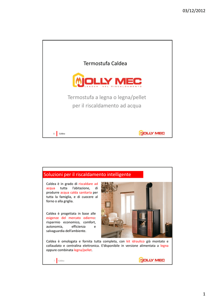 03/12/2012 Termostufa Caldea Termostufa a legna o legna/pellet per il riscaldamento ad acqua per il riscaldamento ad acqua 1 Caldea Soluzioni per il riscaldamento intelligente Caldea è in grado di riscaldare ad acqua tutta l’abitazione, di produrre acqua calda sanitaria per tutta la famiglia, e di cuocere al forno o alla griglia. Caldea è progettata in base alle esigenze del mercato odierno: risparmio economico, comfort, autonomia, efficienza e salvaguardia dell dell’ambiente. ambiente. Caldea è omologata e fornita tutta completa, con kit idraulico già montato e collaudato e centralina elettronica. E’disponibile in versione alimentata a legna oppure combinata legna/pellet. 2 Caldea 1 03/12/2012 Riscaldare ad acqua con CALDEA Con Caldea hai un calore costante e omogeneo in tutte le stanze. Caldea infatti può riscaldare un’abitazione fino a 300 m2, anche su più piani, e produrre tutta l’acqua calda sanitaria che serve a soddisfare le esigenze della tua famiglia. 3 Caldea Prodotti a legna/pellet Caldea Base Acciaio inox satinato Caldea Caldaia Caldea Lusso Rame Acciaio inox Scotch Brite Rame Brunito Acciaio verniciato Prodotti a legna Caldea Base Acciaio inox satinato 4 Caldea Caldaia Caldea Lusso Rame Brunito Acciaio inox satinato Rame Brunito Caldea Camino Acciaio verniciato Caldea 2 03/12/2012 Tutta la potenza sotto controllo Grazie al controllo modulare automatico della potenza è possibile riscaldare dalla singola stanza all’intera abitazione mantenendo sempre la temperatura desiderata. Legna Pellet Legna Legna 26,80 kW Legna 26,80 kW Pellet 22,89 kW Valori riferiti alla potenza nominale del prodotto 5 Caldea Adatte ad ogni superficie La potenza dell’impianto va tarata sulla base delle dimensioni e delle caratteristiche della superficie da riscaldare, in modo da garantire il calore necessario all’abitazione. Costruzioni prima del 1975 Basso Isolamento Costruzioni 1975‐2005 Medio Isolamento Costruzioni dopo 2005 Alto Isolamento 6 Superficie riscaldabile 130 mq Superficie riscaldabile 200 mq Superficie riscaldabile 300 mq Caldea 3 03/12/2012 La sicurezza nell’acquisto Ritorno investimento in breve tempo • Riscaldare con Caldea consente, con la legna, un risparmio fino al 60% rispetto al costo del gas e fino al 40% con il pellet. E’ possibile beneficiare inoltre della detrazione pellet. E possibile beneficiare inoltre della detrazione fiscale del 50% o del 55%. Passaggio automatico legna‐pellet • Caldea assicura una lunga autonomia grazie all’alimentazione combinata legna‐pellet a passaggio automatico. Prodotti sicuri e garantiti • Le termostufe Jolly Mec sono affidabili e sicure perché certificate a livello europeo. 7 Caldea La sicurezza nell’acquisto Acqua calda a costo zero • I prodotti ad acqua non solo riscaldi tutta la tua abitazione, ma puoi avere tutta l’acqua calda sanitaria che serve a soddisfare le esigenze della tua famiglia. soddisfare le esigen e della tua famiglia. Cucina sana • Con Caldea puoi cucinare alla griglia, nel forno in terraccotta o sulla piastra radiante usando lo stesso calore con cui riscaldi la tua casa. 8 Caldea 4 03/12/2012 Un cuore tecnologico Superficie tradizionale Sistema onduling: triplo rendimento e combustione controllata e prolungata Questo sistema fa sì che la superficie di scambio esposta al fuoco venga triplicata, aumentando il rendimento e ottenendo una combustione controllata e prolungata. Superficie ondulata Superficie ondulata Caldo Control Caldea ld d dispone d CaldoControl, di ld l un sistema brevettato di regolazione e controllo automatico della combustione. CaldoControl ottimizza il consumo della legna in modo da bruciarne solo la quantità necessaria a raggiungere la temperatura richiesta. 9 Caldea Componenti che fanno la differenza Centralina di controllo La centralina elettronica, in dotazione ai prodotti combinati, gestisce il funzionamento del termocamino sia a legna che a p pellet. Tramite il cronotermostato incorporato, regola in automatico l’accensione e lo spegnimento del pellet, se necessario anche quando la legna si esaurisce (al richiamo del termostato caldaia). Piano Fuoco Il piano fuoco è progettato per consentire il veloce passaggio dall’alimentazione a legna a quella pellet o viceversa. 10 Caldea Stufe a pellet: Techna, Arte e Classe 5 03/12/2012 Fornita completa Bruciatore pellet Caldealegna/pellet dispone di un bruciatore innovativo, brevettato, con carica dal basso. La quantità di pellet erogata sarà sempre quella giusta per una carica e combustione ottimali. Kit idraulico Caldea viene fornita di serie con il kit idraulico a vaso chiuso già montato e collaudato pronta per l’installazione. 11 Caldea Continua innovazione Aria primaria Caldea è dotata di tubo d’aria comburente collegabile direttamente con l’esterno per garantire una corretta combustione e non alterare i ricambi di ossigeno all’interno d ll’ bi t dell’ambiente. Forno e scaldavivande Caldea è accessoriata con forno, funzionante anche a termostufa spenta, e di una piastra radiante in acciaio. Trasporto per alimentazione pellet Tutti i modelli ad alimentazione combinata legna e pellet sono dotati di un serbatoio pellet di serie tuttavia, per ottenere un’autonomia a piacere è possibile abbinare un contenitore di capacità maggiore. 12 Caldea 6 03/12/2012 Capaci di soddisfare ogni esigenza Regolazione della temperatura preferita Possono funzionare in manuale o in automatico. Si imposta la temperatura che si vuole raggiungere nel locale e la stufa aumenta la potenza per raggiungerla, raggiungerla stabilizzandosi quindi al minimo per mantenerla. Operazioni di pulizia ridotte al minimo Grazie alla perfetta combustione le operazioni di pulizia sono ridotte al minimo. Salvaguardia dell’ambiente La perfetta combustione rende performante la stufa: resa maggiore, consumo minore e salvaguardia dell’ambiente con l’utilizzo di un combustibile completamente rinnovabile. 13 Caldea Sicurezza e af