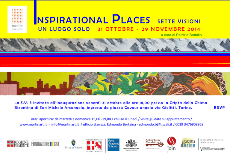 INSPIRATIONAL UN LUOGO SOLO P LACES SETTE VISIONI 31 OTTOBRE - 29 NOVEMBRE 2014 a cura di Patrizia Bottallo L a S . V. è in v it a t a a l l ’ in a u g u r a z io n e v e n er d ì 3 1 o t t o b r e a l l e o r e 1 8 , 0 0 p r es s o l a C r ip t a d el l a Ch ie s a B iz a n t in a d i S a n M ic h e l e A r c a n g el o , in g r e s s o d a p ia z z a Ca v o u r a n g o l o v ia G io l it t i, T o r in o . RSVP orari apertura: da martedì a domenica 15,00 -19,00 / chiuso il lunedì / visite guidate su appuntamento / www.martinart.it - [email protected] / ufficio stampa: Edmondo Bertaina - [email protected] / 0039 3476908968 la mostra è inserita nel circuito