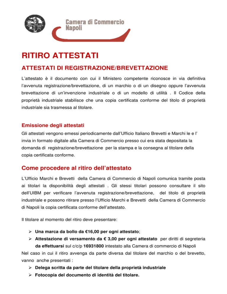 RITIRO ATTESTATI ATTESTATI DI REGISTRAZIONE/BREVETTAZIONE L’attestato è il documento con cui il Ministero competente riconosce in via definitiva l’avvenuta registrazione/brevettazione, di un marchio o di un disegno oppure l’avvenuta brevettazione di un’invenzione industriale o di un modello di utilità . Il Codice della proprietà industriale stabilisce che una copia certificata conforme del titolo di proprietà industriale sia trasmessa al titolare. Emissione degli attestati Gli attestati vengono emessi periodicamente dall’Ufficio Italiano Brevetti e Marchi le e l’ invia in formato digitale alla Camera di Commercio presso cui era stata depositata la domanda di registrazione/brevettazione per la stampa e la consegna al titolare della copia certificata conforme. Come procedere al ritiro dell’attestato L’Ufficio Marchi e Brevetti della Camera di Commercio di Napoli comunica tramite posta ai titolari la disponibilità degli attestati . Gli stessi titolari possono consultare il sito dell’UIBM per verificare l’avvenuta registrazione/brevettazione, del titolo di proprietà industriale e possono ritirare presso l’Ufficio Marchi e Brevetti della Camera di Commercio di Napoli la copia certificata conforme dell’attestato. Il titolare al momento del ritiro deve presentare: Una marca da bollo da €16,00 per ogni attestato; Attestazione di versamento da € 3,00 per ogni attestato per diritti di segreteria da effettuarsi sul c/c/p 16931800 intestato alla Camera di commercio di Napoli Nel caso in cui il ritiro avvenga da parte diversa dal titolare del marchio o del brevetto, vanno anche presentati : Delega scritta da parte del titolare della proprietà industriale Fotocopia del documento di identità del titolare. Il ritiro può avvenire presso l’ Ufficio Marchi e Brevetti della Camera di Commercio di Napoli stanza B 21. L’attestato, previa richiesta scritta, potrà anche essere spedito dall’Ufficio Brevetti e Marchi mediante lettera raccomandata con avviso di ricevimento. In tal caso alla richiesta dovrà essere allegata, oltre alla marca da bollo da € 16,00, anche l’attestazione del versamento di € 3,00 + il costo della raccomandata come rimborso spese per la spedizione, effettuato sul c/c n. 16931800 intestato a Camera di Commercio di Napoli indicando nella causale: invio attestato di registrazione marchio o brevetto. Una volta effettuata la consegna, la Camera di Commercio non potrà più rilasciarne ulteriori copie conformi dell’attestato che andranno invece richieste direttamente all’U.I.B.M.( Ufficio Italiano Brevetti e Marchi). Nonostante le misure semplificative in materia di “autocertificazione”, i certificati di marchi e brevetti non possono essere sostituiti da altro documento e pertanto l’autocertificazione relativa agli attestati non è ammessa. LE TARIFFE (Decreto Ministeriale del 2.04.2007 – G.U. n° 81 del 6.04.2007) AVVERTENZA Le copie brevettuali possono essere richieste: • Direttamente in sede (via di S.Basilio n.14 Roma) dalle ore 9.30 alle ore 13.30 escluso il sabato. • Per posta, al seguente indirizzo: Ufficio Italiano Brevetti e Marchi – ufficio G2 - via Molise 19 00187 Roma. • Per Fax al seguente numero 06 47887779 DIRITTI e TARIFFE 1. Diritti di segreteria per la richiesta di copie autentiche ,estratti e copie semplici per ogni singolo fascicolo di ogni tipologia di titolo di proprietà industriale : € 3,00 2. Tariffe per l’attività di fotocopiatura o riproduzione per singolo fascicolo suddivisa per tipologia di titolo di proprietà industriale: Invenzione industriale Modello di utilità o ornamentale Disegno o modello multiplo a colori Disegno o modello multiplo in bianco e nero Disegno o modello a colori Disegno o modello in bianco e nero Marchio di impresa a colori Marchio di impresa in bianco e nero Nuova varietà vegetale Topografia a semiconduttore Certificato complementare di protezione Traduzione di brevetto europeo Atto o documento non previsto € 4,00 € 2,00 € 10,00 € 4,00 € 6,00 € 2,00 € 2,00 € 1,00 € 2,00 € 2,00 € 1,00 € 4,00 € 2,00 3. Le copie possono essere riprodotte sia dal fascicolo cartaceo che dal sistema informatico e sono fornite, a richiesta, su supporto cartaceo o su CD- ROM ed ove possibile inviate per e-mail. La documentazione può essere ritirata presso l’Ufficio Italiano Brevetti e marchi o inviata tramite servizio postale, per fax, se non supera 15 pagine ed, ove possibile, via e-mail. Nel caso di invio della documentazione da parte dell’Ufficio gli importi di cui sopra sono maggiorati, per ogni fascicolo, come segue: per la trasmissione in Italia a mezzo servizio postale per la trasmissione all’estero a mezzo servizio postale per la trasmissione in Italia a mezzo fax per la trasmissione nell’Unione Europea a mezzo fax Per la trasmissione in paesi extra Unione Europea € 10,00 € 50,00 € 15,00 € 70,00 € 300,00