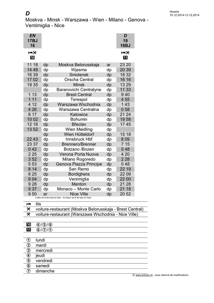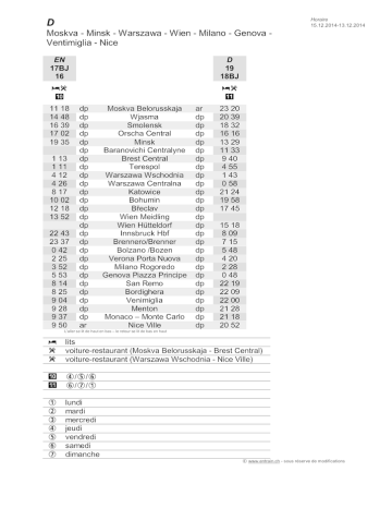 Horaire 15.12.2014-13.12.2014 D Moskva - Minsk - Warszawa - Wien - Milano - Genova Ventimiglia - Nice EN 17BJ 16 D 19 18BJ yr "+ yr ", 11 18 14 48 16 39 17 02 19 35 1 13 1 11 4 12 4 26 8 17 10 02 12 18 13 52 22 43 23 37 0 42 2 25 3 52 5 53 8 14 8 25 9 04 9 28 9 37 9 50 dp dp dp dp dp dp dp dp dp dp dp dp dp dp dp dp dp dp dp dp dp dp dp dp dp dp ar Moskva Belorusskaja Wjasma Smolensk Orscha Central Minsk Baranovichi Centralyne Brest Central Terespol Warszawa Wschodnia Warszawa Centralna Katowice Bohumin Břeclav Wien Meidling Wien Hütteldorf Innsbruck Hbf Brennero/Brenner Bolzano /Bozen Verona Porta Nuova Milano Rogoredo Genova Piazza Principe San Remo Bordighera Venimiglia Menton Monaco – Monte Carlo Nice Ville ar dp dp dp dp dp dp dp dp dp dp dp dp dp dp dp dp dp dp dp dp dp dp dp dp dp dp 23 20 20 39 18 32 16 16 13 29 11 33 9 40 4 55 1 43 0 58 21 24 19 58 17 45 15 18 8 09 7 15 5 48 4 20 2 28 0 48 22 19 22 09 22 00 21 28 21 18 20 52 L'aller se lit de haut en bas – le retour se lit de bas en haut ω r r lits voiture-restaurant (Moskva Belorusskaja - Brest Central) voiture-restaurant (Warszawa Wschodnia - Nice Ville) "+ ", Ψ/Ζ/[ [/∴/ς ς Ω Ξ Ψ Ζ [ ∴ lundi mardi mercredi jeudi vendredi samedi dimanche T www.entrain.ch - sous réserve de modifications