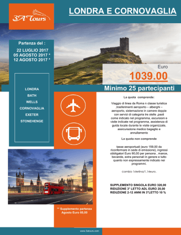 LONDRA E CORNOVAGLIA Partenza del : 22 LUGLIO 2017 05 AGOSTO 2017 * 12 AGOSTO 2017 * Euro 1039.00 Minimo 25 partecipanti LONDRA BATH La quota comprende: WELLS Viaggio di linea da Roma n classe turistica ,trasferimenti aeroporto – alberghi – aeroporto, sistemazione in camere doppie con servizi di categoria tre stelle ,pasti come indicato nel programma, escursioni e visite indicate nel programma, assistenza di guida locale durante le visite organizzate, assicurazione medico bagaglio e annullamento CORNOVAGLIA EXETER STONEHENGE La quota non comprende tasse aeroportuali (euro 159,00 da riconfermare in sede di emissione), ingressi obbligatori Euro 90,00 per persona , mance, bevande, extra personali in genere e tutto quanto non espressamente indicato nei programmi. cambio 1sterlina/1,14euro. SUPPLEMENTO SINGOLA EURO 320,00 RIDUZIONE 3° LETTO ADL EURO 20,00 RIDUZIONE 2-12 ANNI IN 3°LETTO 10 % ** Supplemento partenza Agosto Euro 60,00 www.3atours.com T PROGRAMMA DI VIAGGIO Giorno 1 - Londra Partenza con voli di linea da Roma Fiumicino e arrivo a Londra . Trasferimento in Hotel . Giornata a dispozione , cena libera e pernottamento. Giorno 2 - Londra –Bath – Wells Prima colazione in hotel. Partenza per Bath. La cittá di origini romane offre siti architettonici tra i piu’ interessanti d’Europa. Visita dei Roman Bath, le antiche terme attorno alla quale nacque la cittá. Pranzo libero. Partenza per Wells per visita della Wells Cathedral, perfetto esempio di costruzione in stile gotico primitivo. Al termine delle visite, sistemazione in hotel, cena e pernottamento. Giorno 3 - Glastonbury – Cornovaglia: Tintagel Prima colazione in hotel. Partenza per Glastonbury e visita della abbazia, dove si crede che l’evangelizzatore San Giuseppe d’ Arimetea abbia portato il Santo Graal. Proseguimento per la Cornovaglia, la penisola sud-occidentale dell’Inghilterra famosa per i panorami mozzafiato e patria fiabesca delle leggende del re Artú e dei cavalieri della tavola Rotonda. Pranzo libero in itinerario. Visita di Tintagel Castle, la mitica Camelot, luogo natale del celebre eroe. Arrivo in serata in zona Plymouth. Sistemazione in hotel, cena e pernottamento. Giorno 4-Cornovaglia: Lanhydrock, Looe, Polperro Prima colazione in hotel. Partenza per Lanhydrock House, splendino palazzo nobialiare realizzato in granito ed ardesia risalente al XVII secolo ed immerso in un parco di 450 acri, 22 dei quali ospitano i famosi giardini all’ italiana. Pranzo libero. Proseguimento per Looe e Polperro, caratteristici paesini di pescatori dalle tipiche case costruite sui pendii delle insenature che si affacciano sulle spiagge naturali di sabbia bianca. Rientro in albergo, cena e pernottamento. Giorno 5 – Cornovaglia: St Michael Mount, St Ives Prima colazione in hotel. Partenza per la visita del celebre St. Michael Mount, per visita del monastero benedettino fondato nel XI secolo da Edoardo il Confessore. Il promontorio durante l’alta marea si trasforma in un isolotto raggiungibile solo in barca*. Pranzo libero. Si Prosegue per St Ives, da sempre residenza preferita dei piú famosi artisti del XVIII secolo. I suoi labirintici vicoli sono pieni di vita ed offrono scorci suggestivi ed artgianato locale. Al termine delle visite, rientro in hotel, cena e pernottamento. * Costo in loco £ 2.5 per persona Giorno 6 – Exeter, Stonehenge Prima colazione in hotel. Partenza per Exeter, principale centro del Devon di origini romane. Visita della Exeter Cathedral, risalente all’epoca normanna. Proseguimento per Stonehenge, situato nella stupenda campagna dello Wiltshire. Visita del celebre monumento megalitico, che mantiene un grande alone di mistero e di magia. Al termine delle visite, trasferimento in hotel, cena e pernottemento. Giorno 7 – Londra Prima colazione in hotel. Partenza per Londra. All’ arrivo, visita della cittá. Si vedranno la sede del Parlamento ed il Big Ben, l’Abbazia di Westminster, la Cattedrale di Westminster, Trafalgar Square, Piccadilly Circus e Buckingham Palace. Pranzo libero. Nel pomeriggio proseguimento della visita con la City, il centro finanziario di Londra per eccellenza. Attraverso Fleet Street, la strada dei giornali , si raggiungeranno la Cattedrale di S. Paul, la Banca d’Inghilterra e il London Bridge e infine il Tower Bridge e la Torre di Londra. Al termine, trasferimento in hotel. Cena libera e pernottamento. www.3atours.com Giorno 8: Londra/Italia Prima Colazione in hotel. Rilascio delle camere entro le h 11:00. Tempo libero a disposizione per attivitá individuali. Transferimenti in aereoporto. SI PREGA DI NOTARE CHE L’ORDINE DEL TOUR PUO’ ESSERE INVERTITO MANTENENDO GLI STESSI SERVIZI *Si ricorda che la disponibilità di hotel centrali a Edimburgo sarà limitata nel mese di agosto www.3atours.com