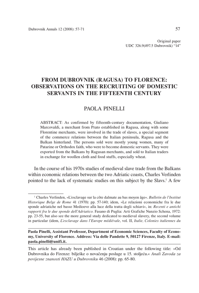 57 Dubrovnik Annals 12 (2008): 57-71 Original paper UDC 326.9(497.5 Dubrovnik) “14” FROM DUBROVNIK (RAGUSA) TO FLORENCE: OBSERVATIONS ON THE RECRUITING OF DOMESTIC SERVANTS IN THE FIFTEENTH CENTURY PAOLA PINELLI ABSTRACT: As confirmed by fifteenth-century documentation, Giuliano Marcovaldi, a merchant from Prato established in Ragusa, along with some Florentine merchants, were involved in the trade of slaves, a special segment of the commerce relations between the Italian peninsula, Ragusa and the Balkan hinterland. The persons sold were mostly young women, many of Patarine or Orthodox faith, who were to become domestic servants. They were exported from the Balkans by Ragusan merchants, and sold to Italian traders in exchange for woollen cloth and food stuffs, especially wheat. In the course of his 1970s studies of medieval slave trade from the Balkans within economic relations between the two Adriatic coasts, Charles Verlinden pointed to the lack of systematic studies on this subject by the Slavs.1 A few 1 Charles Verlinden, ≈L’esclavage sur la côte dalmate au bas moyen âge«. Bulletin de l’Institut Historique Belge de Rome 41 (1970): pp. 57-140; idem, ≈Le relazioni economiche fra le due sponde adriatiche nel basso Medioevo alla luce della tratta degli schiavi«, in: Recenti e antichi rapporti fra le due sponde dell’Adriatico. Fasano di Puglia: Arti Grafiche Nunzio Schena, 1972: pp. 23-55, but also see the more general study dedicated to medieval slavery, the second volume in particular (idem, L’esclavage dans l’Europe médiévale, vol. II, Italie, Colonies italiennes du Paola Pinelli, Assistant Professor, Department of Economic Sciences, Faculty of Economy, University of Florence. Address: Via delle Pandette 9, 50127 Firenze, Italy. E-mail: [email protected]. This article has already been published in Croatian under the following title: ≈Od Dubrovnika do Firenze: biljeπke o novaËenju posluge u 15. stoljeÊu.« Anali Zavoda za povijesne znanosti HAZU u Dubrovniku 46 (2008): pp. 65-80. 58 Dubrovnik Annals 12 (2008) years later, historians tended to shift the focus of their attention to this theme, especially Bariπa KrekiÊ, who published some articles on Ragusa as an intermediary market for this type of trade.2 In 1988 Sergio Anselmi promoted a book which contained essays on the migration of Slavs and Albanians to the West from the fourteenth to the sixteenth century3 and, in 1989, the same subject was dealt within a volume with several articles published in Belgrade.4 These studies are based on the documents found in the archives of Dubrovnik,5 Levant, Levant latin, Empire byzantin. Gent: Faculteit van de Letteren en Wijsbegeerte, 1977: pp. 712-799). For the Slavic studies which Verlinden most frequently refers to, see especially Boæidar PetranoviÊ, ≈O robstvu po srbskim spomenicima i statutima primorskih dalmatinskih gradova«. Rad Jugoslavenske akademije znanosti i umjetnosti (hereafter cited as: JAZU) 16 (1871): pp. 5976; Aleksandar Solovjev, ≈Trgovanje bosanskim robljem do godine 1661«. Glasnik Zemaljskog muzeja u Sarajevu 1 (1946): pp. 139-162; Gregor »remoπnik, ≈Pravni poloæaj naπeg roblja u srednjem veku«. Glasnik Zemaljskog muzeja u Sarajevu 2 (1947): pp. 69-74; idem, ≈Izvori za istoriju roblja i servicijalnih odnosa u naπim zemljama srednjega veka«. Istorisko-pravni zbornik 2 (1949): pp. 148-159; Vuk Vinaver, ≈Trgovina bosanskim robljem tokom XIV veka u Dubrovniku«. Anali Historijskog Instituta u Dubrovniku 2 (1953): pp. 125-149; idem, ≈Ropstvo u starom Dubrovniku (1250-1650)«. Istorijski pregled 1 (1954): pp. 37-43. It should be noted, however, that the studies of Verlinden are based on: Istoriski spomenici DubrovaËkog arhiva. Kancelarijski i notarski spisi 1278-1301, ed. Gregor »remoπnik. Beograd: Srpska akademija nauka i umetnosti (hereafter cited as: SANU), 1932; Spisi dubrovaËke kancelarije, I. Zapisi notara Tomazina de Savere 12781282, ed. Gregor »remoπnik. Zagreb: JAZU, 1951; Iz DubrovaËkog arhiva, vol. III, ed. Mihailo DiniÊ. Beograd: SANU, 1967; Antonio Teja, ≈Aspetti della vita economica di Zara dal 1289 al 1409. II: La schiavitù domestica ed il traffico degli schiavi«. Rivista dalmatica 22 (1941): pp. 2038. 2 Bariπa KrekiÊ, ≈Contributo allo studio degli schiavi levantini e balcanici a Venezia (13881398)«, in: Studi in memoria di Federigo Melis, vol. II. Napoli: Giannini, 1978: pp. 379-394; idem, ≈L’abolition de l’esclavage à Dubrovnik (Raguse) au XVe siècle: mythe ou réalité?«. Byzantinische Forschungen 12 (1987): pp. 309-317; idem, ≈Dubrovnik as a pole of attraction and a point of transition for the hinterland population in the late Middle Ages«, in: Migrations in Balkan history, ed. Dimitrije DjordjeviÊ. Beograd: SANU, 1989: pp. 67-75. 3 Italia felix. Migrazioni slave e albanesi in Occidente. Romagna, Marche, Abruzzi secoli XIV-XVI, ed. Sergio Anselmi. [Quaderni di Proposte e ricerche, vol. III]. Ancona: Tecnostampa Edizioni, 1988. 4 Migrations in Balkan history. This volume was preceded by another miscellaneous set of papers, Migracije Slovanov v Italijo. Le migrazioni degli Slavi in Italia, ed. Ferdo Gestrin. Ljubljana, 1978 and was accompanied and later followed by numerous Italian and Slavic studies dealing with the migration of these populations to Italy. In this regard, see the extensive bibliography offered by Ferdo Gestrin, ≈Le migrazioni degli slavi in Italia nella storiografia jugoslava«, in: Italia felix: p. 264, note 14, already published with a few changes in Migracije, and in Quaderni storici 40 (1979): pp. 7-30 - which, however, ends by the end of the 1980s. 5 Much of the medieval and modern documentation from the archives in Dubrovnik has been published by Mihailo DiniÊ. Concerning the subject of this paper, see especially Iz DubrovaËkog arhiva III. P. Pinelli, From Dubrovnik (Ragusa) to Florence... 59 Venice and other cities on the east coast of Italy. Actually, a