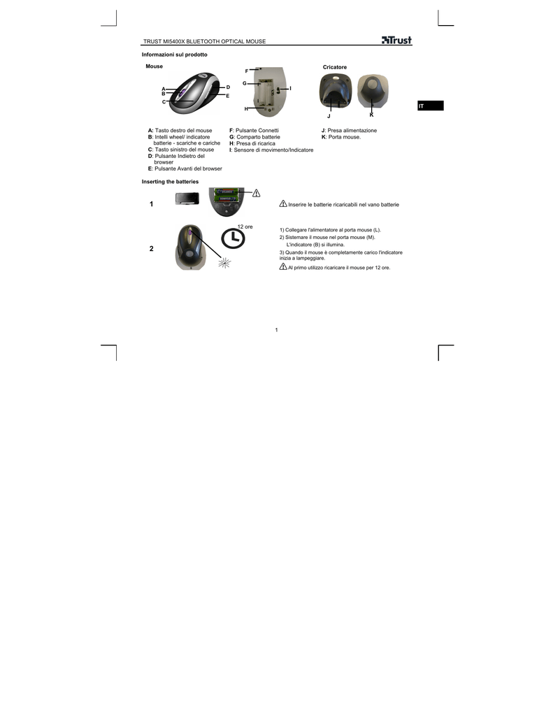 TRUST MI5400X BLUETOOTH OPTICAL MOUSE Informazioni sul prodotto Mouse A B Cricatore F D G I E C IT H J A: Tasto destro del mouse B: Intelli wheel/ indicatore batterie - scariche e cariche C: Tasto sinistro del mouse D: Pulsante Indietro del browser E: Pulsante Avanti del browser F: Pulsante Connetti G: Comparto batterie H: Presa di ricarica I: Sensore di movimento/Indicatore K J: Presa alimentazione K: Porta mouse. Inserting the batteries 1 Inserire le batterie ricaricabili nel vano batterie 12 ore 1) Collegare l'alimentatore al porta mouse (L). 2) Sistemare il mouse nel porta mouse (M). L'indicatore (B) si illumina. 2 3) Quando il mouse è completamente carico l'indicatore inizia a lampeggiare. Al primo utilizzo ricaricare il mouse per 12 ore. 1 TRUST MI5400X BLUETOOTH OPTICAL MOUSE Creare una connessione con il mouse Bluetooth Utilizzare un mouse diverso o la tastiera (tasti ALT, TAB, Invio, CTRL) per creare una connessione Bluetooth. Le seguenti istruzioni forniscono una descrizione generale delle modalità di creazione di una connessione con il mouse Bluetooth. Per maggiori informazioni consultare il manuale fornito con l'adattatore Bluetooth o con altri dispositivi Bluetooth. Rendere il mouse rilevabile per la connessione Bluetooth. 1 1 1) 2 2) 3) Tenere premuto il pulsante Connetti (F) per 3 secondi. L'indicatore (I) si illumina in modo continuo. Il mouse è ora rilevabile per la connessione Bluetooth. 2 Avviare il software Bluetooth. 3 Il software Bluetooth inizia la ricerca dei dispositivi. 4 Il software rileva il mouse Bluetooth. 5 Connettere il mouse Bluetooth. 6 Il mouse è pronto all'uso. 2 TRUST MI5400X BLUETOOTH OPTICAL MOUSE Modificare le opzioni del mouse 1 Fare clic su “Start - Pannello di controllo” (‘Start – Control Panel’). IT "Stampanti ed altri hardware" (Printers and Other hardware). 2 Per Windows 2000, Windows ME e Windows 98 SE, fare clic su ‘Mouse’ e continuare dal punto 4. 3 Fare clic su "Mouse". 1 2 4 Modificare la velocità del puntatore. 3 TRUST MI5400X BLUETOOTH OPTICAL MOUSE Installare il software del mouse/consultare il manuale di istruzioni 1 Inserire il CD-ROM nel lettore CD-ROM. 1) 2 2) Fare clic su "Install software " e seguire le istruzioni visualizzate. Fare clic su " Read the manua" per consultare il manuale di istruzioni. Accorgimenti Collegamento wireless di scarsa qualità Presenza di oggetti metallici vicino o tra i dispositivi. Le batterie sono (pressoché) scariche. Planarità o colore di certe superfici (ad esempio superficie rossa, morbida o irregolare). Vicinanza di un altro dispositivo wireless. Max. 10 m Tecnologia wireless Bluetooth Il mouse Bluetooth può essere utilizzato con altri dispositivi Bluetooth come i notebook che dispongono di tecnologia Bluetooth integrata. Consultare il manuale di istruzioni per il collegamento con detti dispositivi. Mouse Bluetooth (Human Interface Devices). Il mouse Bluetooth supporta il profilo HID Bluetooth. 4 TRUST MI5400X BLUETOOTH OPTICAL MOUSE Utilizzo Se il pulsante Connetti (F) viene premuto, è necessario collegare nuovamente il dispositivo. Installare il software Trust Easy Configuration presente sul CD-ROM per configurare il 3°, 4° e 5° pulsante del mouse. Pulire il sensore ottico con una spazzola morbida. La schermate visualizzate durante l'installazione con Windows 2000, Windows ME o Windows 98 possono differire da quelle riportate nelle presenti istruzioni. Premere il pulsante sinistro del mouse se il dispositivo non risponde. Consultare le FAQ, i manuali e i driver aggiornati presenti su Internet al sito www.trust.com/14298 o www.trust.com/14299. Norme di sicurezza • Non aprire o riparare da soli il prodotto. • Tenere il dispositivo lontano dai liquidi, come ad esempio l'acqua. • Non gettare le batterie nel fuoco. Le batterie possono esplodere. • Non perforare le batterie. • Tenere le batterie fuori dalla portata dei bambini. • Per questo dispositivo utilizzare esclusivamente batterie ricaricabili NiMH. • Quando le batterie sono scariche, informarsi presso l'amministrazione locale per il loro corretto smaltimento. Nota: Non utilizzare mai assieme batterie già usate e batterie nuove poiché le batterie parzialmente usate possono esaurire quelle nuove. • Il presente dispositivo è conforme agli standard essenziali e alle altre normative pertinenti dei regolamenti europei applicabili. La www.trust.com/14182/ce. Dichiarazione di Conformità (DoC) può essere consultata all’indirizzo Dispositivo wireless • Il presente apparecchio senza fili funziona a una frequenza di 2,4 GHz. Esso è conforme ai requisiti essenziali e agli altri requisiti attinenti contenuti nella direttiva 1999/5/CE R&TTE e può pertanto essere utilizzato in tutti i Paesi appartenenti all'UE oltre a: RU/NO/TR/HU. Nei suddetti paesi non vi sono limitazioni per canale. Consultare la pagina www.trust.com/14298 per un elenco aggiornato dei paesi in cui è consentito l'uso dell'apparecchio. • Qualora il prodotto venga utilizzato al di fuori dei Paesi appartenenti alla UE, potrebbero vigere delle limitazioni al suo impiego. In tal caso, controllare se il prodotto è conforme alle normative locali vigenti. Frequenza: 2,440~2,4835 GHz; larghezza di banda: circa 1 MHz, potenza: 1 mW. • Esiste oggi un numero sempre maggiore di dispositivi che utilizzano la tecnologia senza fili (video, audio, computer, ecc.) e che operano all'interno della stessa gamma di frequenze del presente prodotto. È pertanto possibile che la funzionalità del presente dispositivo venga ostacolata da altri prodotti dotati di tecnologia wireless o funga essa stessa da ostacolo a quella di altri dispositivi. A questo inconveniente si può ovviare solo ed esclusivamente con il rispetto delle distanze reciproche tra i prodotti e, ove possibile, con la giusta impostazione dei canali. 5 IT TRUST MI5400X BLUETOOTH OPTICAL MOUSE • È consigliabile usare estrema cautela con i prodotti wireless nel caso in cui si porti un pacema