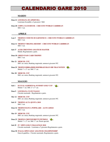MARZO Dom 21 LOUISIANA DI APERTURA Louisiana Scramble a 4 giocatori / Stbf. Dom 28 COPPA CLUB HOUSE - CIRCUITO WORLD CARIBBEAN Stbf. 3 cat. APRILE Lun 5 TROFEO COMUNE DI SARNONICO - CIRCUITO WORLD CARIBBEAN Stbf. 3 cat. . Dom 11 TROFEO VIRGINIA RESORT - CIRCUITO WORLD CARIBBEAN Stbf. 3 cat. Sab 17 ACER TRENTINO AMATEUR MASTER Medal; Regolamento a parte. Dom 18 GREEN PASS CARD TROPHY Stbf. 3 cat. Mer 21 MERCOL CUP Stbf. cat. unica; Ranking stagionale; ammessi giocatori NC. Dom 25 TROFEO BIRRA/BIER HOFBRAEUHAUS HB TRAUNSTEIN “ Medal 1° e 2° cat. Stbf. 3° cat. Mer 28 MERCOL CUP Stbf. cat. unica; Ranking stagionale; ammessi giocatori NC. MAGGIO Sab 1 ECCO & ALBERTO by SUMMIT GOLF CUP Medal 1° cat. Stbf. 2° e 3° cat. “ ,, Dom 9 LOUISIANA CLUB VIAGGI Circuito nazionale - Regolamento a parte. Mer 12 MERCOL CUP Stbf. cat. unica; Ranking stagionale; ammessi giocatori NC. Sab 15 TROFEO ALTA QUOTA 2010 Stbf. 3 cat. Dom 16 TROFEO BANCA POPOLARE - ALTO ADIGE Stbf. 3 cat. Mer 19 MERCOL CUP Stbf. cat. unica; Ranking stagionale; ammessi giocatori NC. Dom 23 TROFEO CRISTOFORETTI PETROLI “ Medal 1° e 2° cat. Stbf. 3° cat. Premi speciali. ,, Sab 29 IV° OPEN GOLF CHALLENGE 2010 Circuito nazionale - Louisiana a 5 giocatori-Regolamento a parte. Dom 30 ITALIA OPEN GOLF AMATEUR CHAMPIONSHIP Gara di qualifica - Circuito nazionale; Regolamento a parte. „ GIUGNO Mer 2 BREAK POINT FRENDLY CUP “ Medal 1° cat. Stbf. 2° e 3° cat. ,, Dom 6 MERCEDES TROPHY - AUTOINDUSTRIALE Stbf. 2 cat. Circuito con finale. Mer 9 MERCOL CUP Stbf. cat. unica; Ranking stagionale; ammessi giocatori NC. Dom 13 TROFEO CASSA DI RISPARMIO - SPARKASSE Stbf. 3 cat. Mer 16 MERCOL CUP Stbf. cat. unica; Ranking stagionale; ammessi giocatori NC. Sab 19 CENTRO PORSCHE BOLZANO – DOLOMITI GOLF CUP Stbf. 3 cat. Circuito con finale. Dom 20 2° TROFEO HOTEL VALLE DI NON Medal 1° e 2° cat. Stbf. 3° cat. “ ,, Mer 23 MERCOL CUP Stbf. cat. unica; Ranking stagionale; ammessi giocatori NC. Dom 27 TOSHIBA GOLF TOUR 2010 Stbf. 3 cat. con estrazione. Mer 30 DUCA DI VALTORTA CUP Riservata soci AGIS con Regolamento a parte. LUGLIO Sab 3 LIONS GOLF TROPHY - UILG Stbf. 2 cat. Dom 4 IRELAND GOLF TOURNAMENT by RH ALTERNATIVE Stbf. 2 cat. Circuito con finale in Irlanda; Tappa di qualifica. Mar 6 LADIES CUP 2010 Stbf. Regolamento a parte. Sab 10 CLUB VIAGGI GOLF - GOLDEN FOUR 4plm Stbf. - con finale nazionale. Dom 11 CLUB VIAGGI GOLF - ORANGE JACKET Stbf. 3 cat. con finale nazionale. Mer 14 MERCOL CUP Stbf. cat. unica; Ranking stagionale; ammessi giocatori NC. Dom 18 AUTO IKARO - BMW GOLF CUP INTERNATINAL 2010 Stbf. 3 cat. Premi ad estrazione. Circuito con finale. Gio 22 TROFEO INTERREGIONALE AGIS Stbf. 3 cat. con finale. Dom 25 ACI GOLF 2010 Stbf. 3 cat. Circuito nazionale con finale. Mer 28 MERCOL CUP Stbf. cat. unica; Ranking stagionale; ammessi giocatori NC. Sab 31 TROFEO ALTA QUOTA 2010 Stbf. 3 cat. AGOSTO Dom 1 FAI GOLF CUP 2010 Stbf. 3 cat. Gara di beneficienza. Mer 4 MERCOL CUP Stbf. cat. unica; Ranking stagionale; ammessi giocatori NC. Dom 8 IRELAND GOLF TOURNAMENT by RH ALTERNATIVE Stbf. 2 cat. Circuito con finale in Irlanda; Tappa di qualifica. Mer 11 MERCOL CUP Stbf. cat. unica; Ranking stagionale; ammessi giocatori NC. Sab 14 COPPA DEL PRESIDENTE Medal 1° e 2° cat. Stbf. 3° cat. “ ,, Dom 15 ASS. CHERNOBYL SEZ. BZ. Louisiana a 2 giocatori / gara di beneficenza Mer 18 GARA GIOVANILE KIKU CUP 2010 Medal; Valida per il Ranking nazionale. Dom 22 BANCA REALE – SOCIETA’ MUTUA DI ASSICURAZIONI – AG. TRENTO Stbf. 3 cat. Mer 25 MERCOL CUP Stbf. cat. unica; Ranking stagionale; ammessi giocatori NC. Dom 29 ITAS ASSICURAZIONI GOLF CHALLENGE - AG. CLES “ Stbf. 3° cat. Circuito nazionale con finale. ,, SETTEMBRE Mer 1 MERCOL CUP Stbf. cat. unica; Ranking stagionale; ammessi giocatori NC Dom 5 FINALE CIRCUITO “CASSE RURALI TRENTINE” TROFEO CENTRALE LEASING DEL NORD EST Stbf. 3 cat. Regolamento a parte. Mer 8 MERCOL CUP Stbf. cat. unica; Ranking stagionale; ammessi giocatori NC . Dom 12 TROFEO GIOIELLERIA RANZI - BOLZANO “ Medal 1° e 2° cat. Stbf. 3° cat. Premi speciali. ,, Mer 15 MERCOL CUP Stbf. cat. unica; Ranking stagionale; ammessi giocatori NC. Dom 19 1° COPPA JOLLY Stbf. 3 cat. Premi speciali Mer 22 MERCOL CUP Stbf. cat. unica; Ranking stagionale; ammessi giocatori NC. Sab 25 TROFEO HC EPPAN/APPIANO - INTERNORM Stbf. 3 cat. Premi speciali. Mer 29 MERCOL CUP Stbf. cat. unica; Ranking stagionale; ammessi giocatori NC. OTTOBRE Dom 3 GREEN PASS CARD TROPHY Stbf. 3 cat. Premio ad ogni buca. Mer 6 MERCOL CUP Stbf. cat. unica; Ranking stagionale; ammessi giocatori NC. Dom 10 TROFEO FREUDENSTEIN - ALPIPONT/ALPIKRAN Medal 1° e 2° cat. Stbf. 3° cat . Mer 13 MERCOL CUP Stbf. cat. unica; Ranking stagionale; ammessi giocatori NC. Dom 17 IRELAND GOLF TOURNAMENT by RH ALTERNATIVE Stbf. 2 cat. Circuito con finale in Irlanda; Tappa di qualifica. Dom 24 TROFEO HOTEL ROSA CAVARENO Stbf. 3 cat. Sab 30 CAMPIONATO SOCIALE 2010 “ ,, Medal 1° giro / cat. ospiti. Regolamento in segreteria. ,, Dom 31 CAMPIONATO SOCIALE 2010 “ Medal 2° giro / cat. ospiti. Regolamento in segreteria. NOVEMBRE Dom 7 COPPA ZABO Stbf. 3° cat. Dom 14 COPPA PRO SHOP Stbf. 3 cat. Dom 21 COPPA AUTUNNO Canada Cup/Stbf. CONDIZIONI GENERALI: Le iscrizioni alle gare si chiudono alle ore 12 del giorno precedente la data di svolgimento. La tassa d’iscrizione è comunque dovuta salvo disdetta entro il termine sopra indicato. I soci hanno precedenza all’iscrizione della singola gara, fino alle ore 12 del giorno precedente il giorno di chiusura delle iscrizioni. E’ obbligatoria la presenza dei vincitori (o un rappresentante delegato) alla cerimonia di premiazione. Nel caso di gara in corso, interrotta o sospesa per causa di forza maggiore, la Comm. Sportiva si riserva di considerare validi i risultati ottenuti sulle prime nove buche se la gara è su diciotto. Questo solo per la premiazione di giornata. 1.) I Tornei marcati con „♠„ sono validi per la class